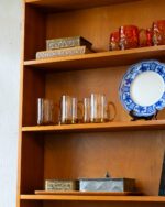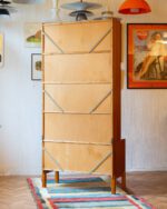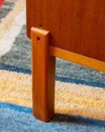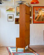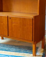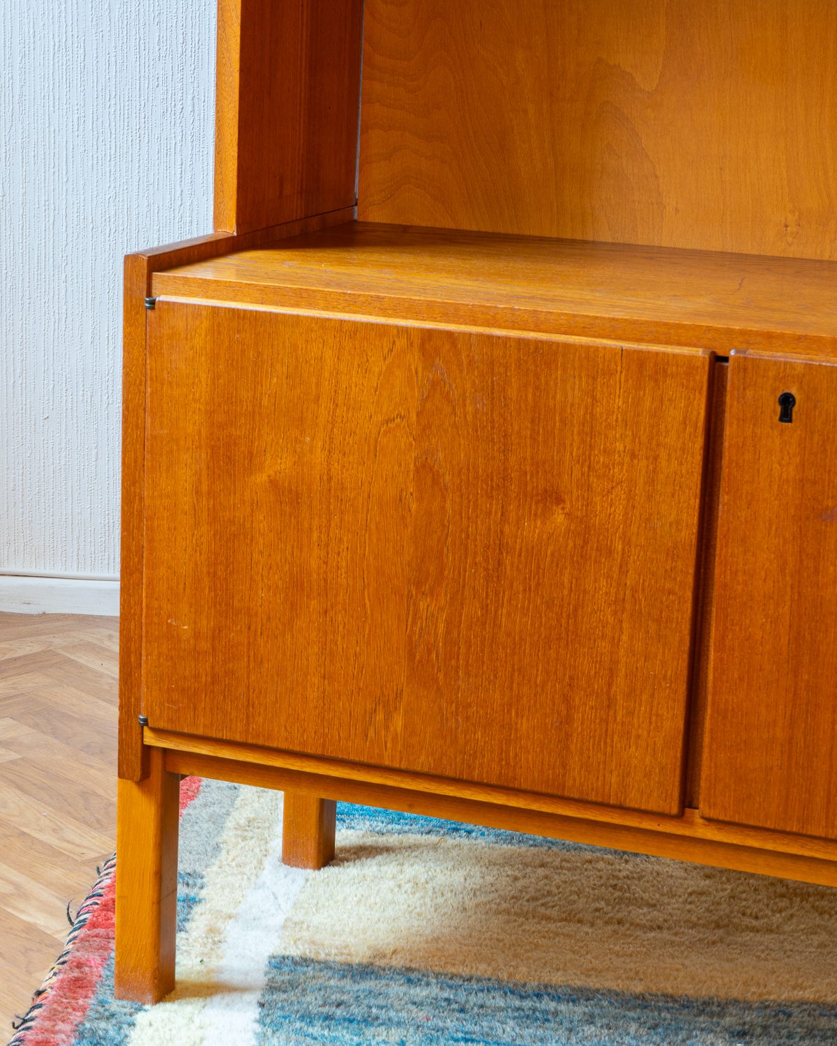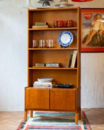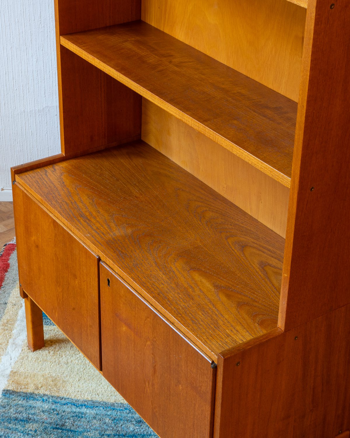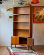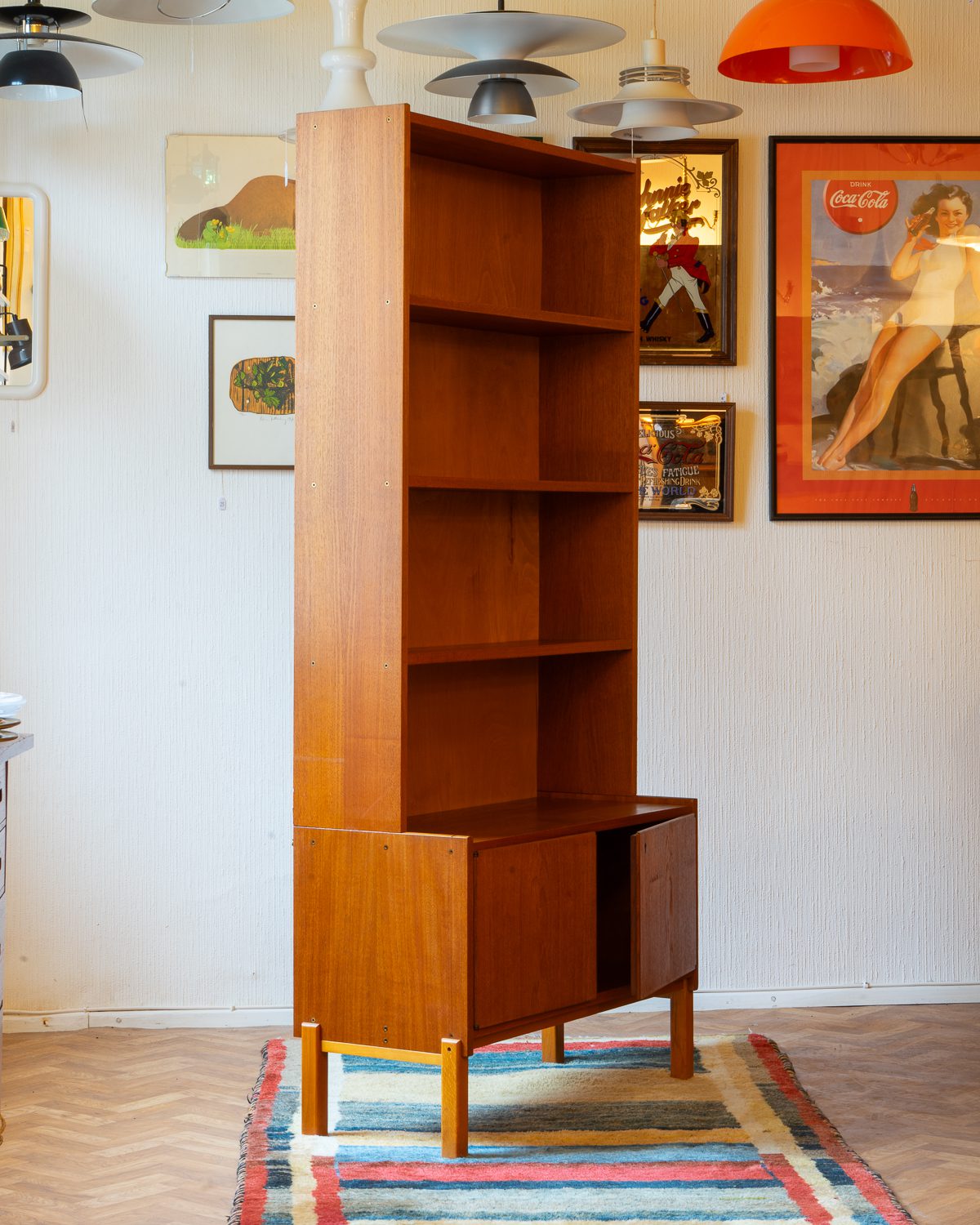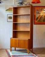 Praktiline tiigipuu spooniga raamaturiiul, millel on alumises osas kahe uksega kapiosa. Riiulite tagasein on kaetud kauni tiigipuu spooniga tagusega. Kapp on restaureeritud ja heas korras. Kaasa tuleb ka võti, kuid lukustusfunktsioon ei tööta.