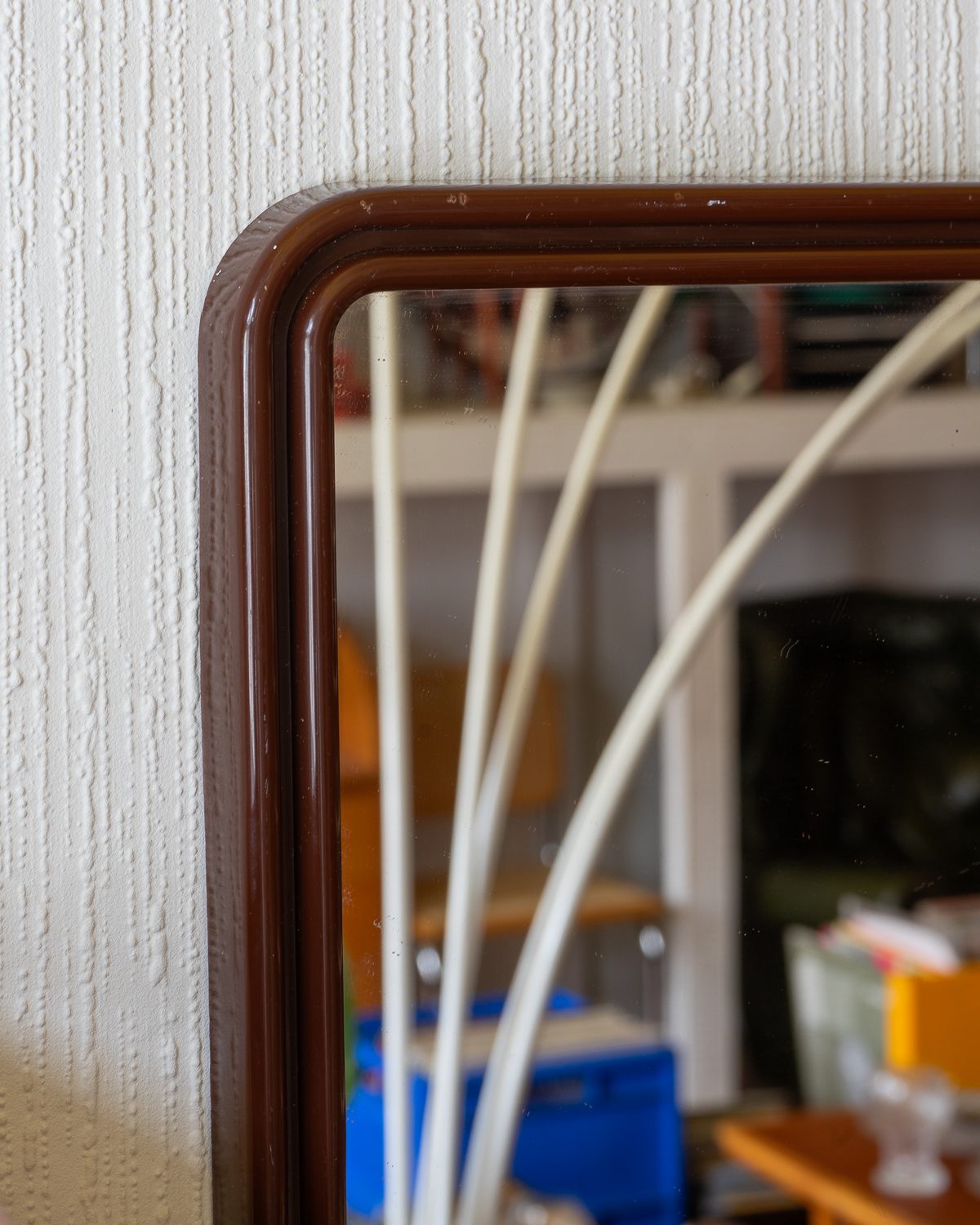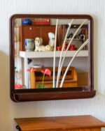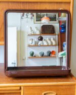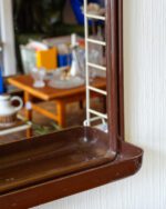 A Finnish mirror from the 1970s/1980s, manufactured by Mäkisen Kuvastin Oy. The mirror has a brown plastic frame, the lower part of which extends forward, forming a practical small shelf. The mirror surface is in good condition, the frame has slight wear.