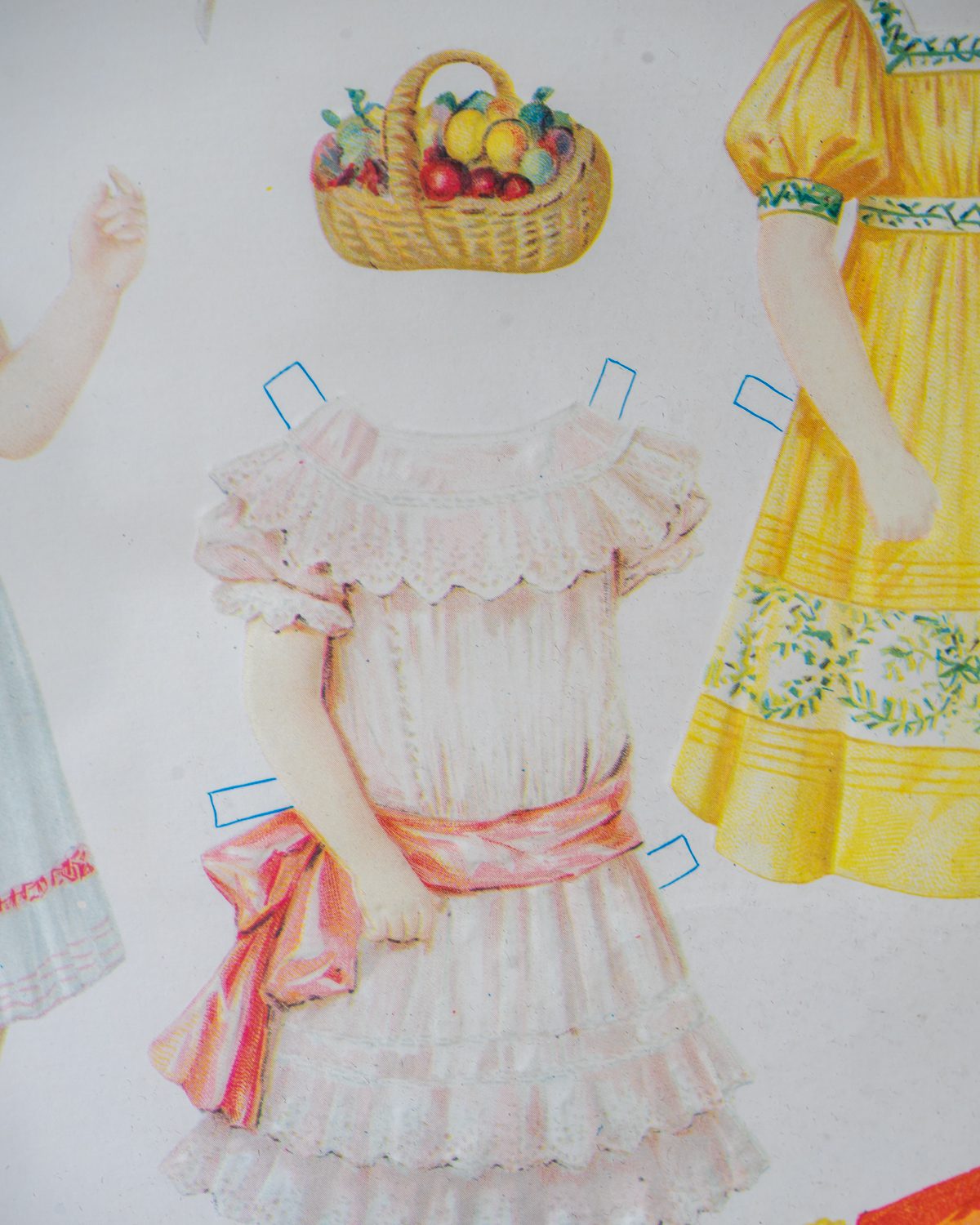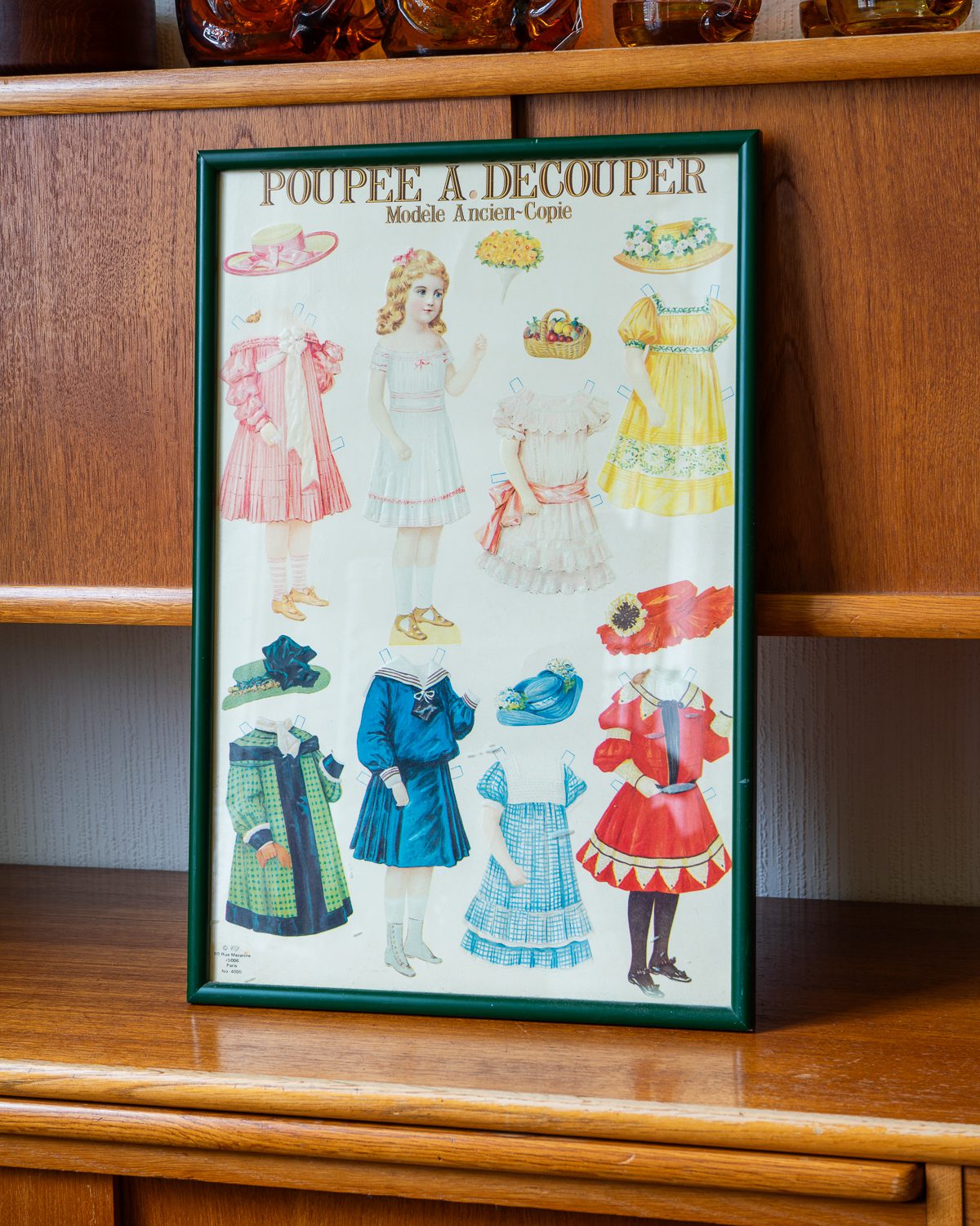 Raamitud vintage prantsuskeelne dekoratiivne väljalõigatav nuku (“Poupee A Decouper”). Plakat on raamitud rohelise puidust ning nii klaas kui ka pilt on heas korras.