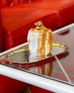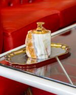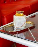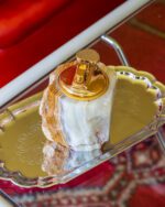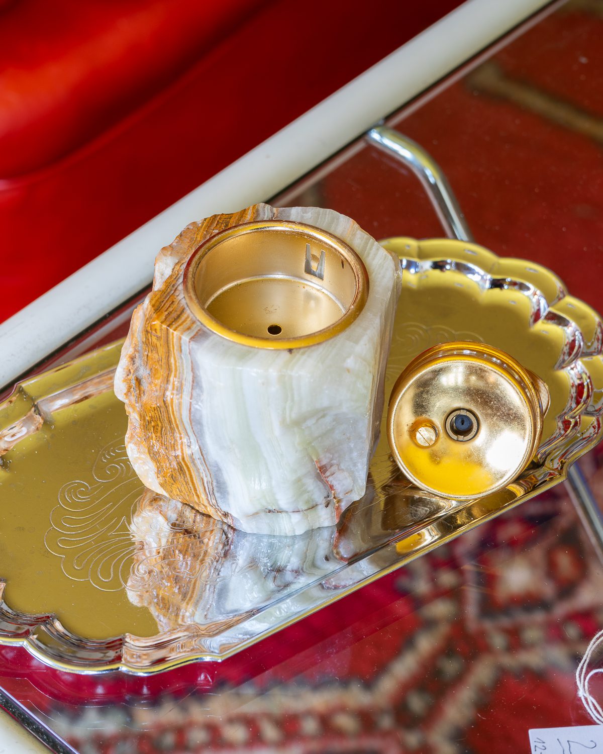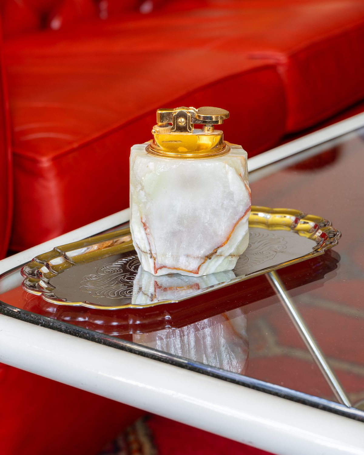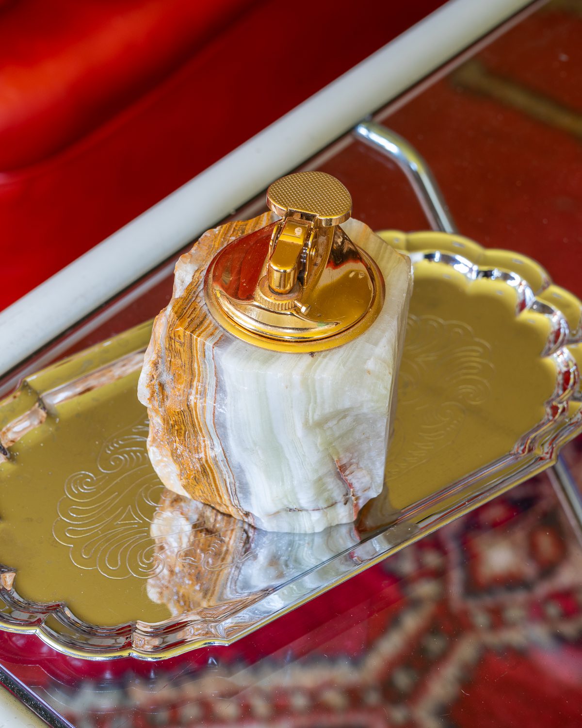 Lauapealne messingust detailide ja ahhaatkivist kehaga tulemasin. Kivi (oonüks) pärineb Pakistanist, tulemasin on valmistatud 1960ndatel Itaalias. Gaasiga testimata ning tulekivi võib vajad vahetust. Heas korras!