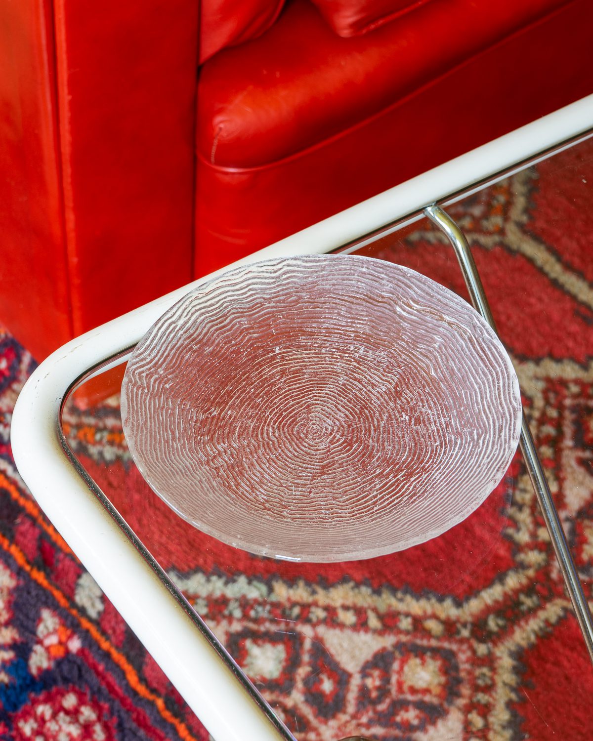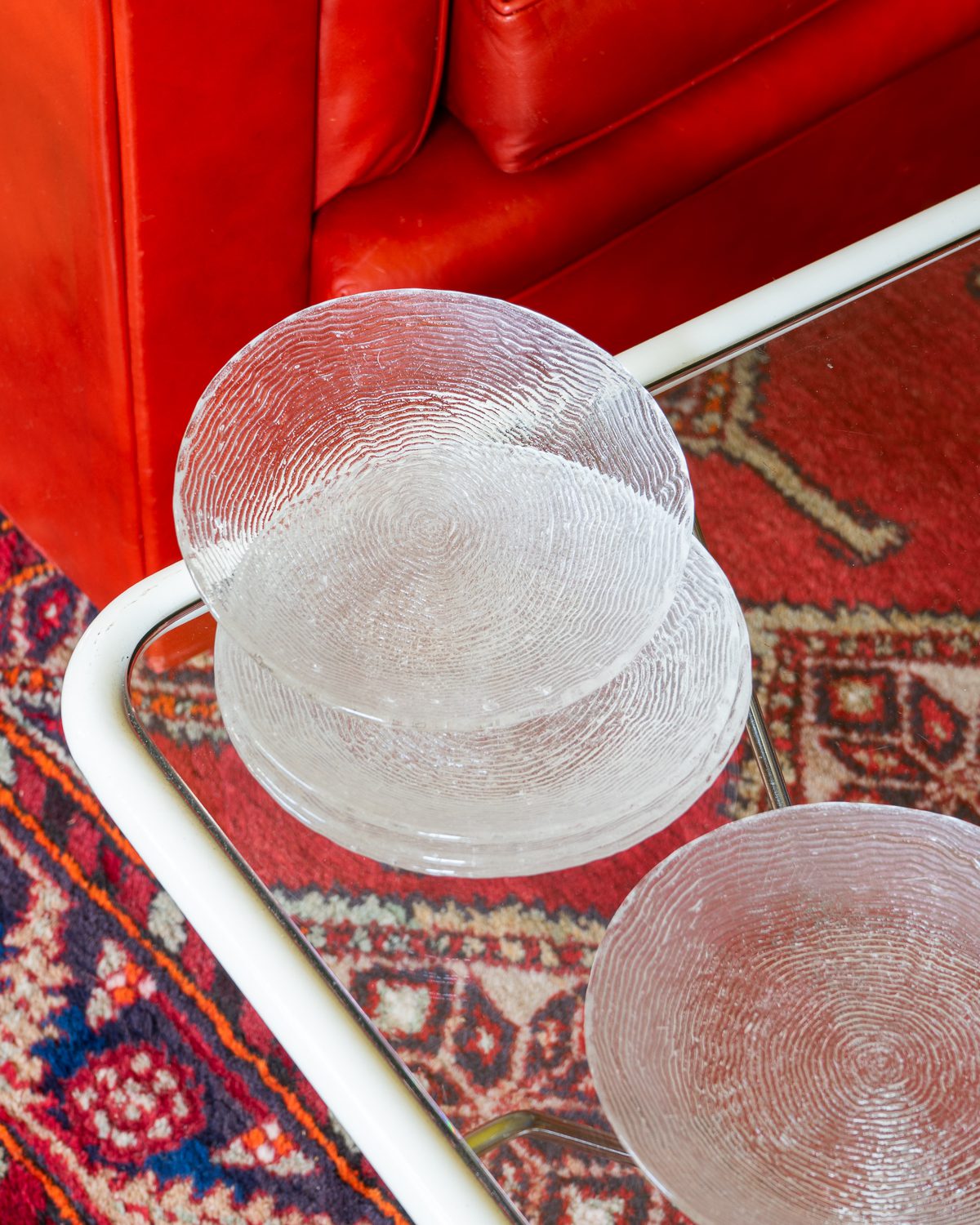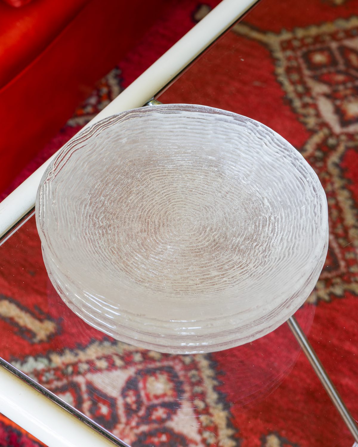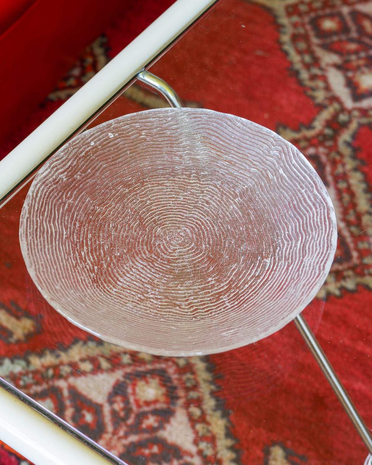 Glass cake plates with a pattern imitating the annual rings of wood. The plates have served the previous owner for a long time - there are strong signs of use on the surface. The set includes 5 plates. Frying plates from the same series (6 pcs) are also available. Manufacturer unknown.