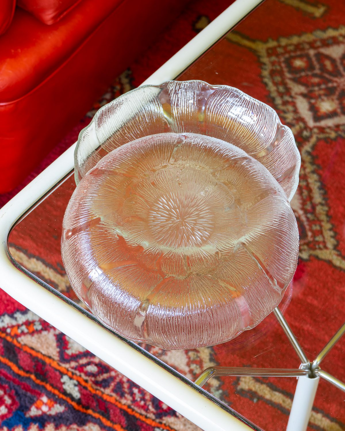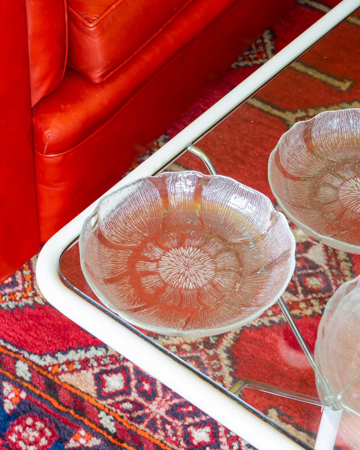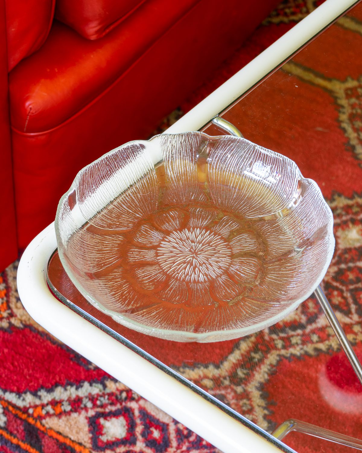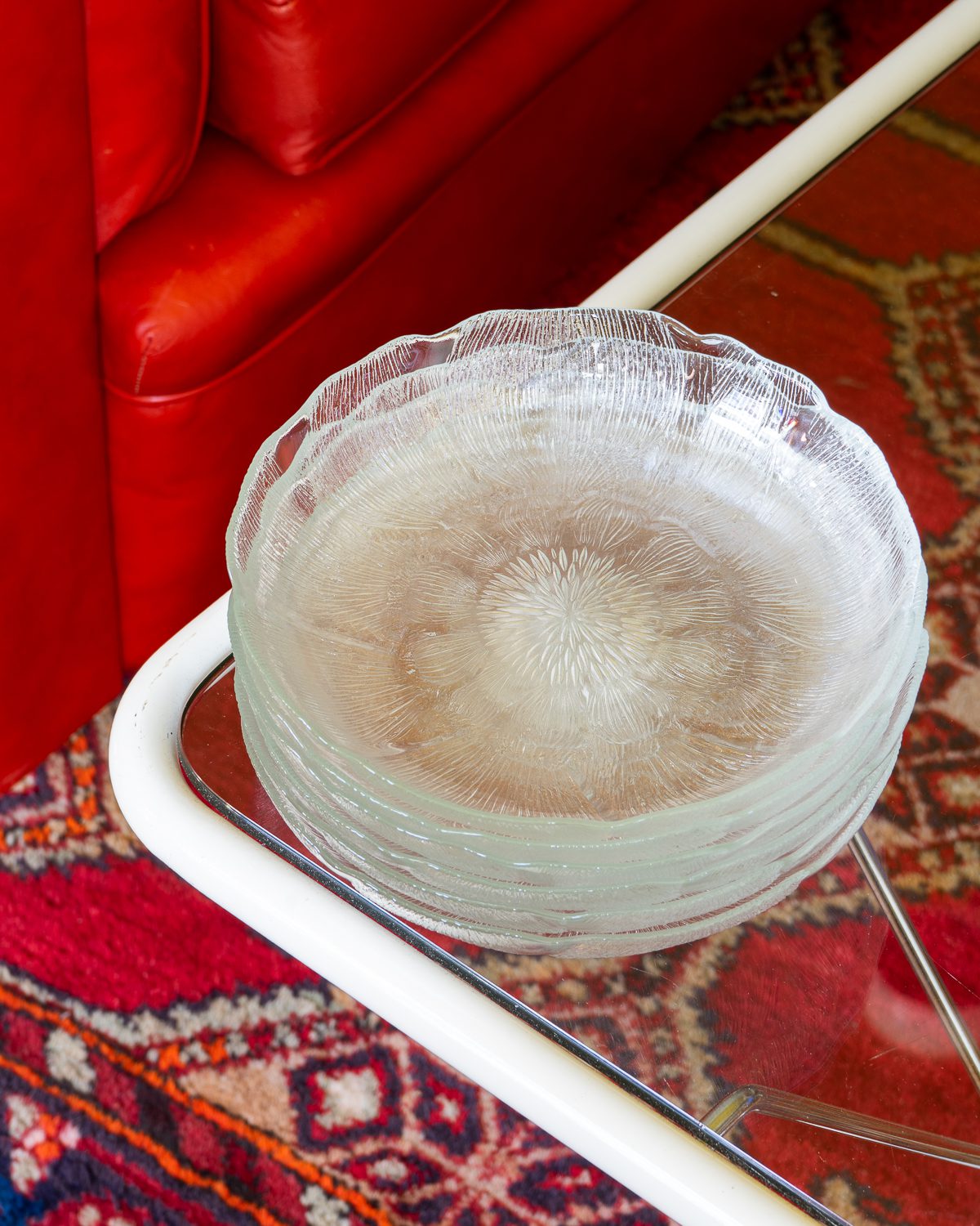 “Glass plates with high edges from the ”Fleur” series. Manufacturer Arcorc, France 1970s/80s. The plates have moderate signs of wear, otherwise in good condition.