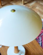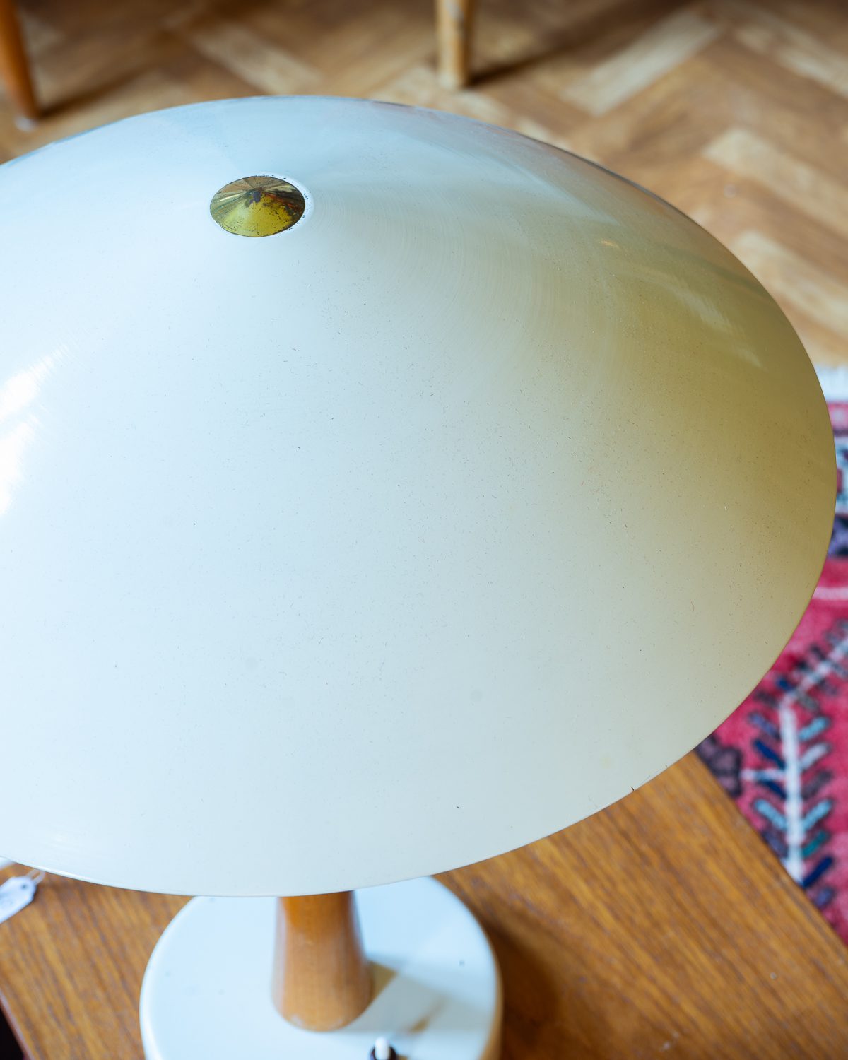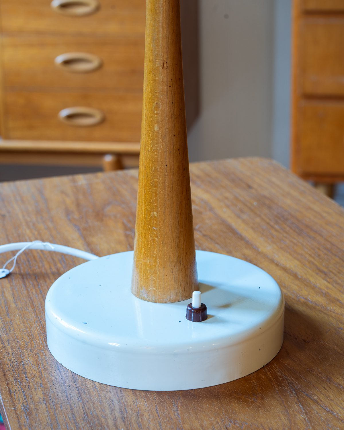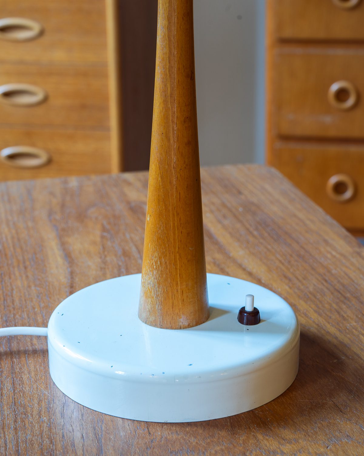 Table lamp with wooden base and metal dome and base. Made in 1973 in the Soviet Union. The wooden part has signs of wear, and some scratches and dents elsewhere. The lamp has a new cord and plug.