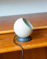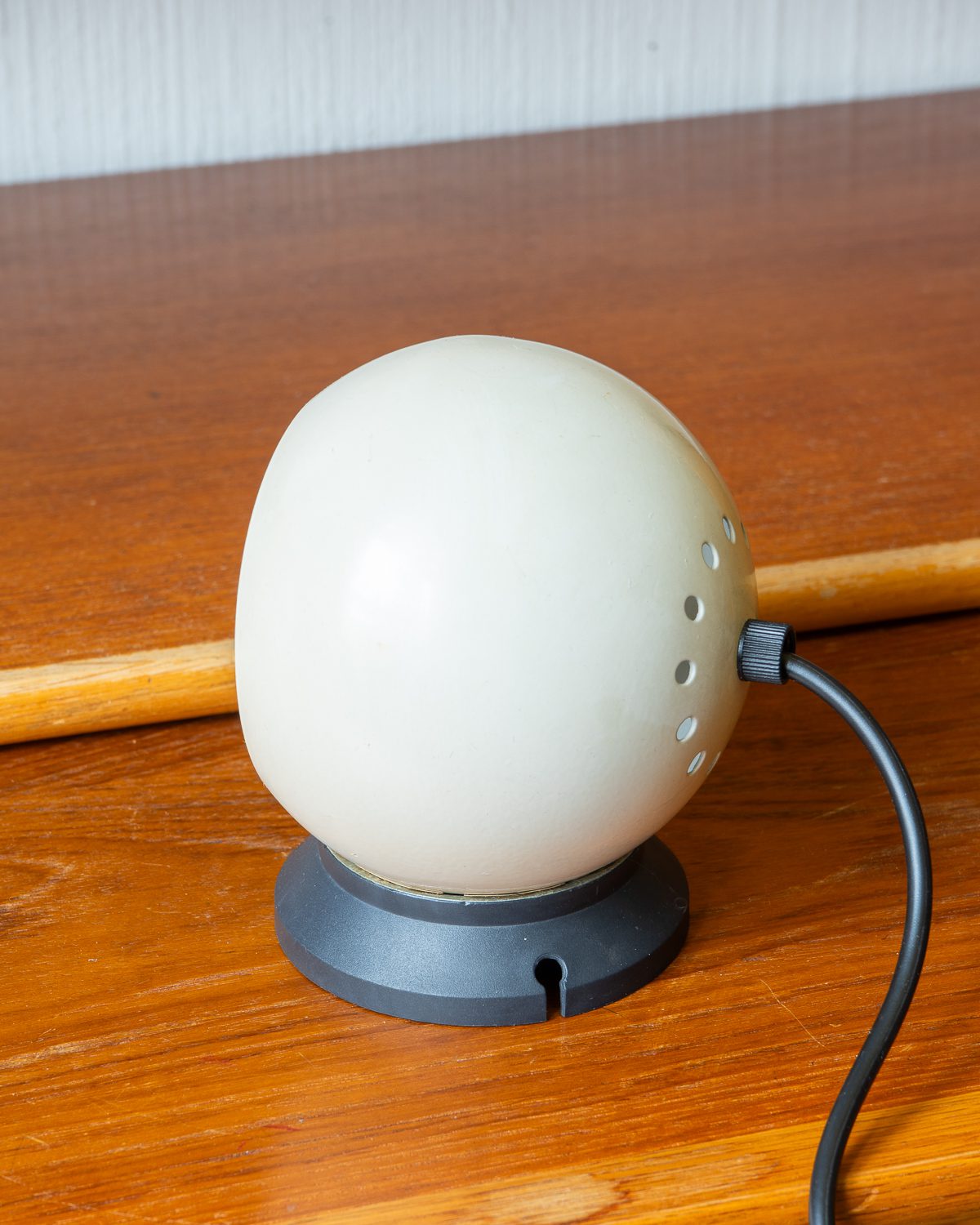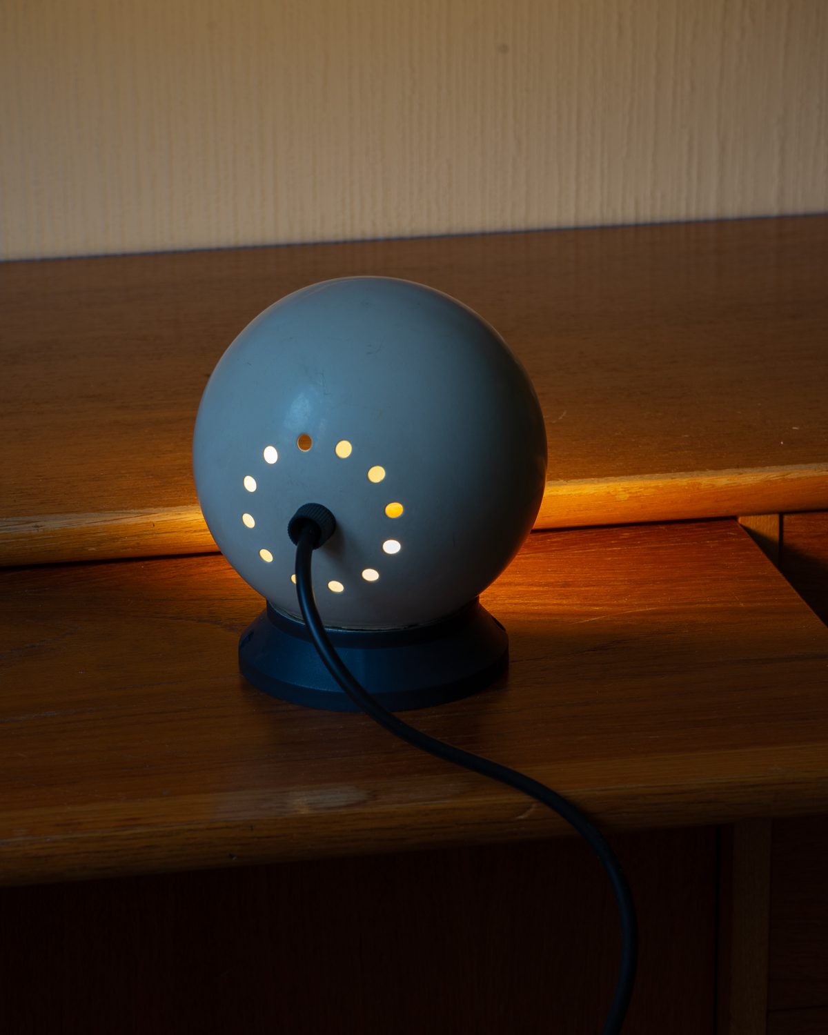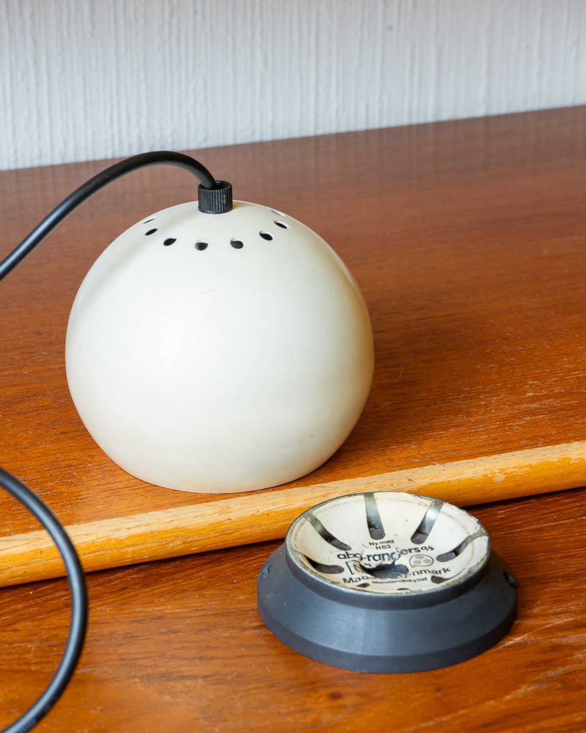 Metal wall lamp with a magnetic mount that allows you to easily direct the light. Manufacturer Abo Randers, Denmark 1960s-70s. The lamp is intended as a wall lamp, but its shape also makes it suitable as a table lamp. There are a few scratches on the surface of the lamp. The lamp has a switch.