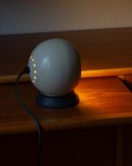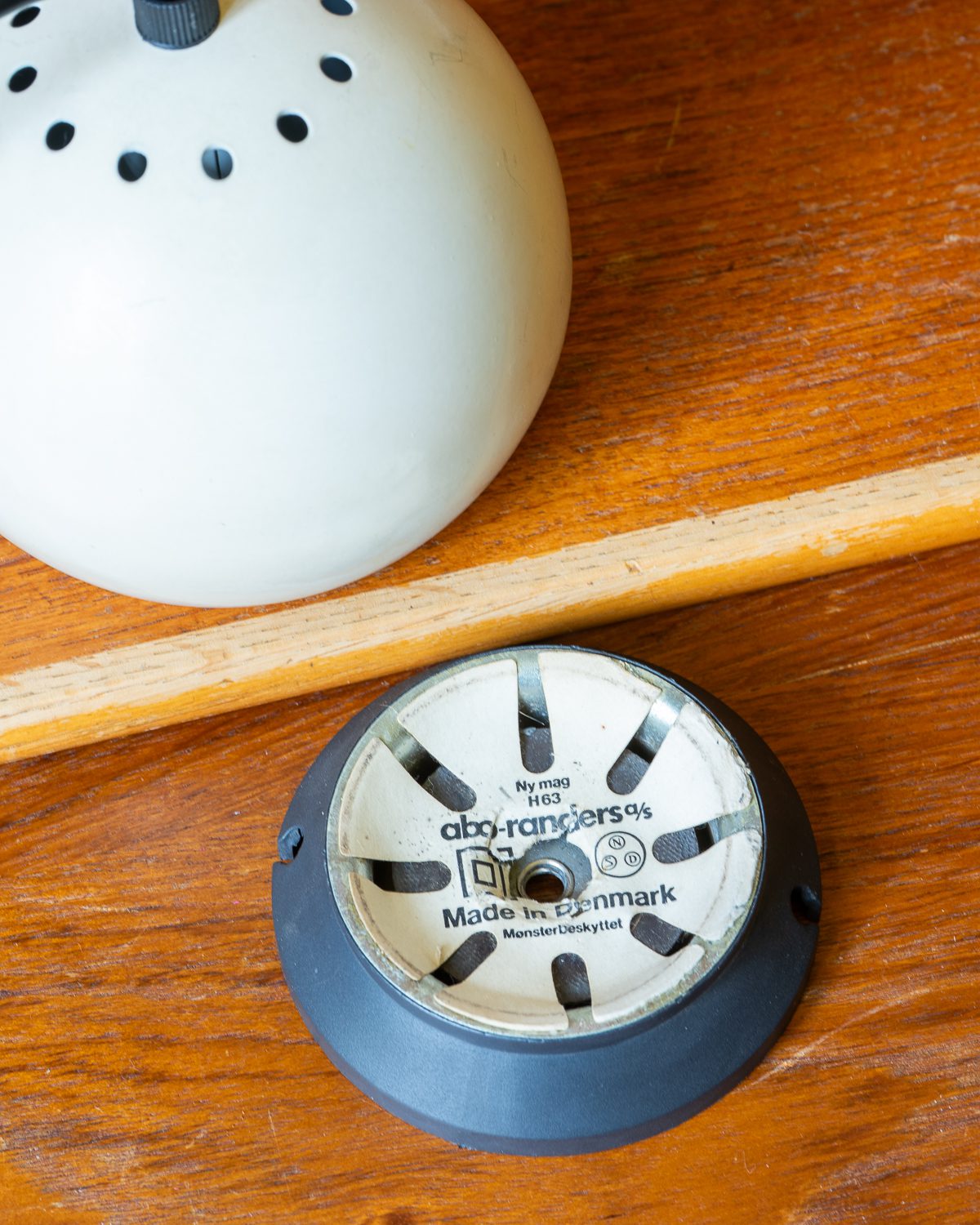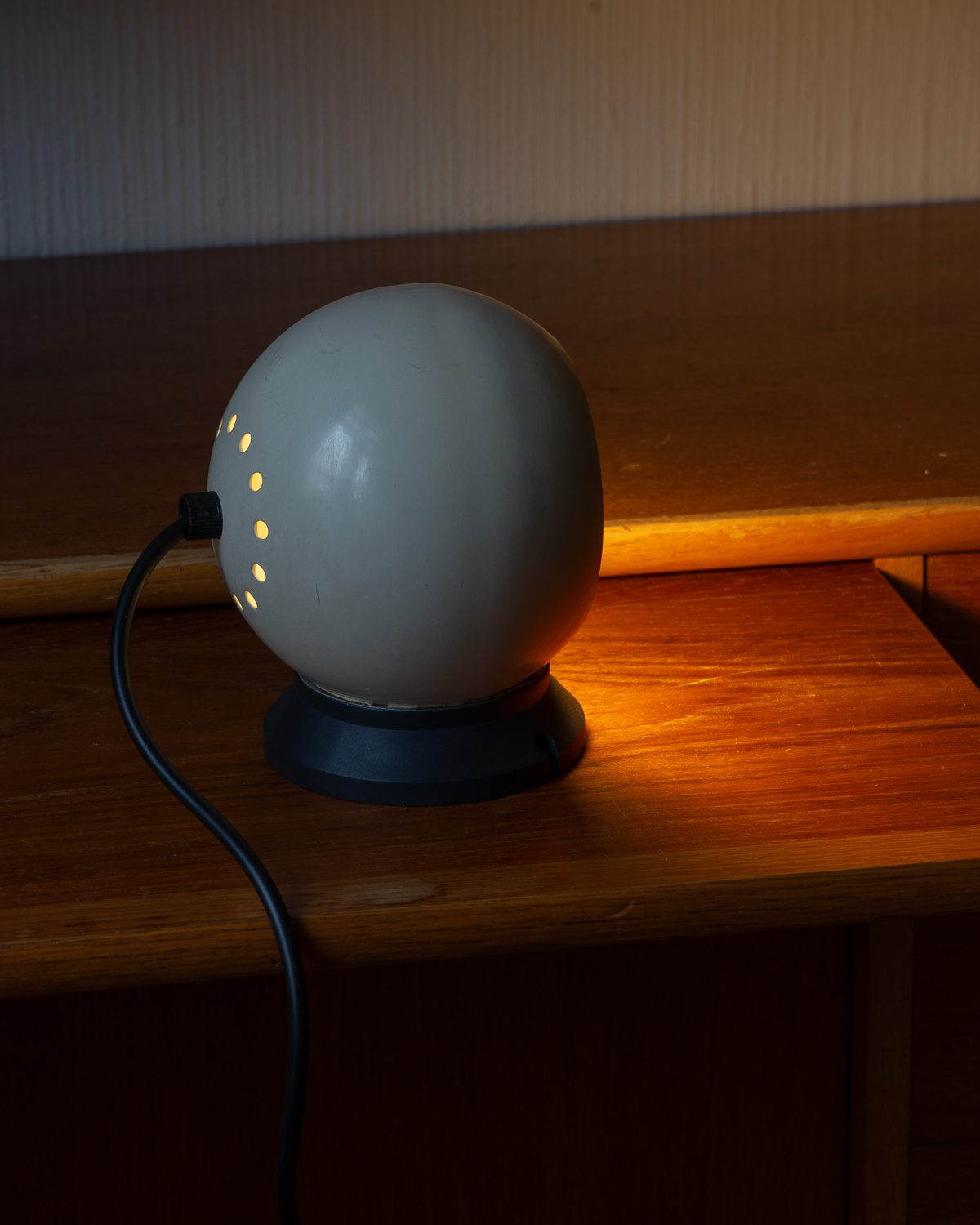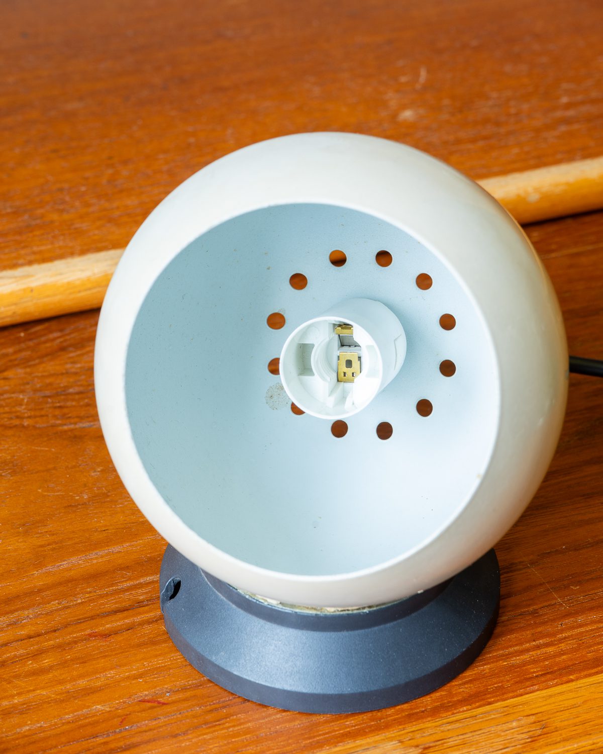Metal wall lamp with a magnetic mount that allows you to easily direct the light. Manufacturer Abo Randers, Denmark 1960s-70s. The lamp is intended as a wall lamp, but its shape also makes it suitable as a table lamp. There are a few scratches on the surface of the lamp. The lamp has a switch.
