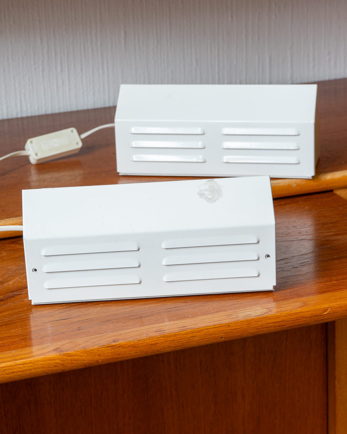 Paar 1980ndatest pärit IKEA seinalampe/voodilampe, mudel V204. Valget värvi metallist korpust täiendab plastikust võre-difuuser, mis hajutab valgust meeldivalt ja pehmelt. Tegemist on 1970. ja 1980. aastatel väga populaarse Skandinaavia disainiga, mida valmistasid samal ajal mitmed erinevad lambitootjad. Sobivad suurepäraselt nii magamistuppa lugemisvalgustiks kui ka meeleolu loomiseks. Ühel lambil on ülemisel äärel värviplekk (tõenäoliselt küünelakk). Soovi korral võib proovida seda eemaldada, kuid tuleb arvestada, et see võib kahjustada lambi originaalvärvi. Lambid on muidu heas korras.