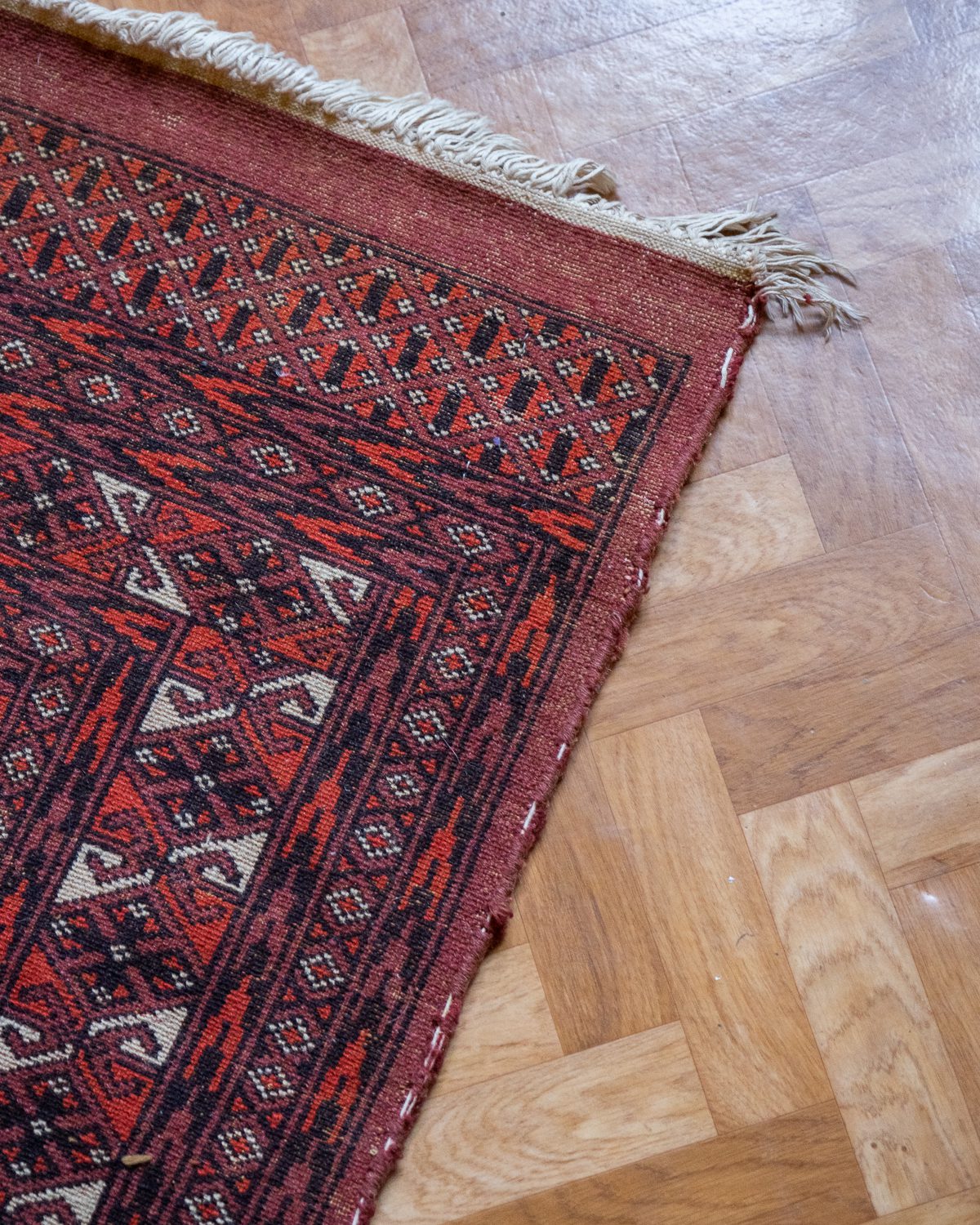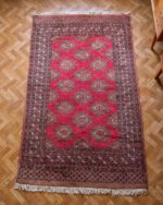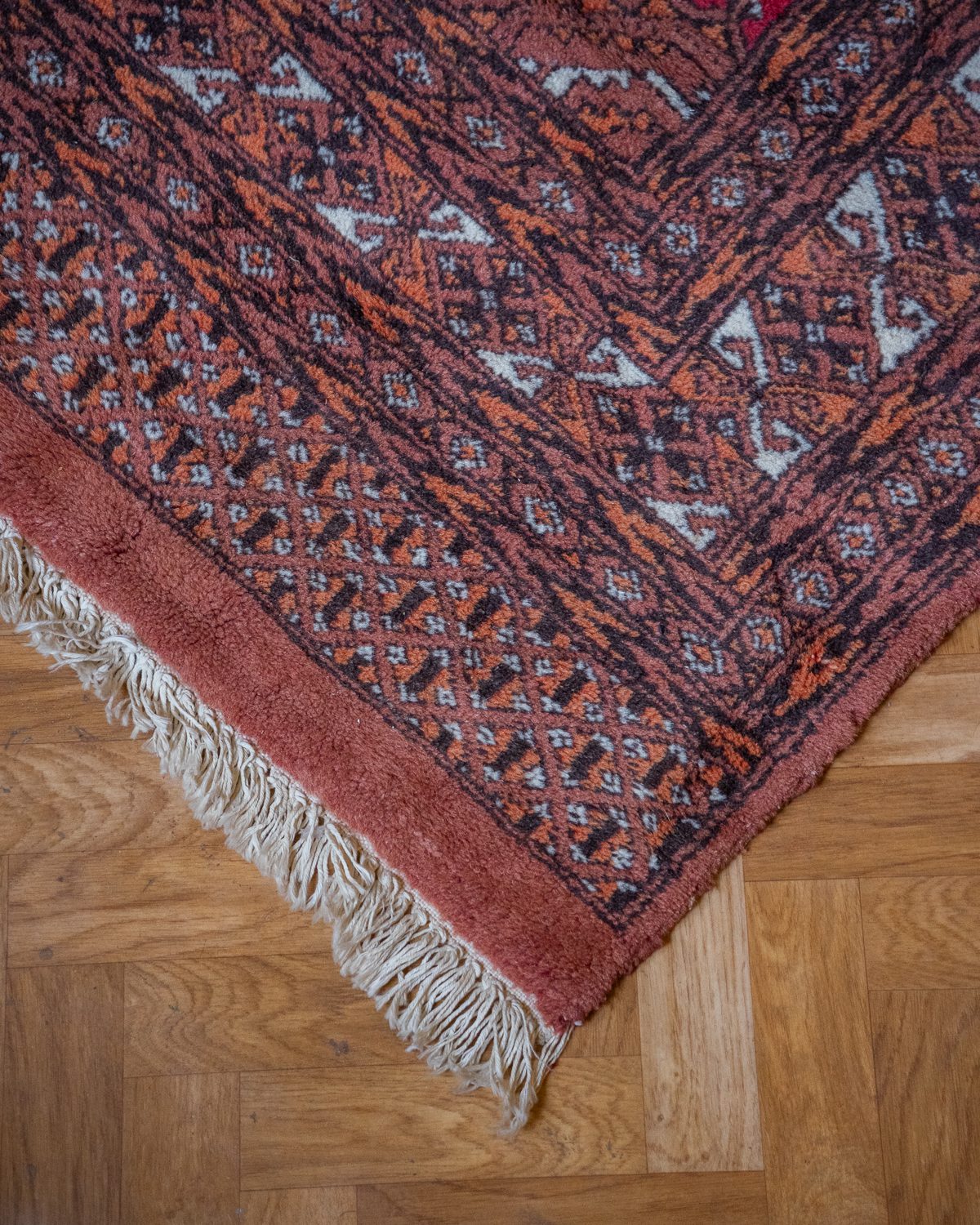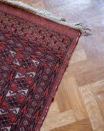 Sumedates toonides Türkmenistanist pärit villane Bokhara käsitöövaip. Heas vintage seisukorras.