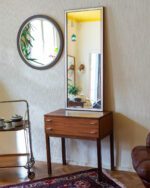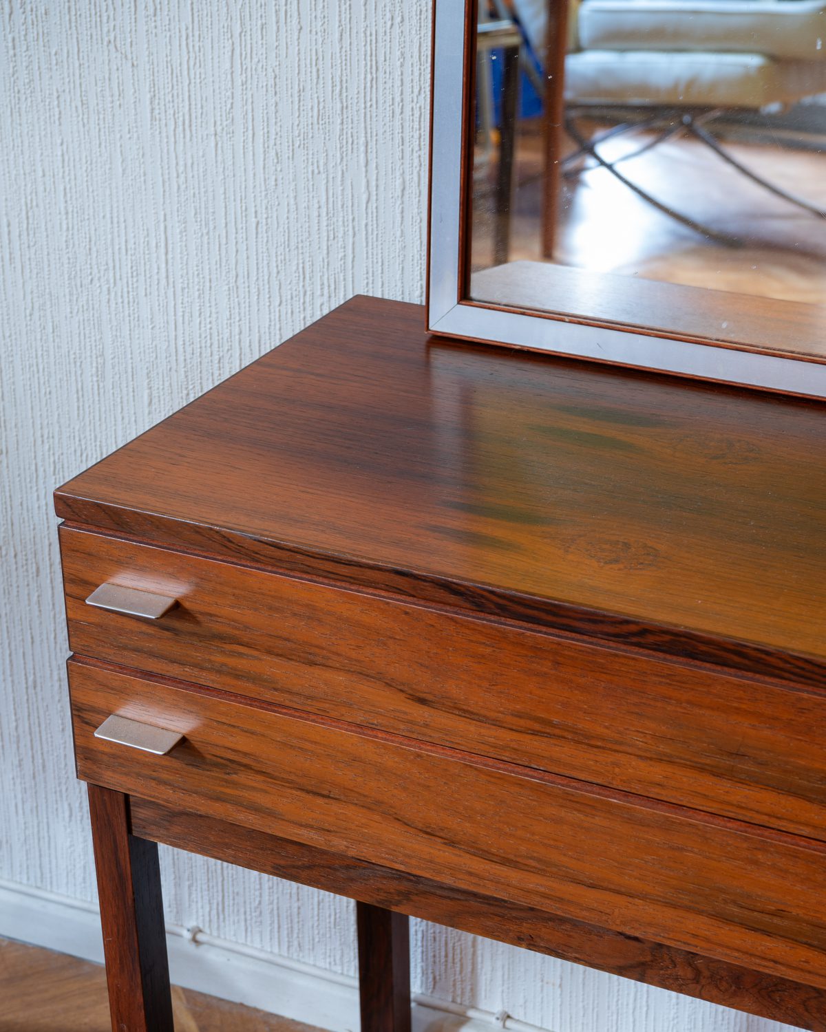 Roosipuust kapp kahe sahtliga, mida kaunistavad alumiiniumist käepidemed. Peegli raamil alumiiniumist dekoratiivliist. Väga heas korras.