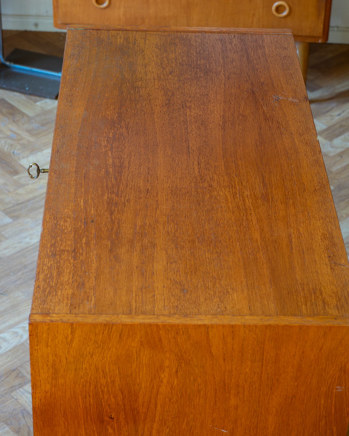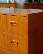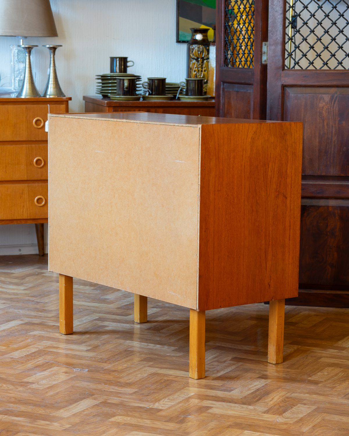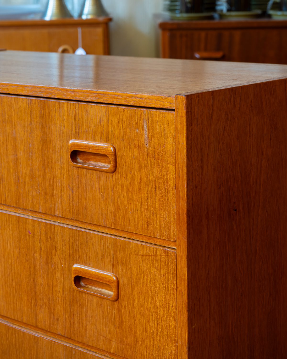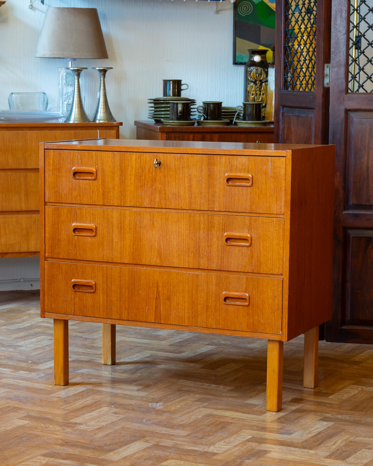 1960ndatest pärit keskmise suurusega tiigipuu spooniga kummut. Leidub kasutusjälgi, kuid on heas korras ja tugev.