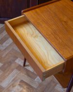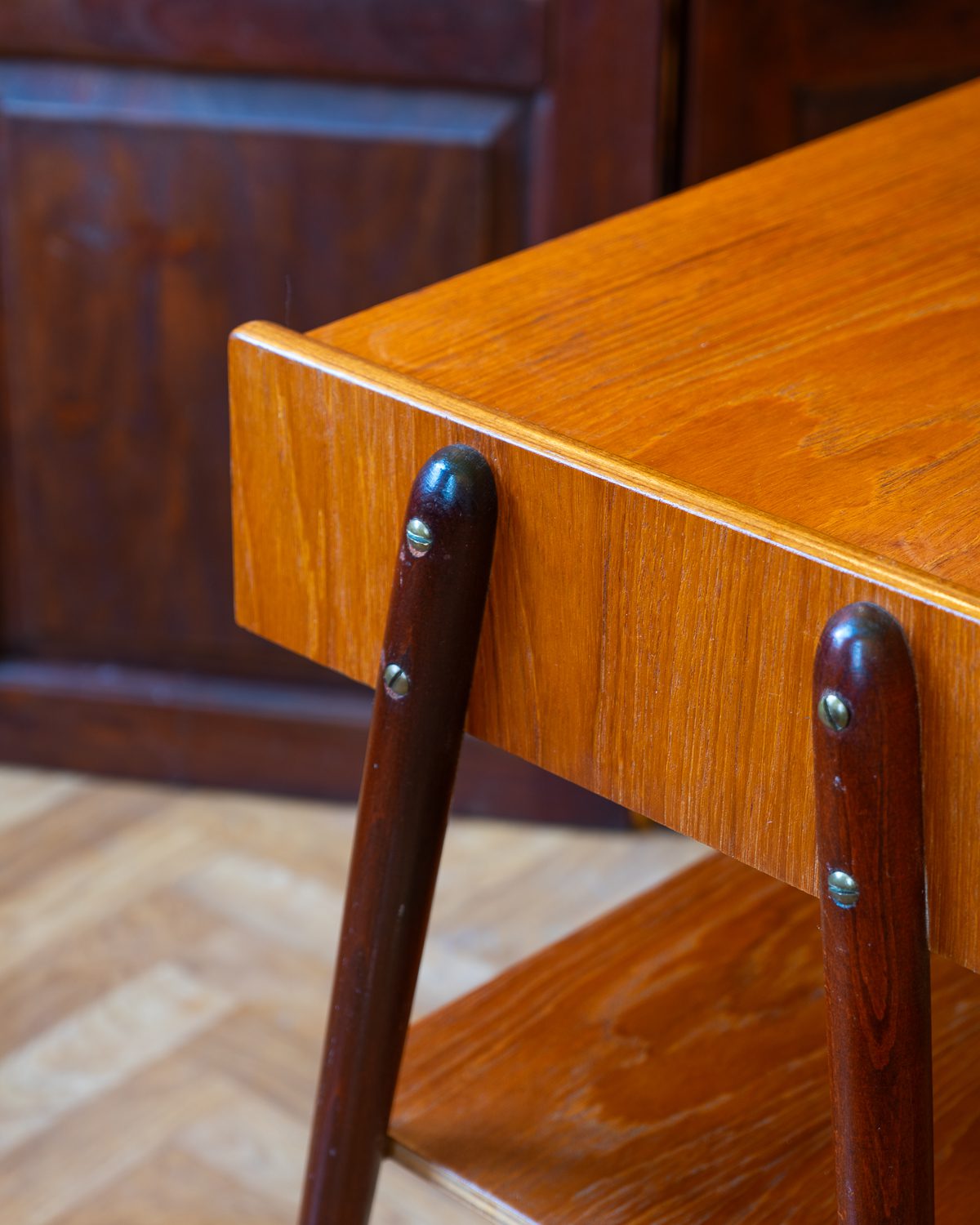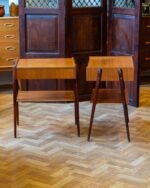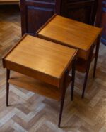1950.–1960. aastatest pärit Rootsi tootja Carlström & Co Möbelfabriku öökappide paar. Tiigipuust spooniga riiuli- ja sahtliosa ning toonitud kasepuidust jalad. Heas vintage seisukorras ja originaalviimistlusega, kuid esineb vanusele vastavat kulumist. Hind kehtib kahe öökapi kohta.