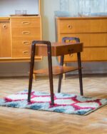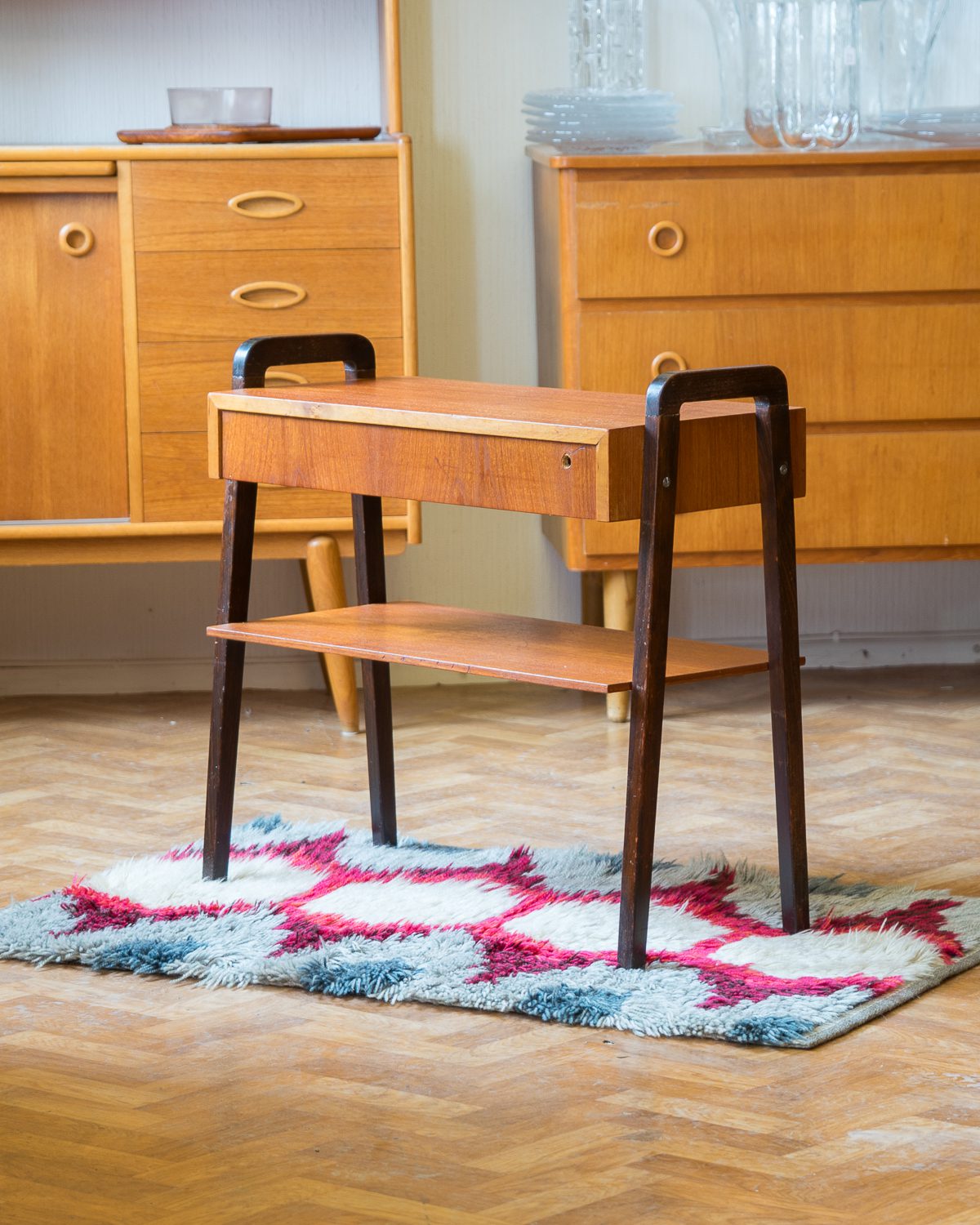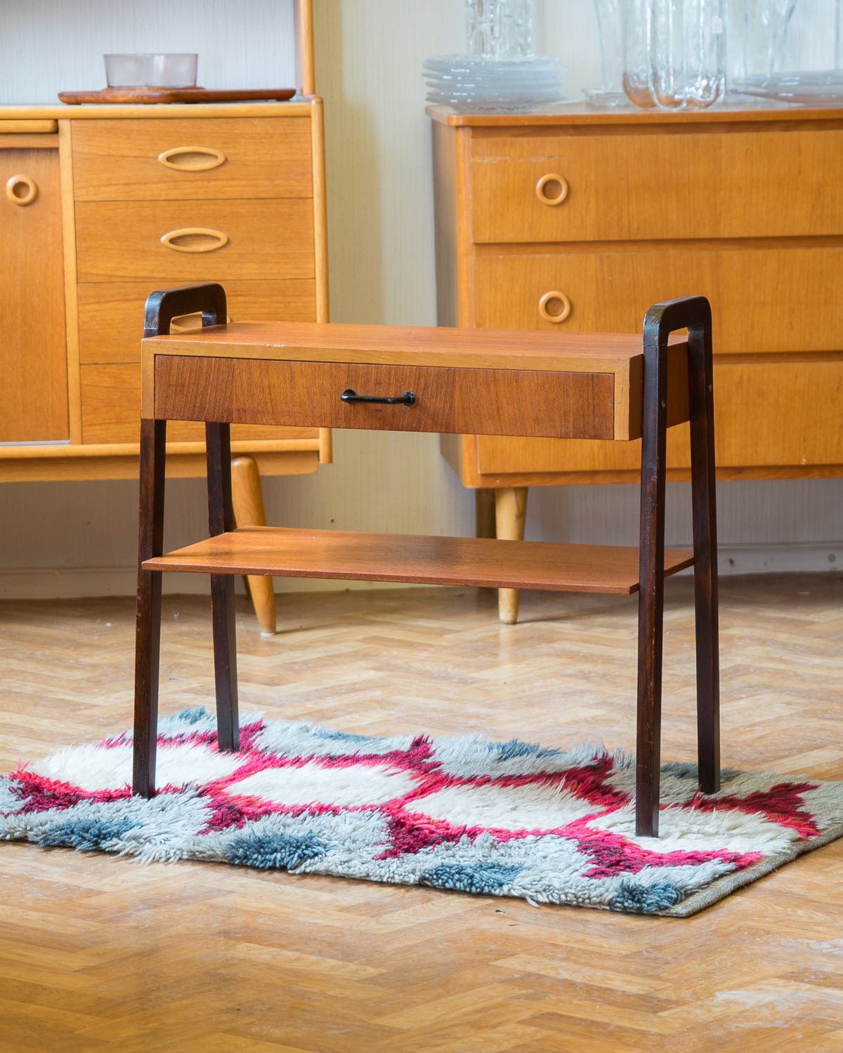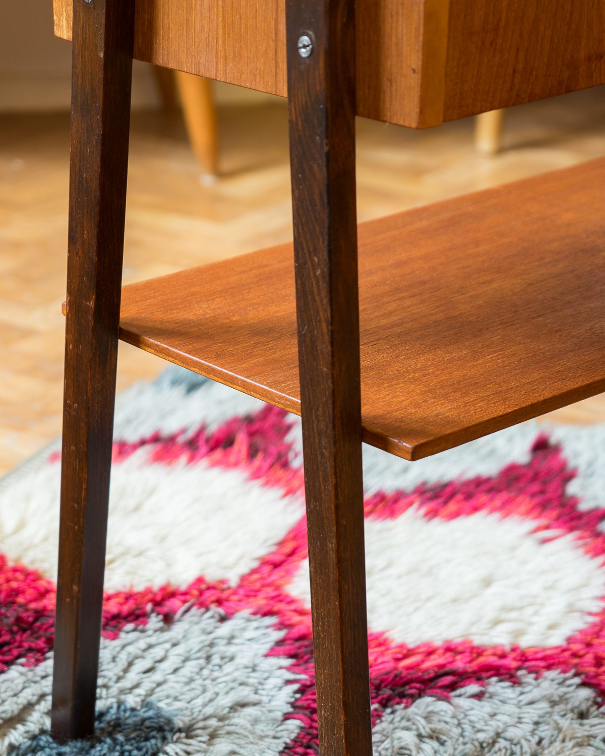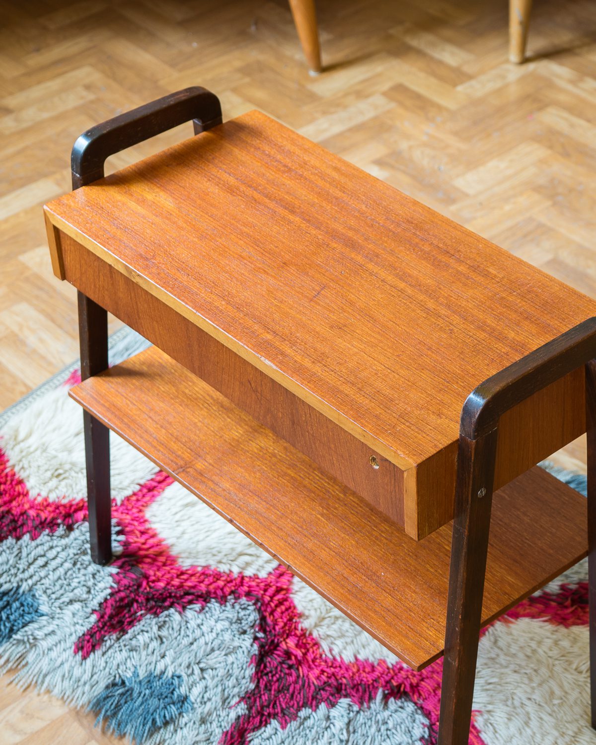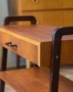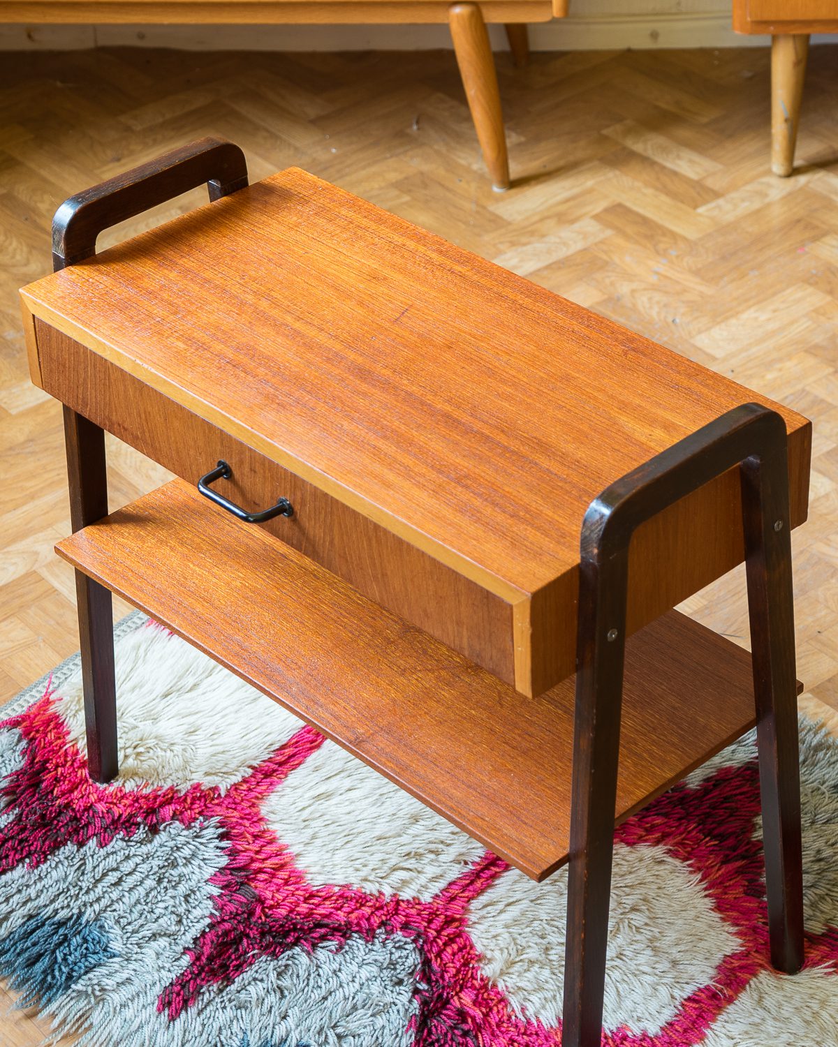 1950/1960ndatest pärit tiigipuu spooniga öökapp tumedaks värvitud jalgadega. Heas vintage seisukorras ja originaalviimistlusega.