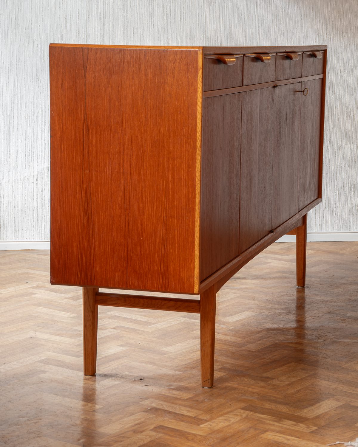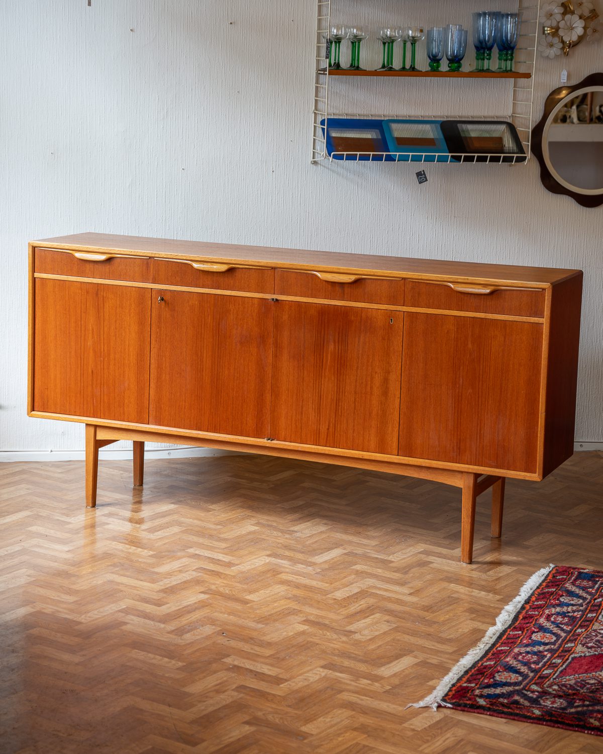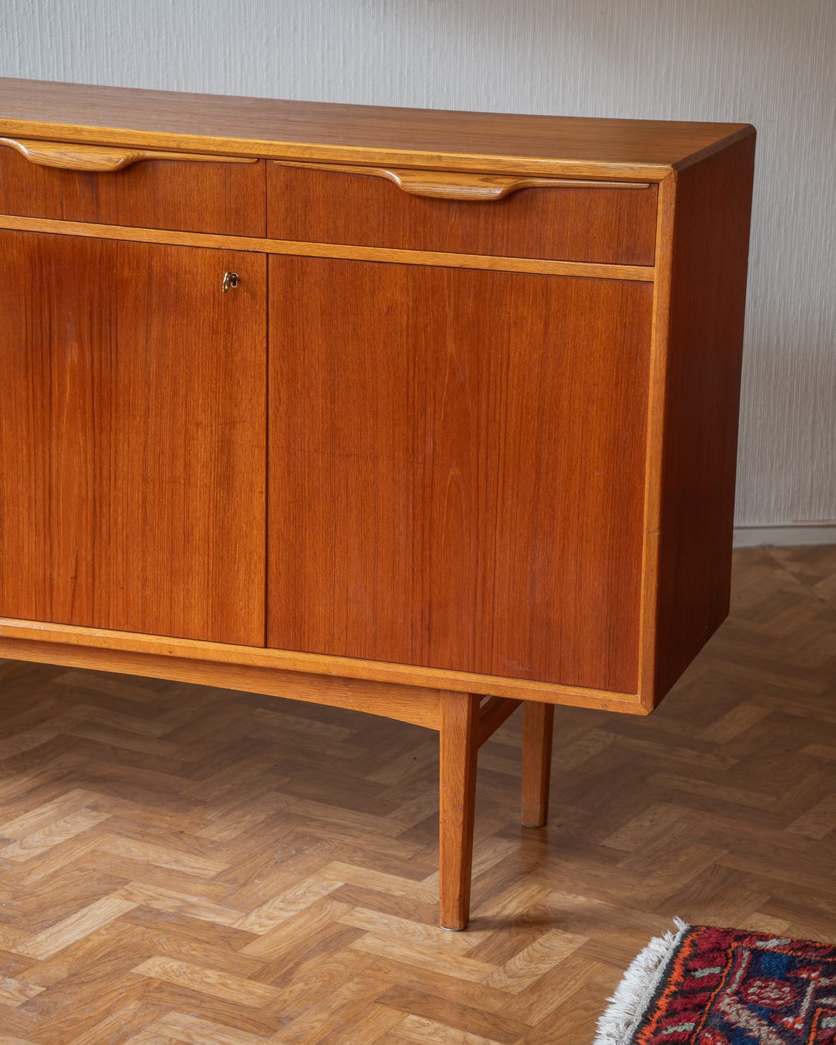 1960ndate Rootsi sideboard, disainis Bertil Fridhagen Bodaforsile. Heledamast puidust valmistatud käepidemed ja ääreliistud tekitavad ilusa kontrasti. Restaureerimata.