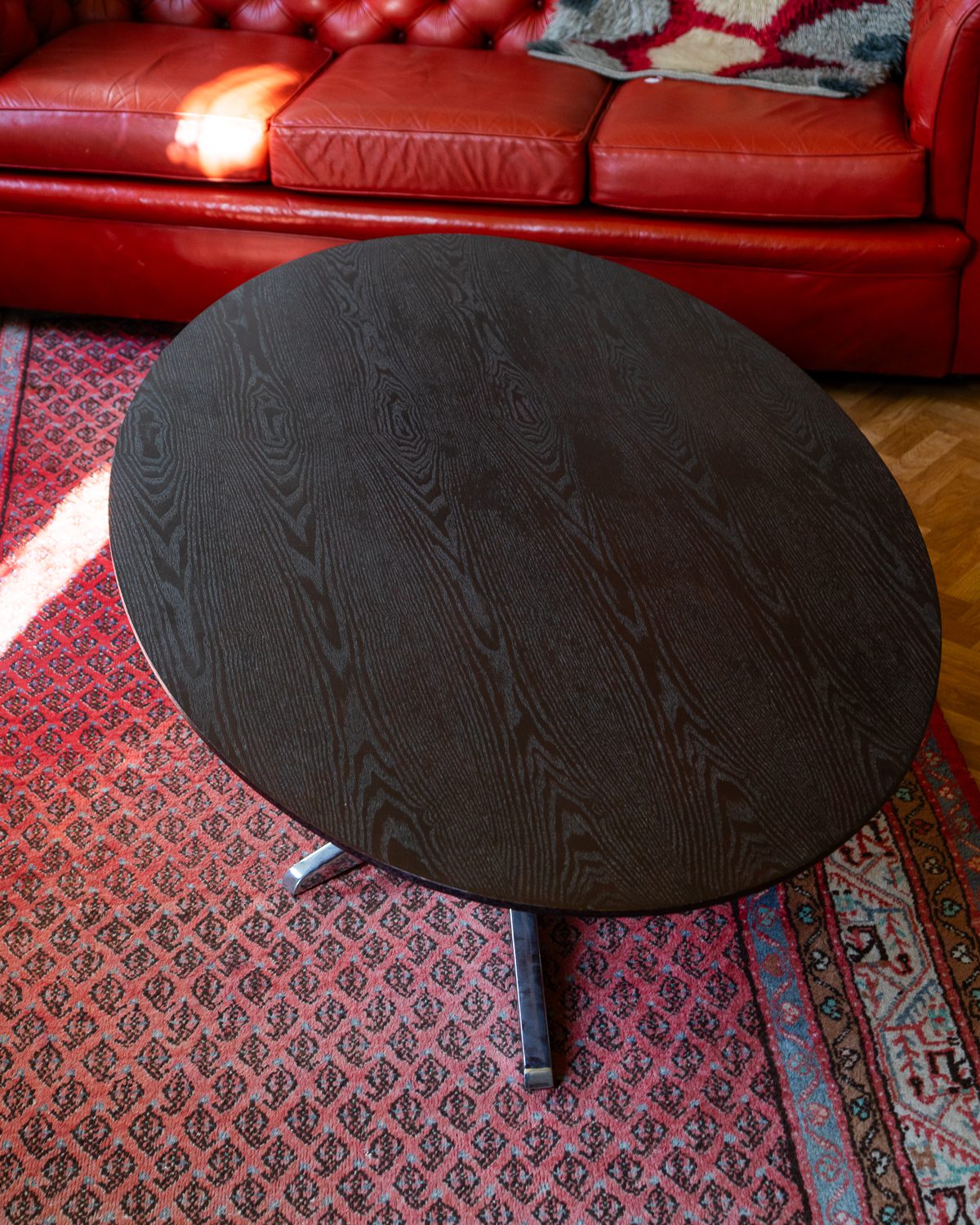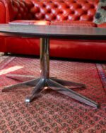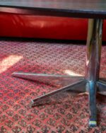 20. sajandi sajandi lõpust pärinev diivanilaud, mis on saanud tugevat inspiratsiooni Florence Knolli ikoonilisest disainist. Laual on elegantne kroomitud tähte kujuline jalg ja must puiduspoonist plaat, mis sobib valatult nii moodsasse kui ka retrohõngulisse interjööri Laud on väga heas seisukorras, kroom on läikiv, lauaplaadil esineb kerget kulumist.