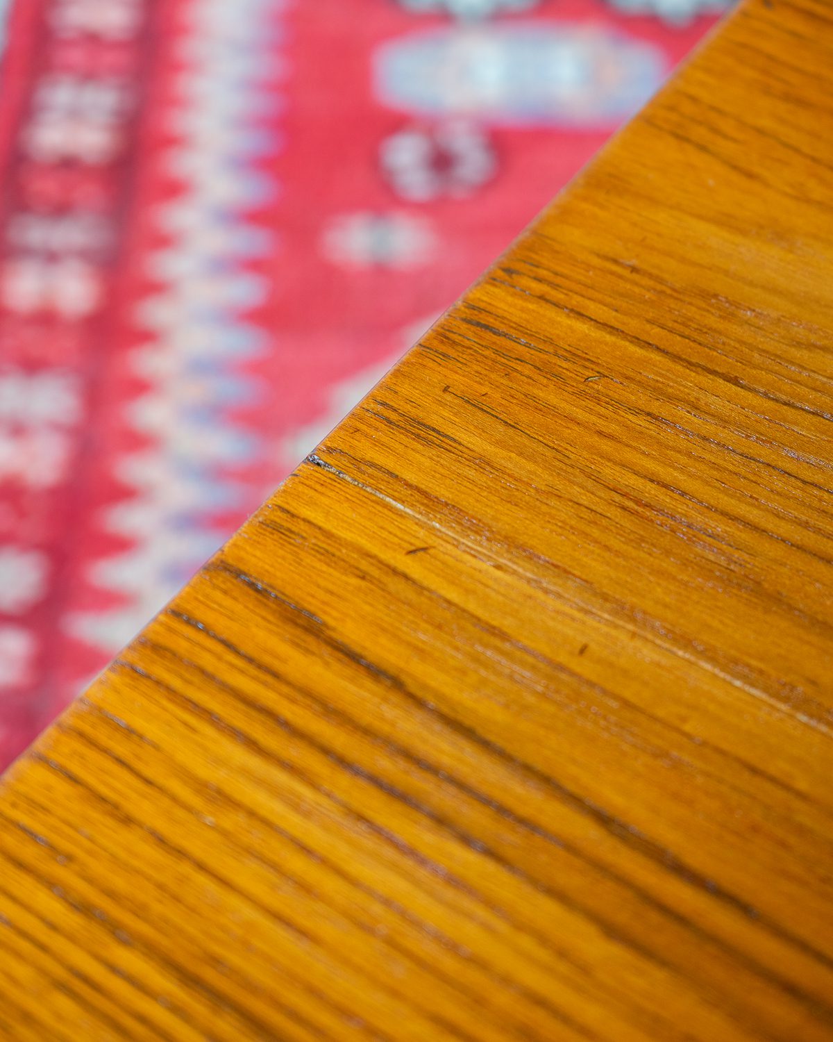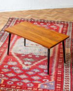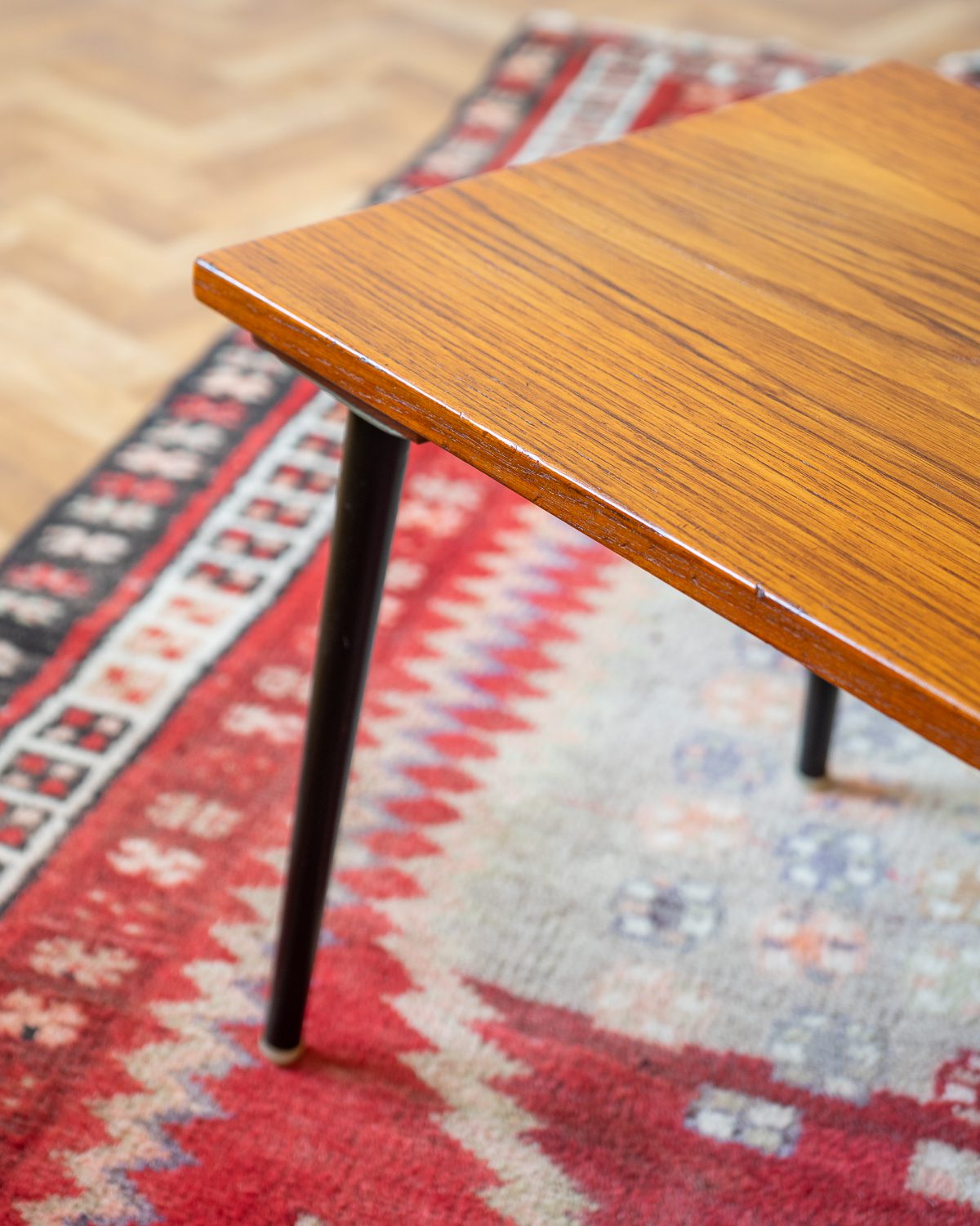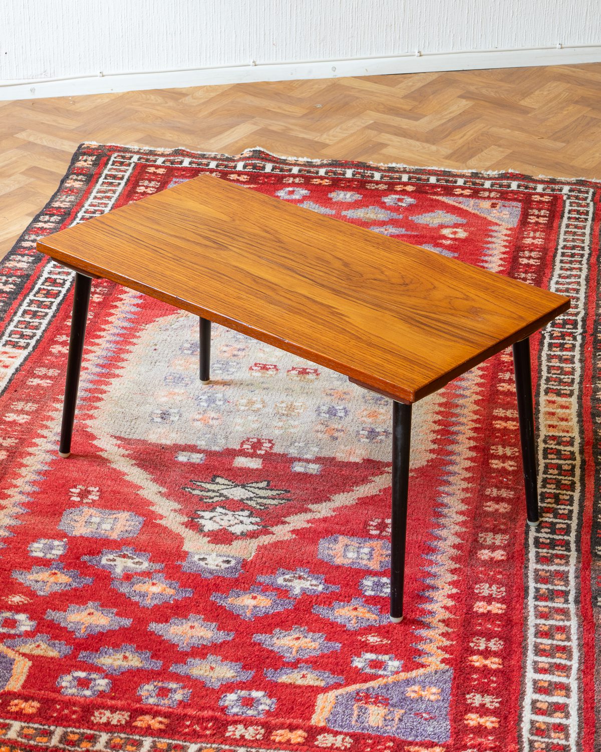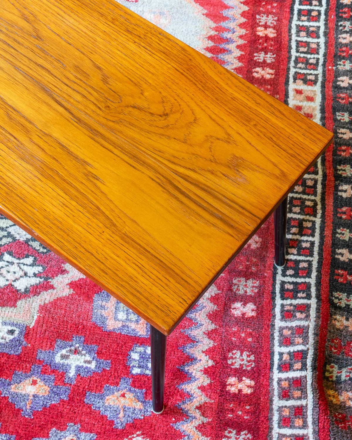 Täispuit tiigipuust diivanilaud sihvakate metallist jalgadega. Laud on restaureeritud ja heas vintage seisukorras.