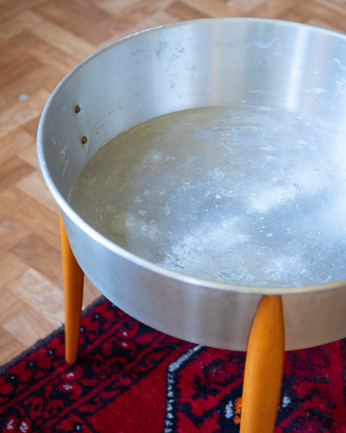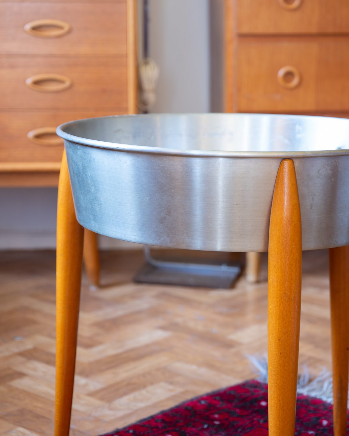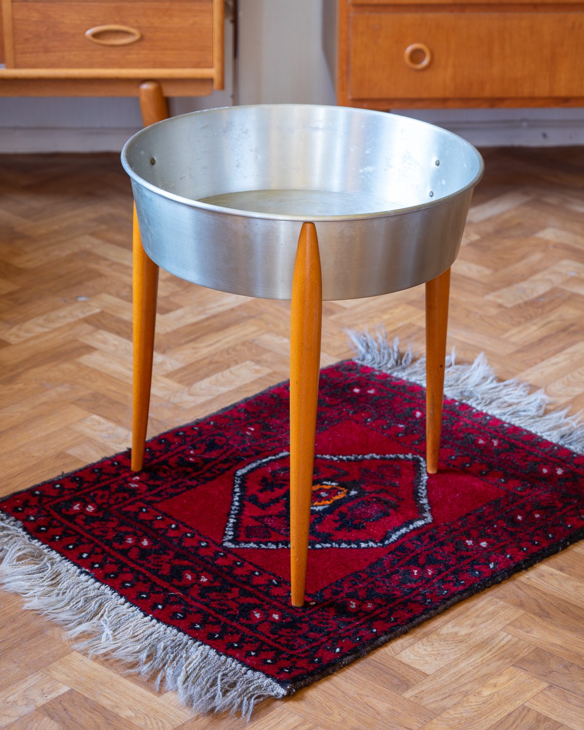 Alumiiniumist kausi ja puidust jalgadega vintage lillepostament 1960/70ndatest. Leidub vanusele vastavat kulumist.