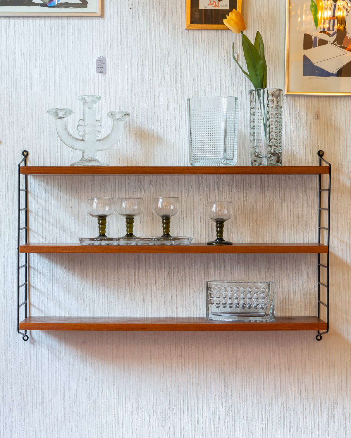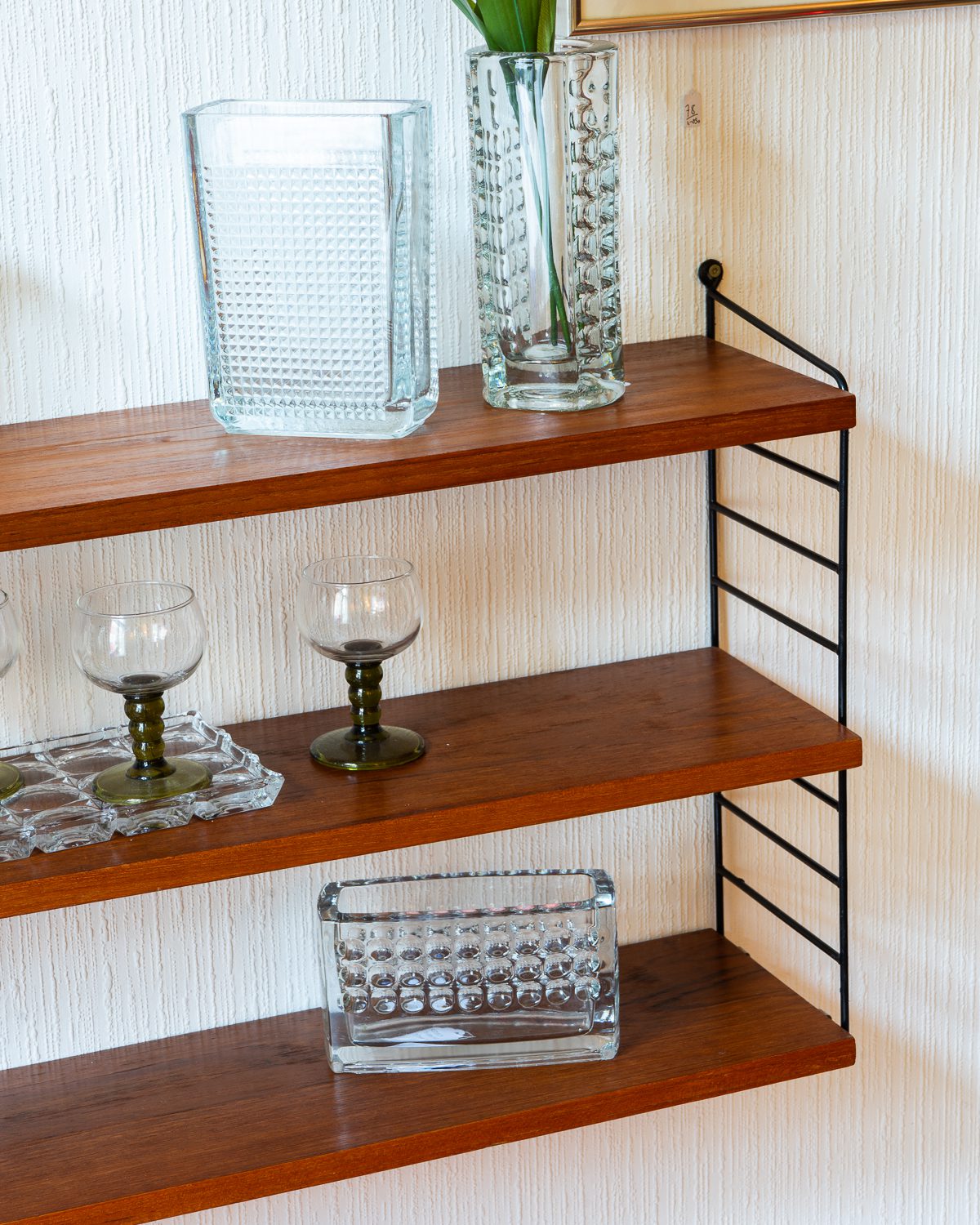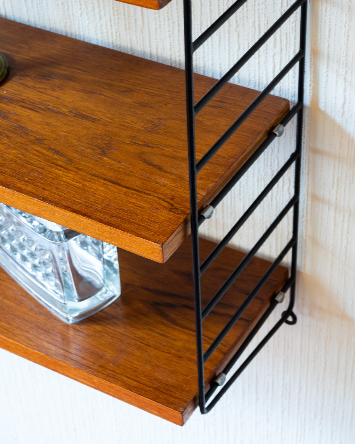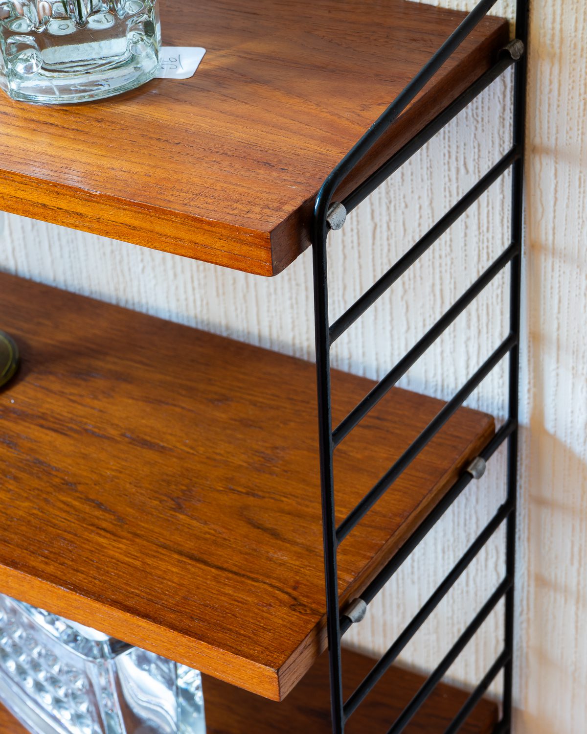 Nisse ja Kajsa Strinningu poolt disainitud vintage “Stringhylla” riiul, valmistatud ja disainitud 1950ndatel Rootsis. Riiulil on kolm täispuidust riiuliplaati, mille kõrgused on reguleeritavad. Riiuliplaadid on restaureeritud ja väga heas korras.