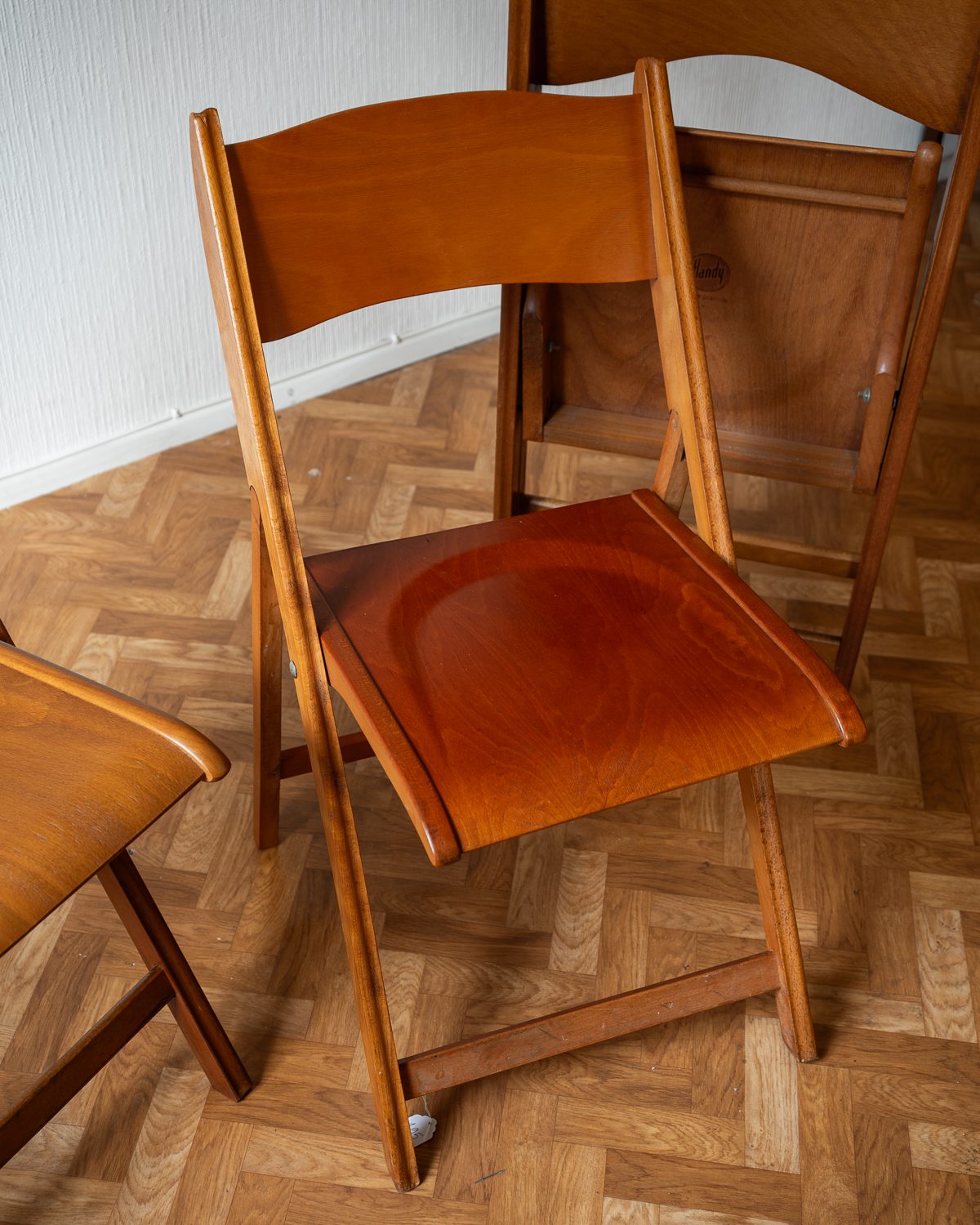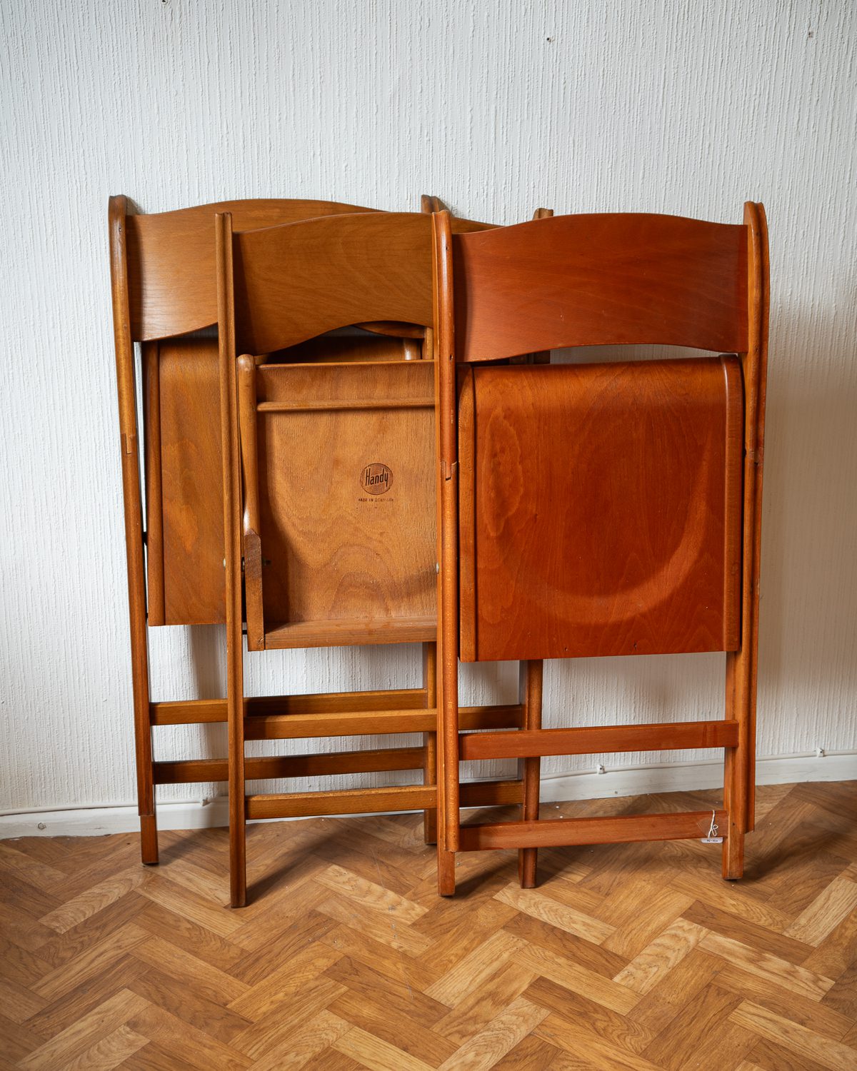 2 tooli heas korras, ühe tooli istumisplaat hoiab viltu ja lahtises asendis on üks jalg veisi õhus, peale istudes vajub paika (esimesel pildil paremal pool)