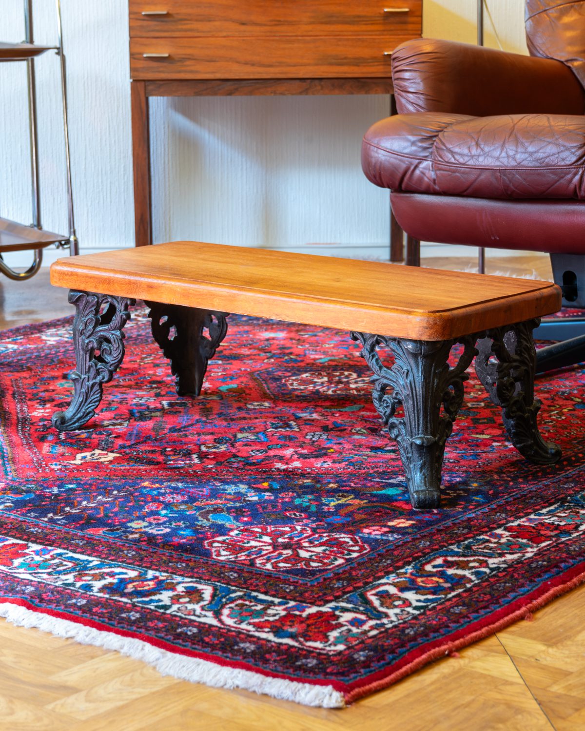 Väike malmist jalgadega pink. Puidust osa sai uue viimistluse. Kõrgus 25, sügavus 29, laius 69 cm
