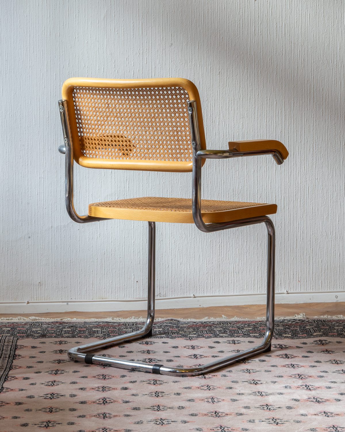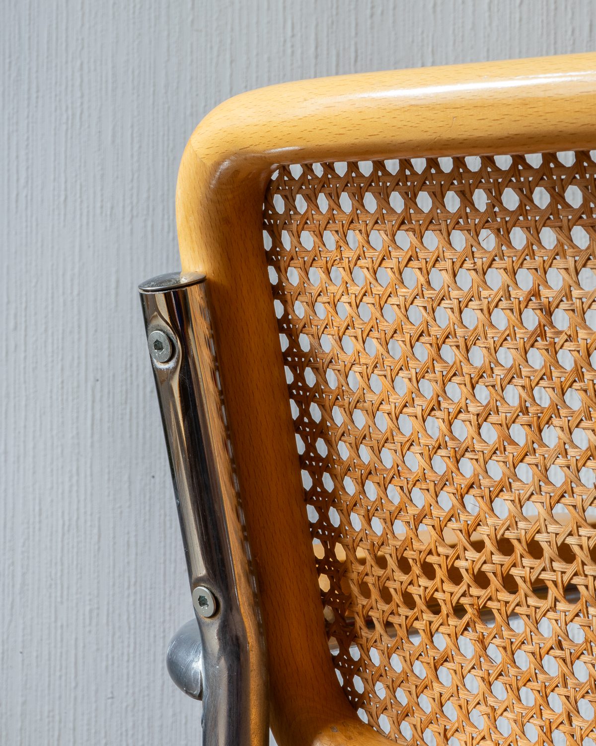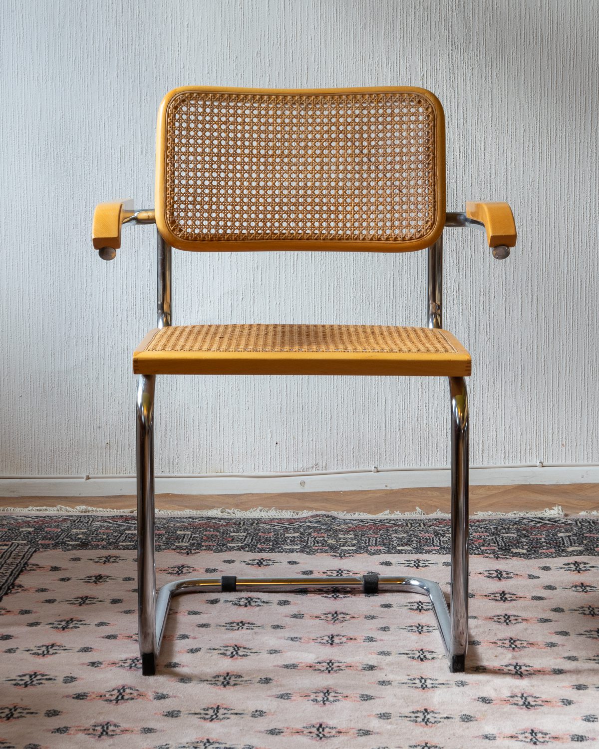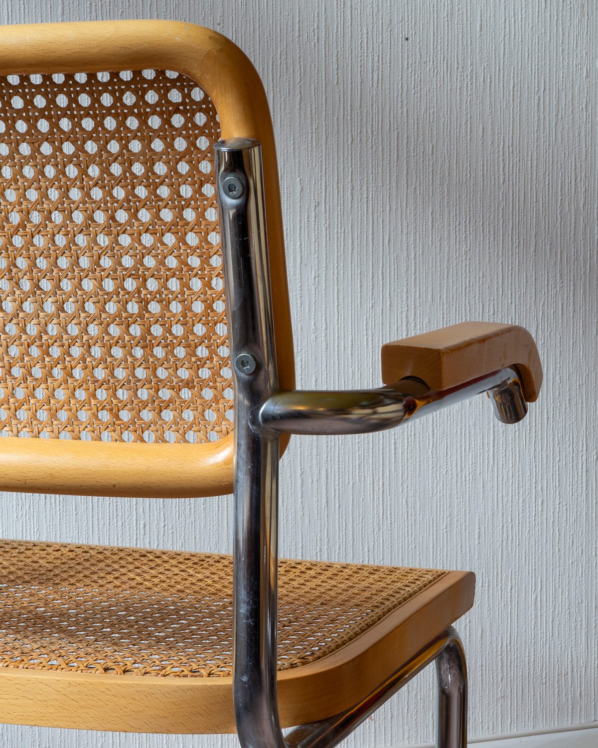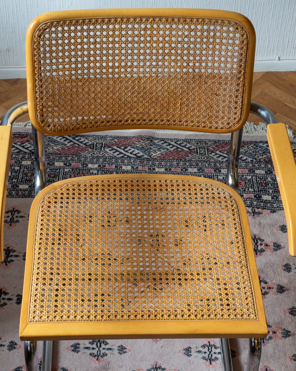 Marcel Breueri 1928. aasta ikoonilise disainiga Cesca stiilis tool käetugedega. Disainiklassika, kus kroomitud metall kohtub naturaalse rotangiga. See konkreetne tool on säilinud originaalseisundis. Punutises esineb mõningaid lahtisi kohti, kuid üldiselt on tool heas korras ja täiesti kasutuskõlblik ning valmis koheseks kasutamiseks.
