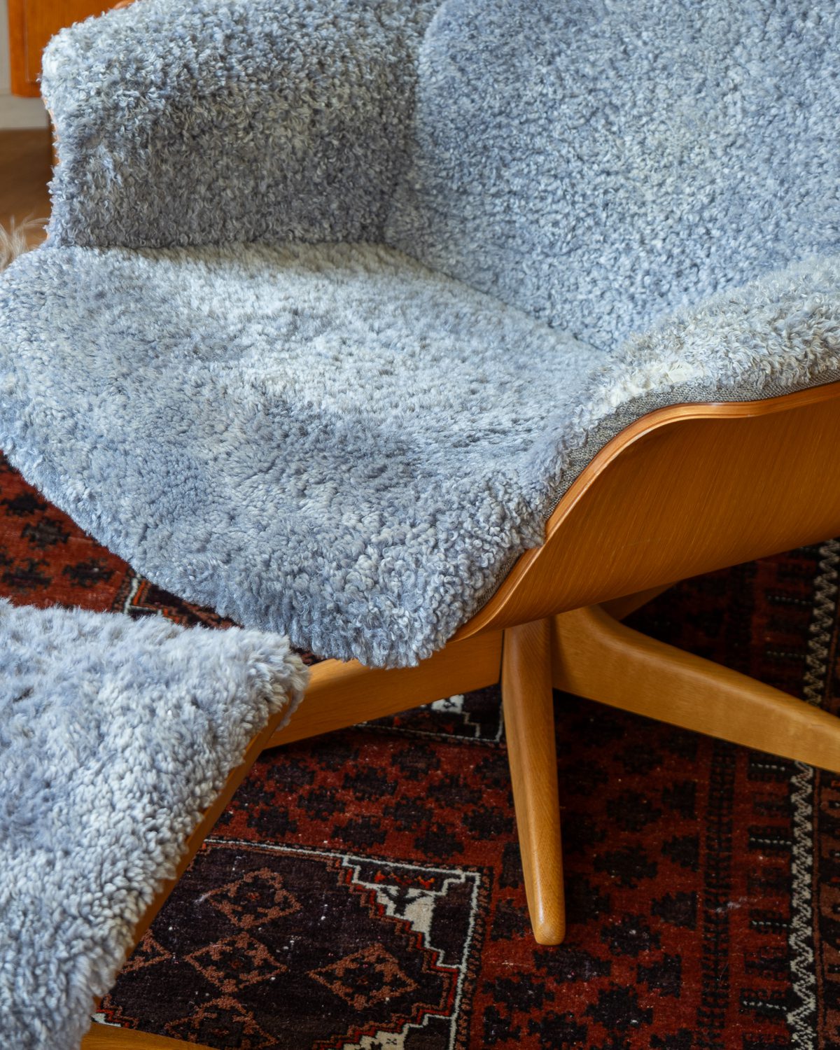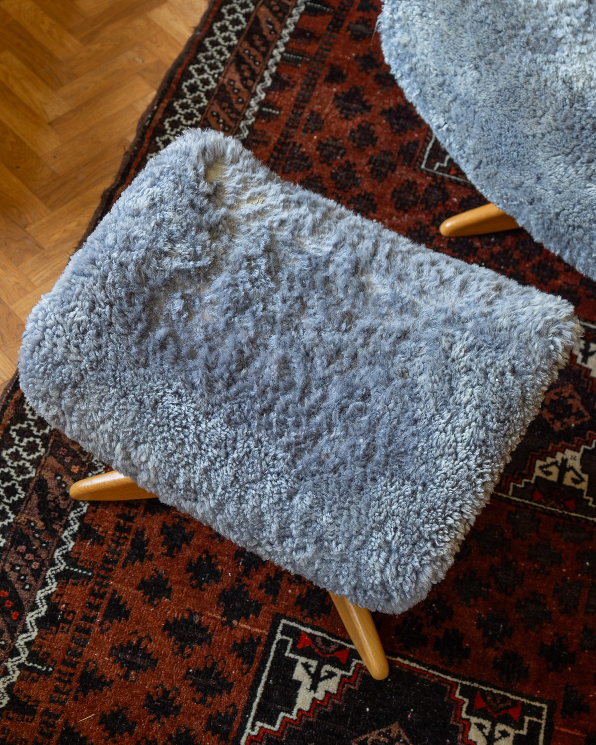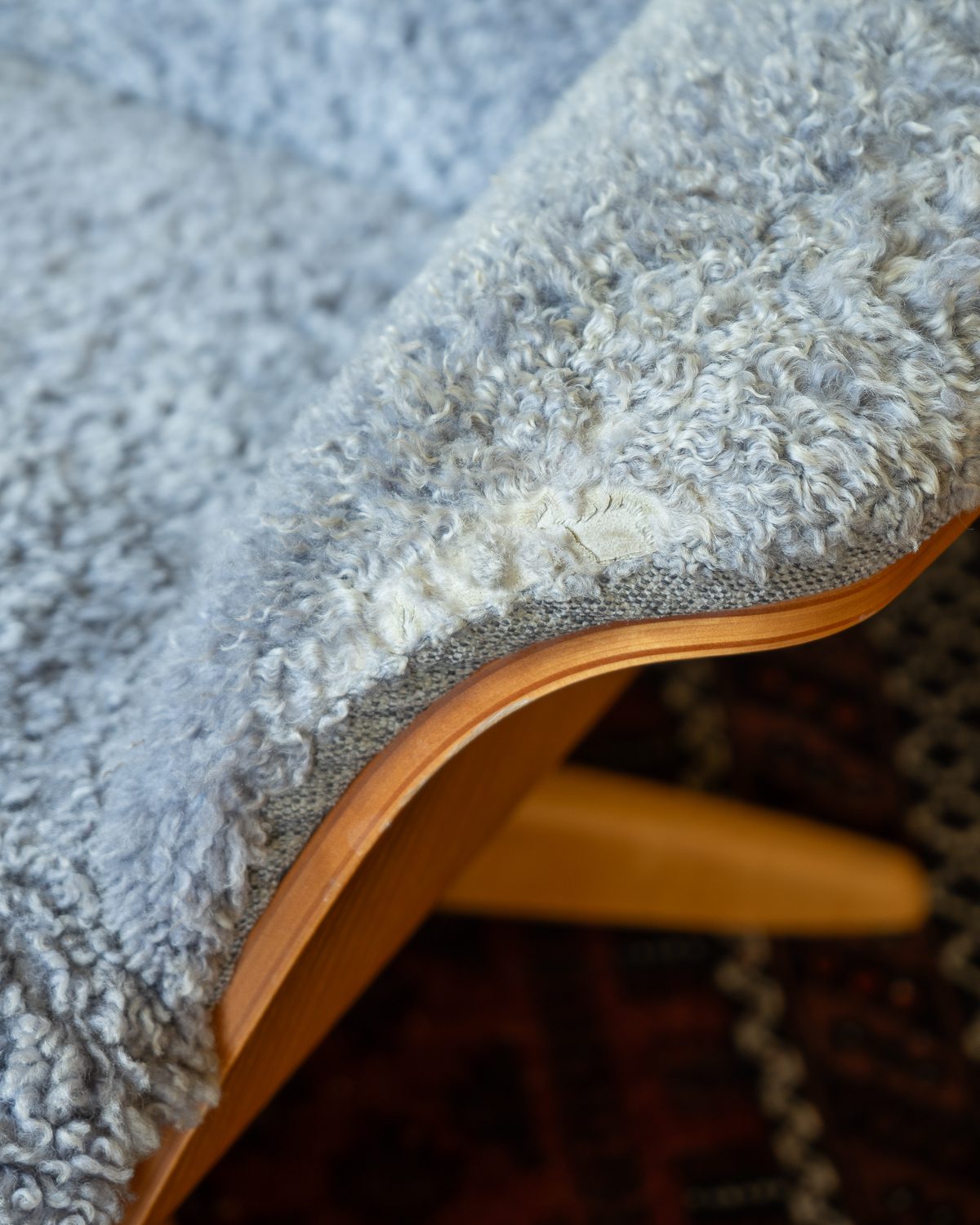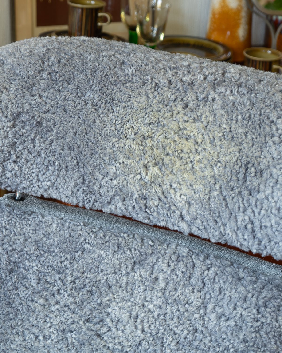 Komplekt on heas seisukorras ja nahk on värskelt puhastatud. Lambanahal esineb loomulikku, vanusele vastavat kulumist: peatoe osas on näha heledamat kohta, käetugede otstes esineb kulumist ning ka järil on keskosas kulumisjälgi.
