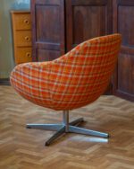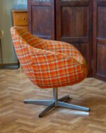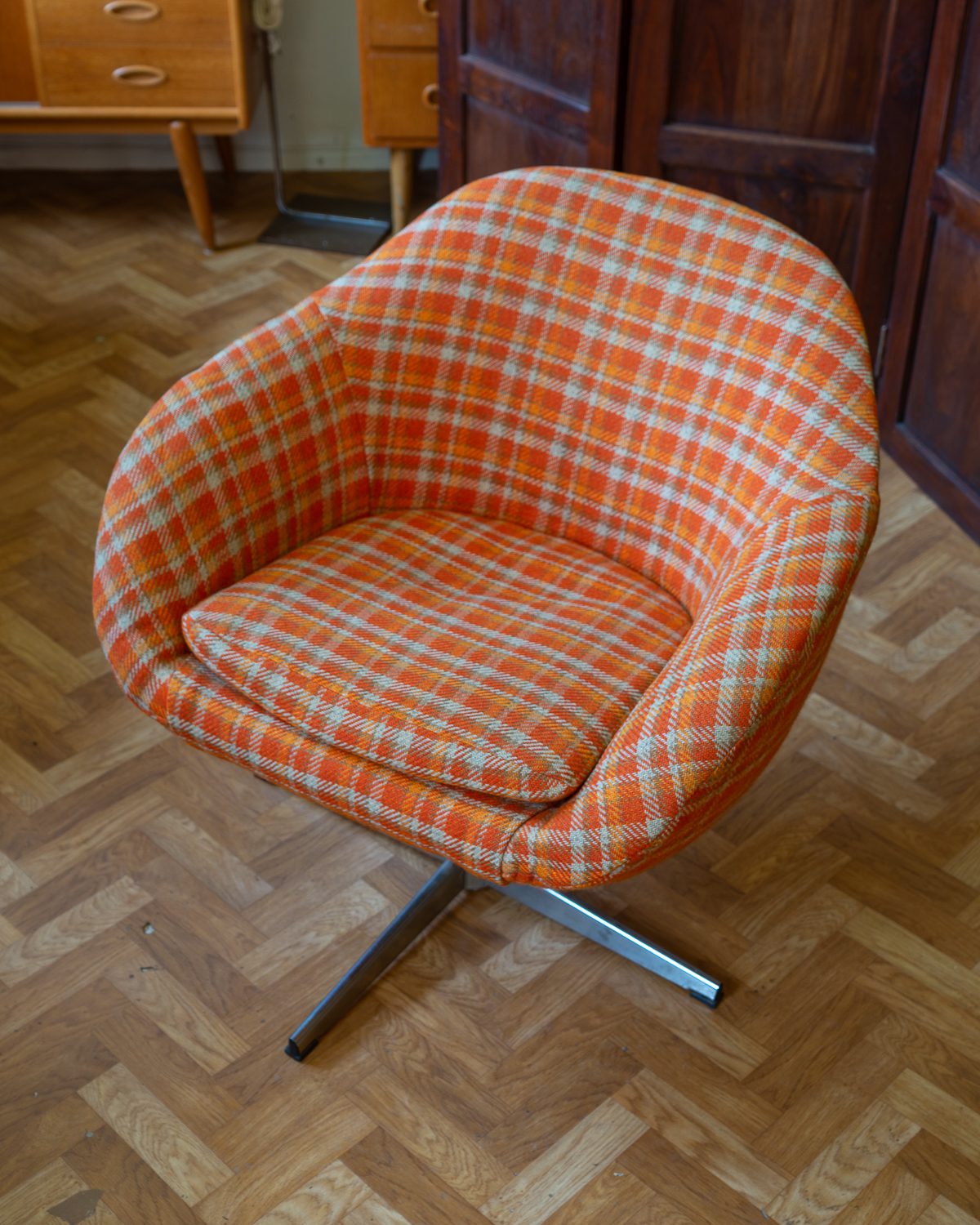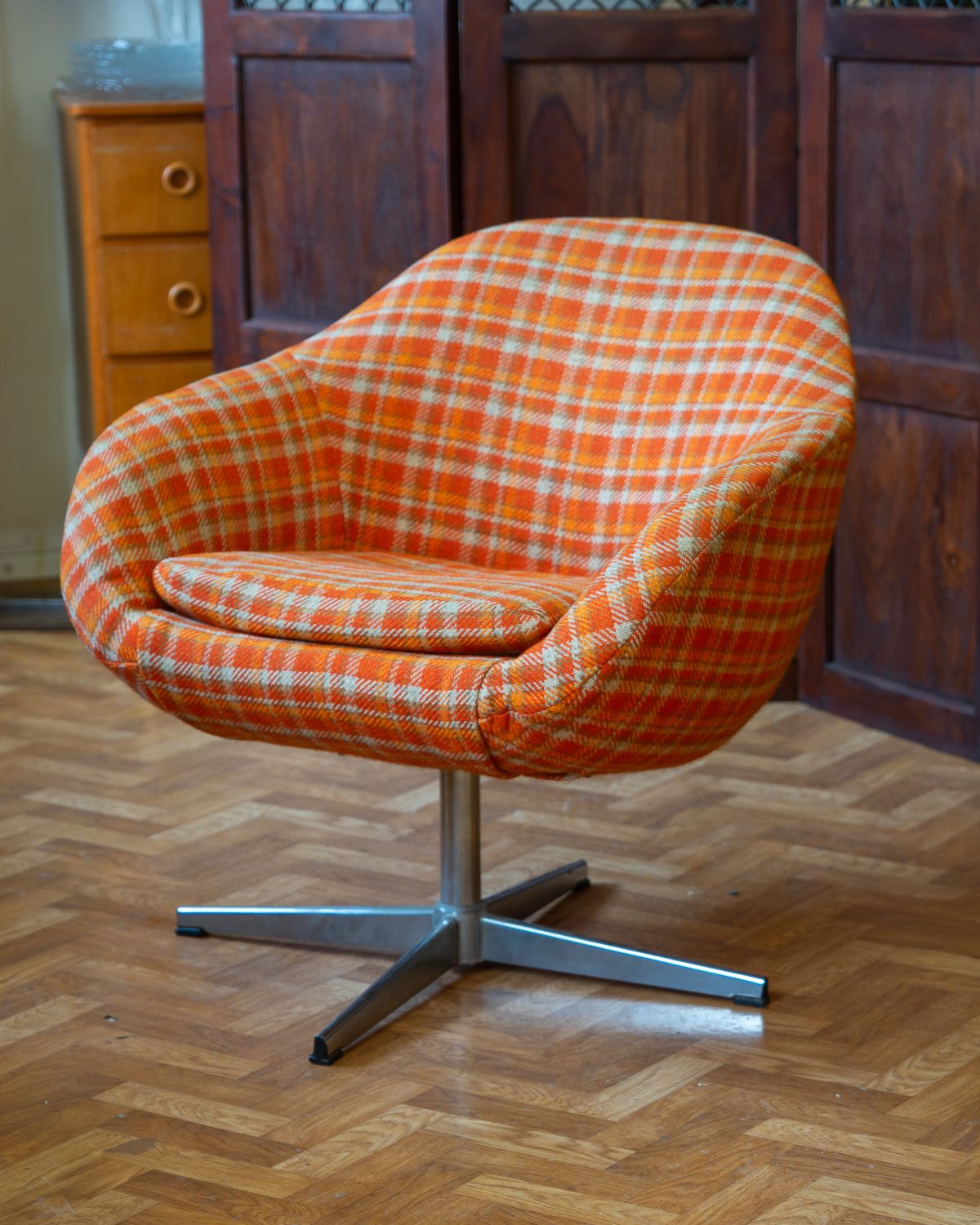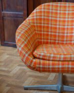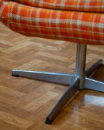 1970ndatest pärit oranži ruudulise kangaga ajastule iseloomuliku kumera vormiga pöörlev tugitool. Tool on heas vintage seisukorras, konstruktsioon on stabiilne ja pöördmehhanism töötab sujuvalt. Istmepadi on ühest kohast kergelt muljutud, kuid kuna kate on lukuga eemaldatavad, on võimalik sisu kohendada või korrastada.