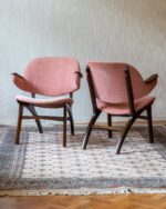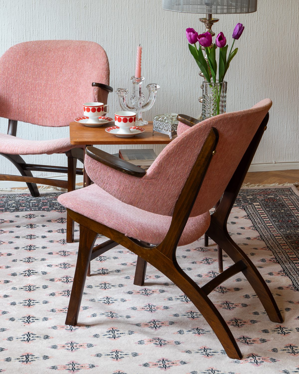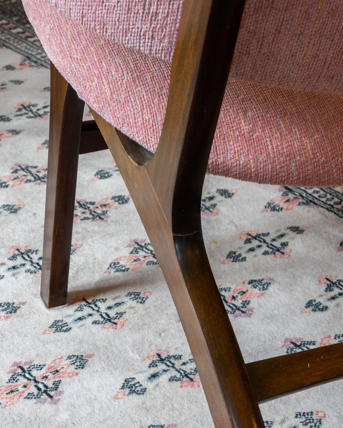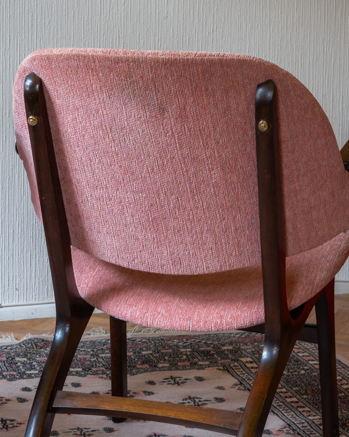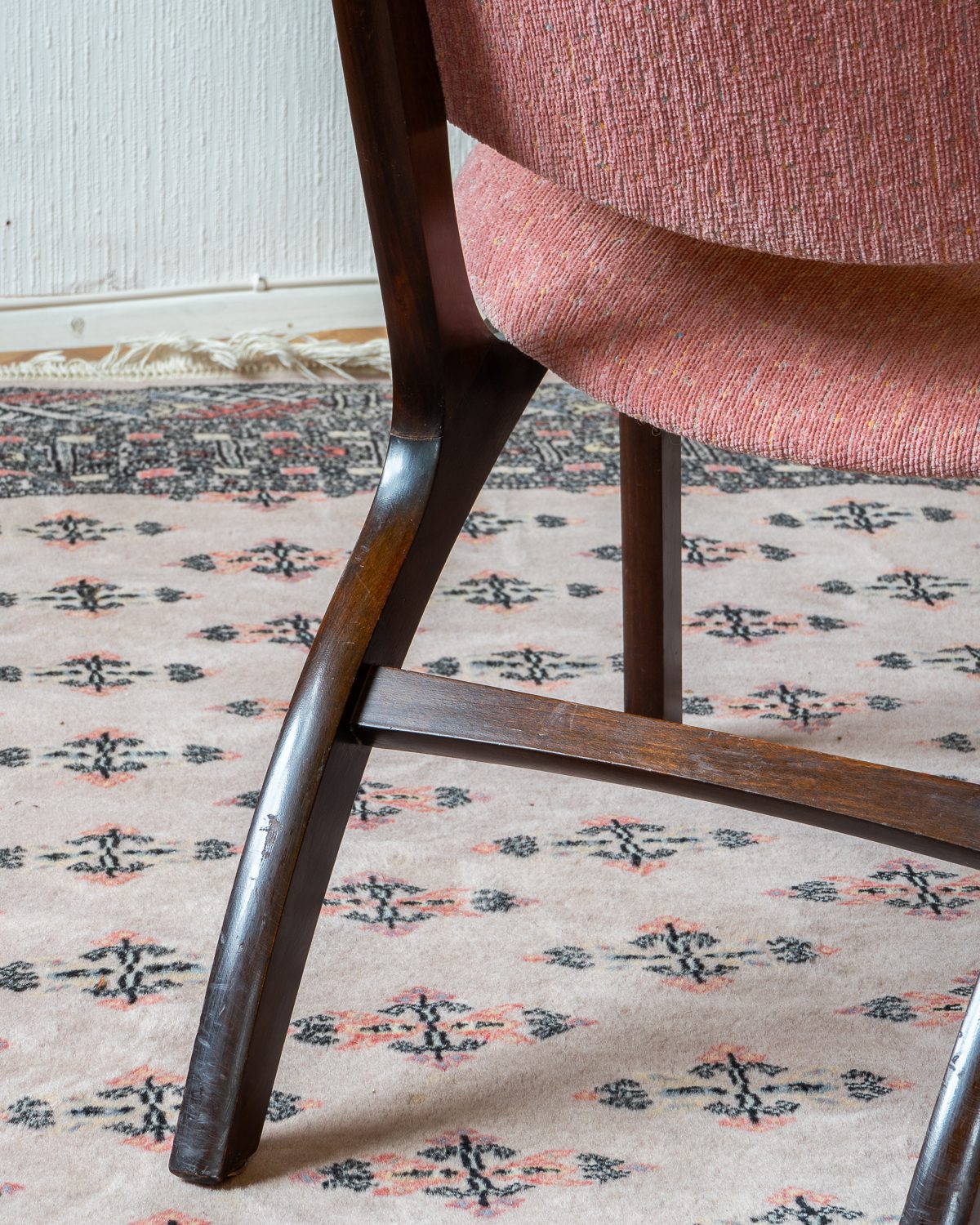 Kaks 1952. aastal Carl Edward Matthesi disainitud “Model 33” seeriast pärit tugitooli. Valmistaud CE Matthes Denmark mööbli väiketootja poolt Taanis 1950ndatel. Toolide raas ja kangas on heas originaalses seisukorras, raamil esineb vanusele omaseid kriime-kraapse ja kangal paar õrnemat plekki – proovime neid veel puhastada enne uude koju saatmist.