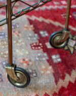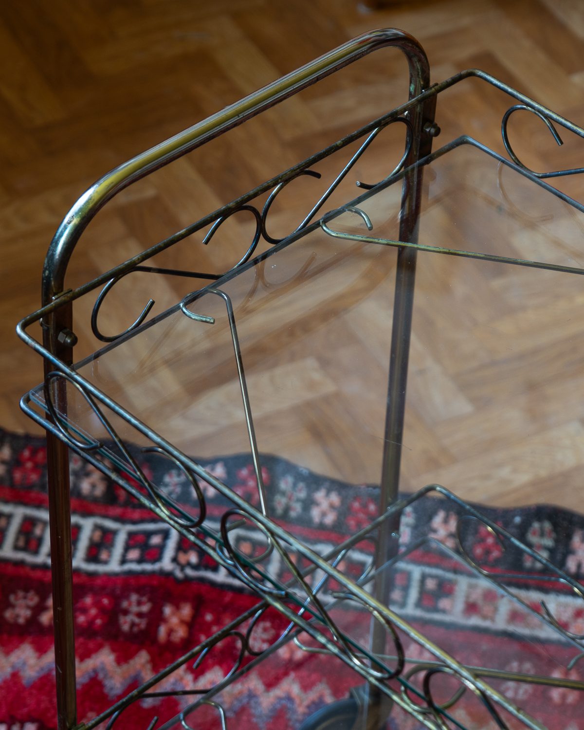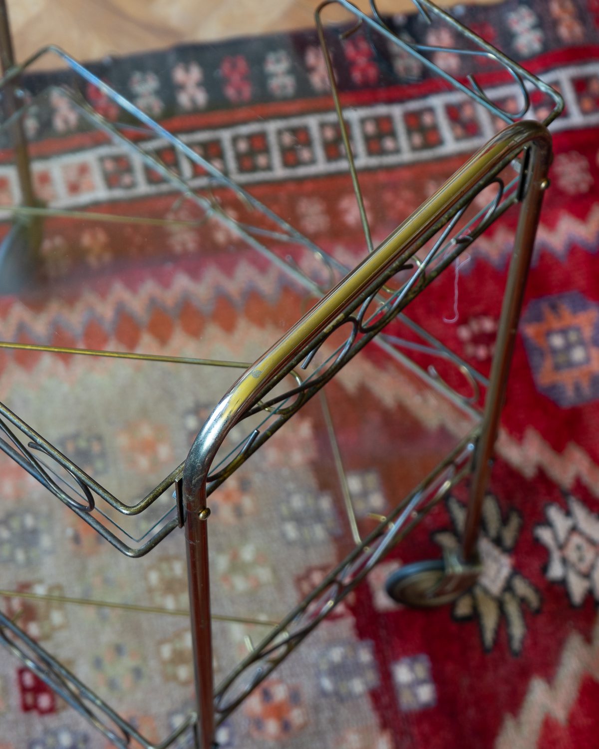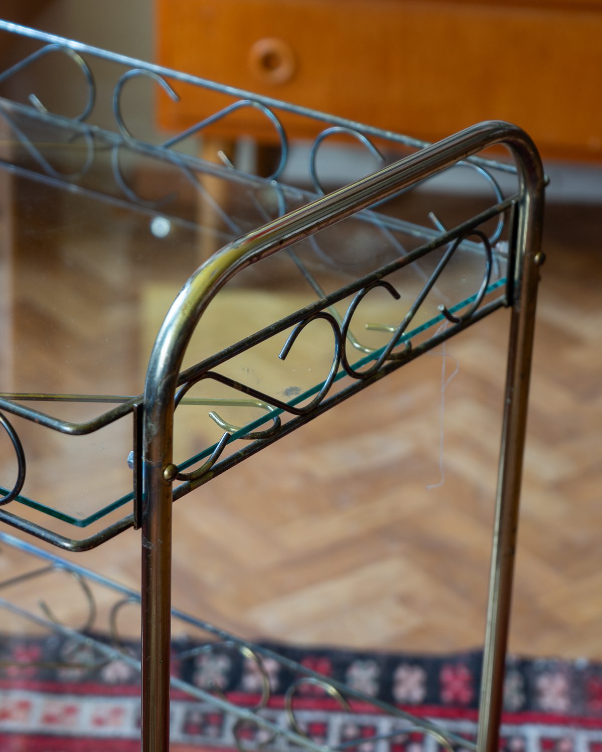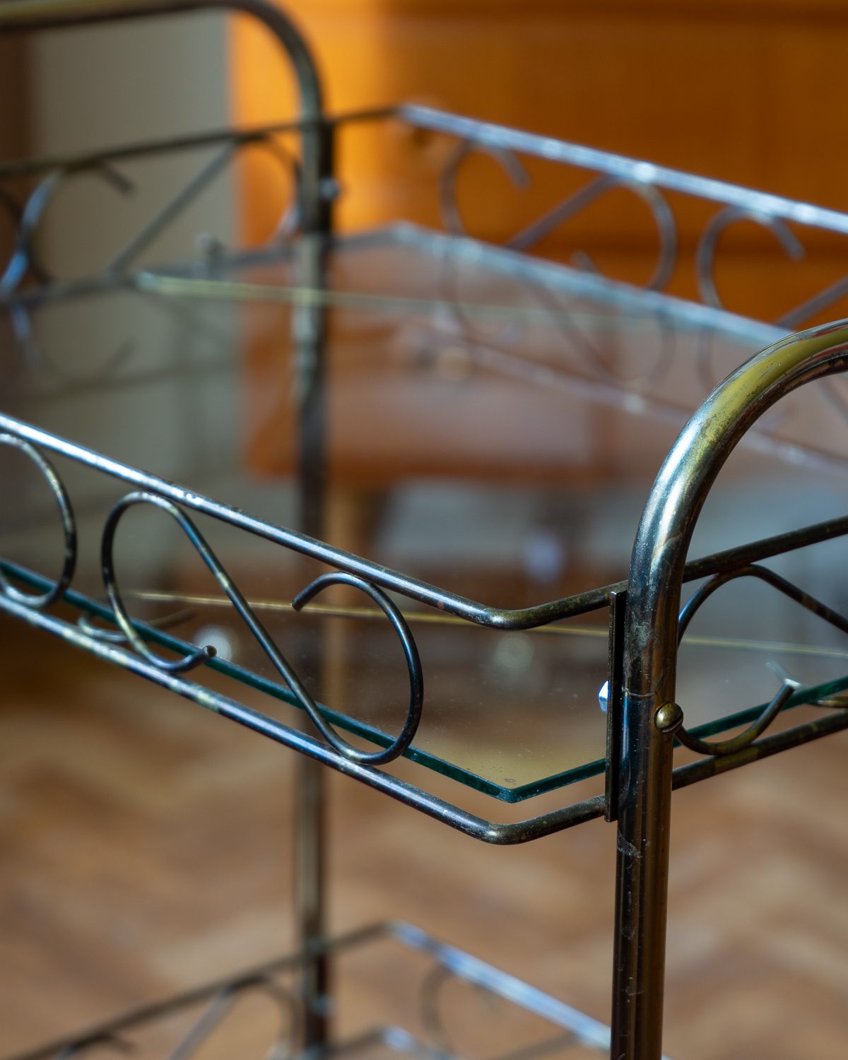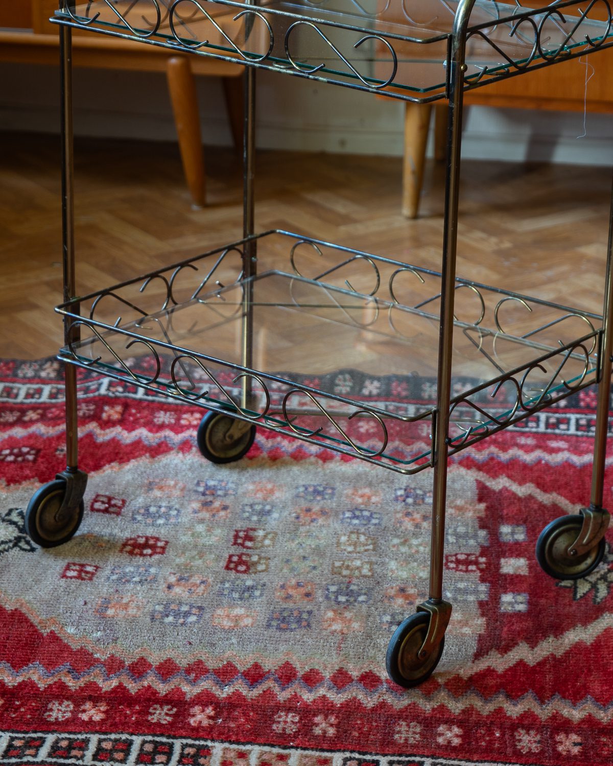 1970ndatest pärit messingukarva metallist serveerimiskäru klaasist riiulitega. Väga heas seisukorras, veereb vabalt ja kriuksumata. Osad originaalsed kinnitusdetailid kadunud ja asendatud tänapäevastega.