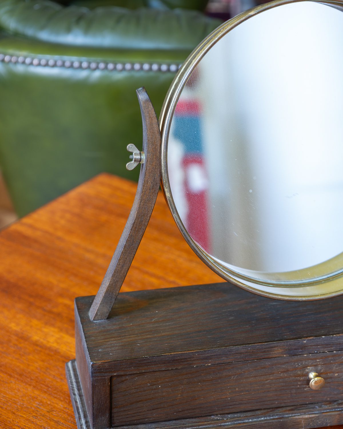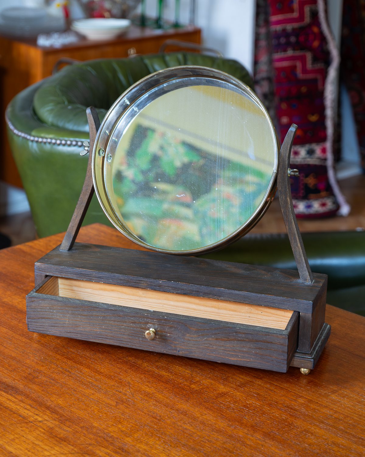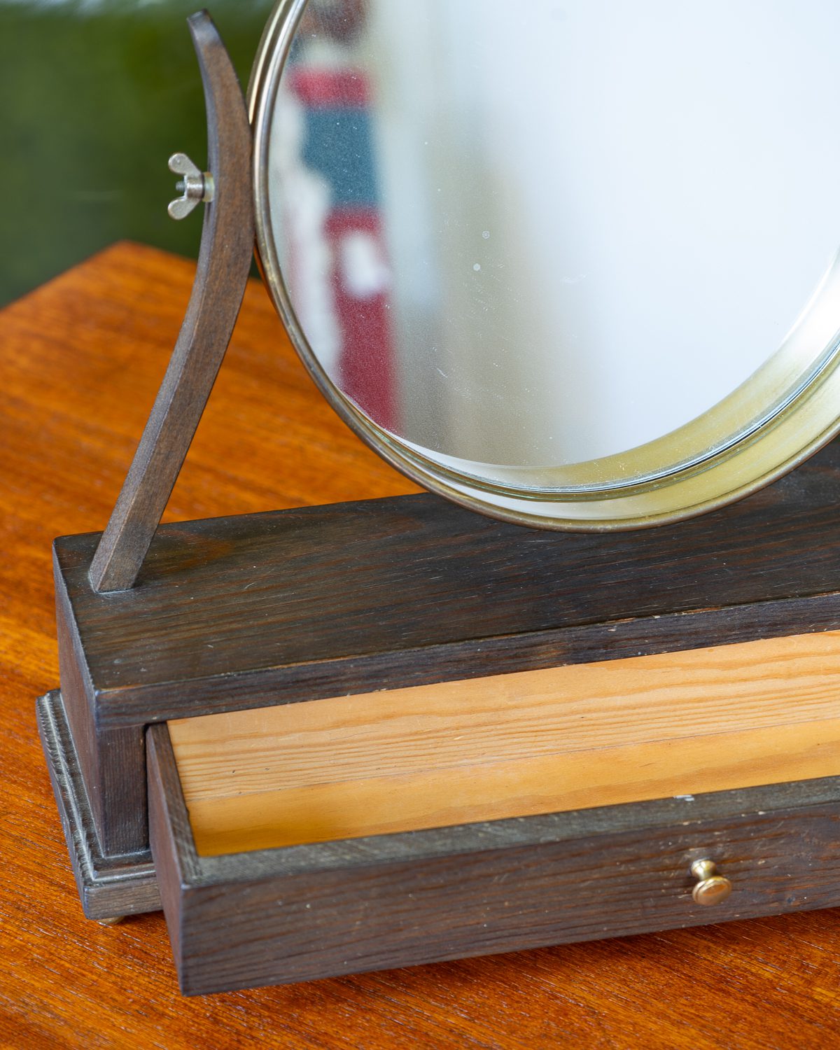 Messingust detailidega puidust väikse sahtliga lauapeegel. Peegli kalle on reguleeritav, muutes selle praktiliseks meigilauale või dekoratsiooniks kummutile. Peegel on heas vintage seisukorras ja väljanägemisega, puitpind ja peegel on terved.