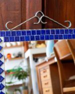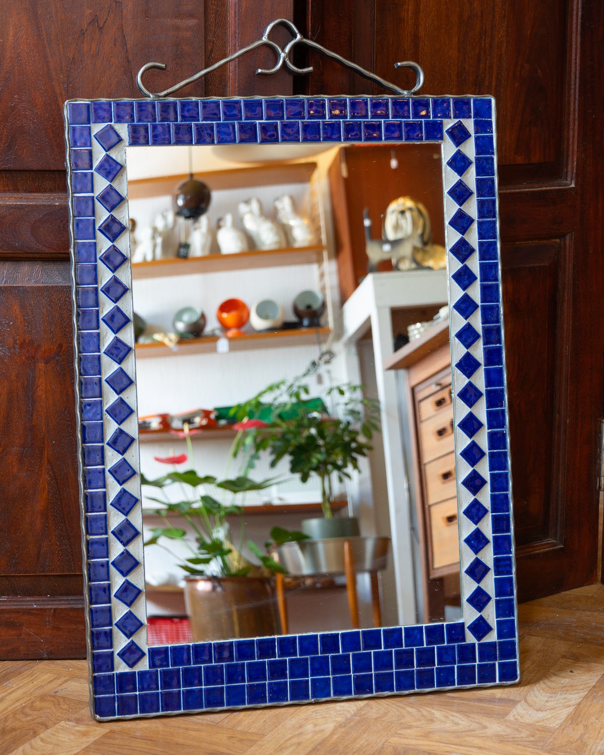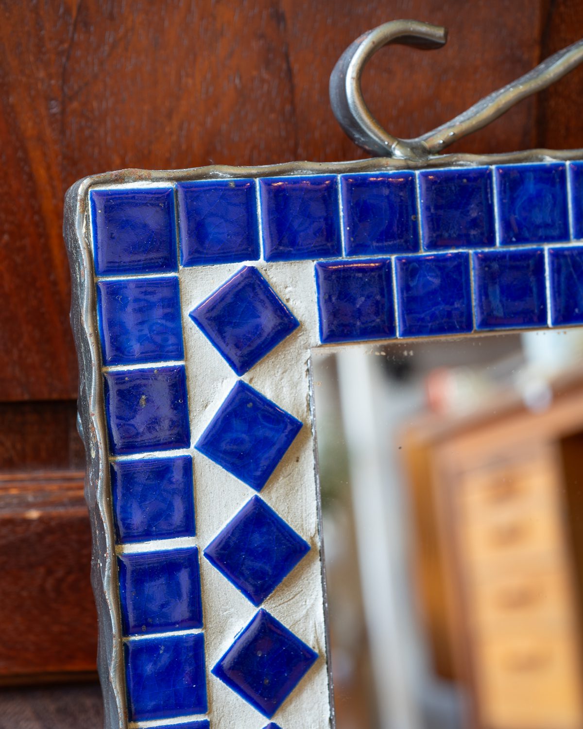 Tumesinise keraamilise mosaiigiga sepistatud raamiga seinapeegel. Peegel on heas korras, keraamilised plaadid ja peegelpind on terved.