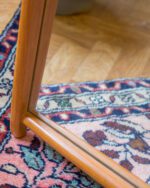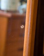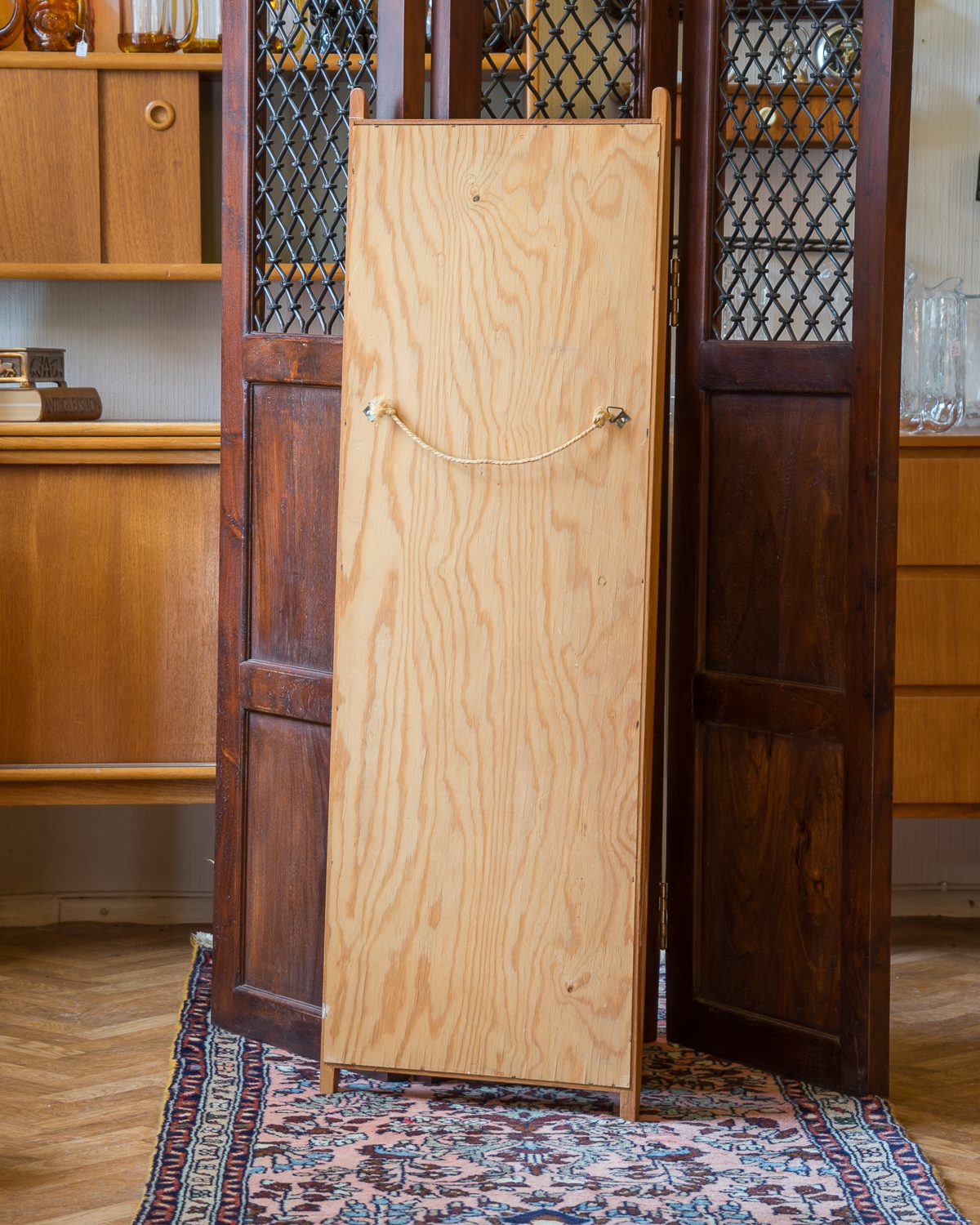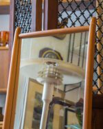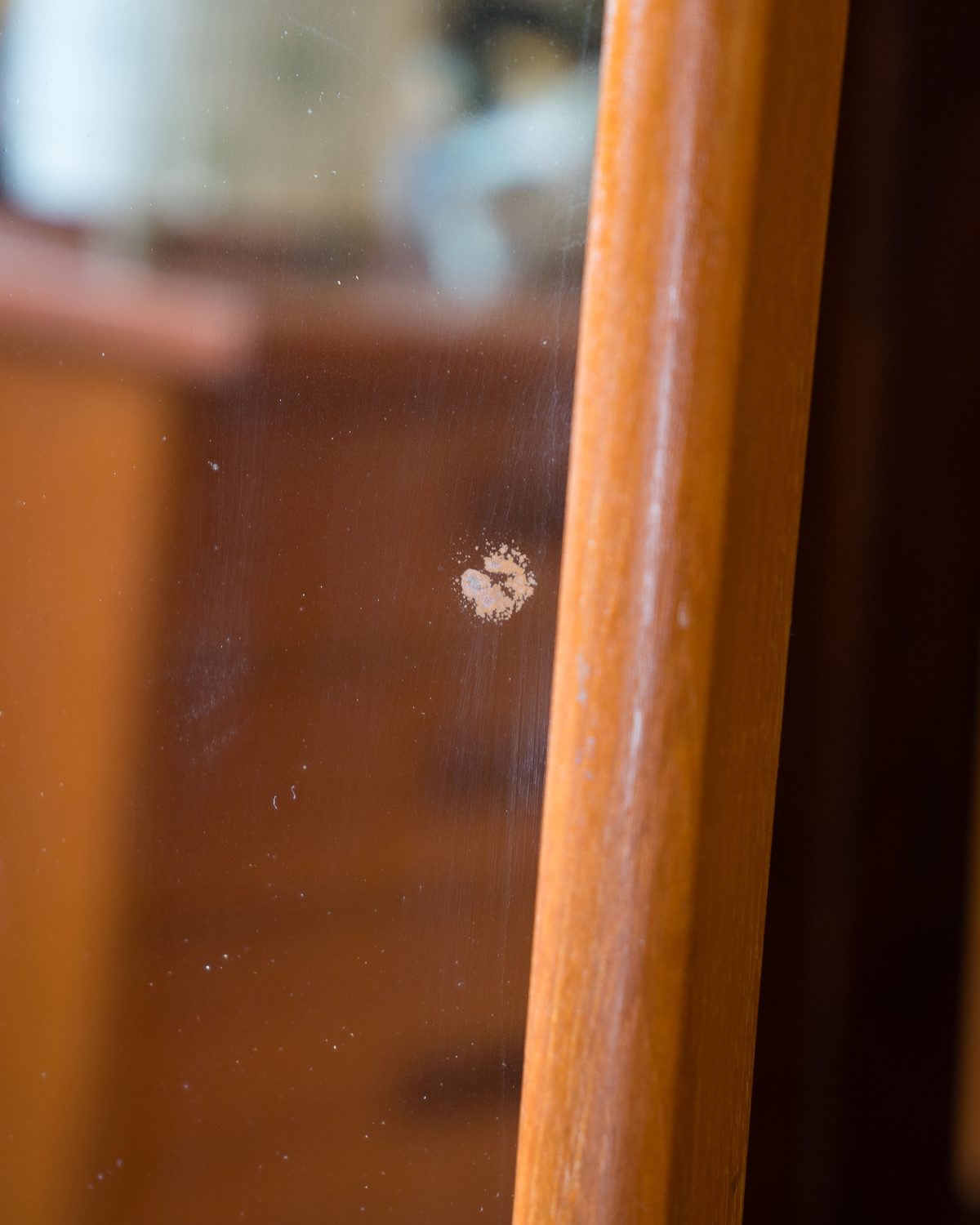 1950ndatest või 1960ndatest pärit peene raamiga tiigipuust seinapeegel. Raami ühes otsas esineb pragu, kuid tegu on vaid visuaalse veaga. Peegli pinnal on üks väike kahjustus, pildilt näha. Muidu väga heas vintage seisukorras.