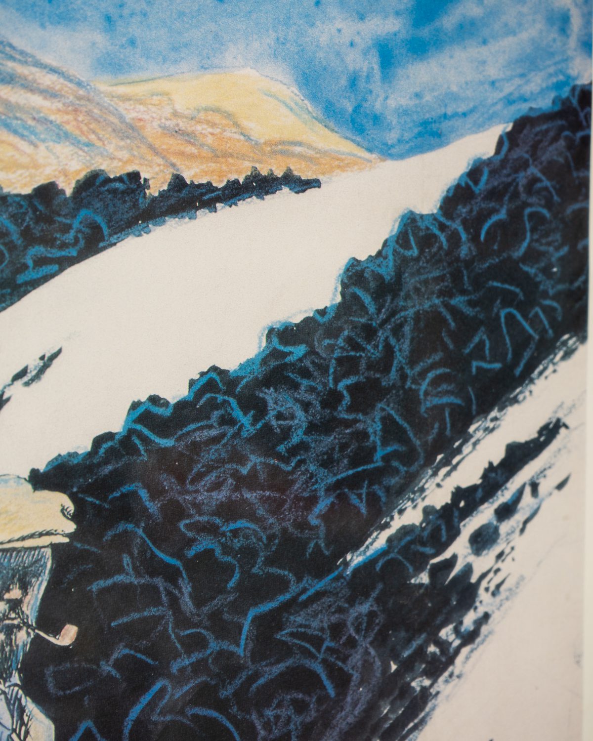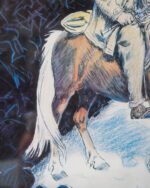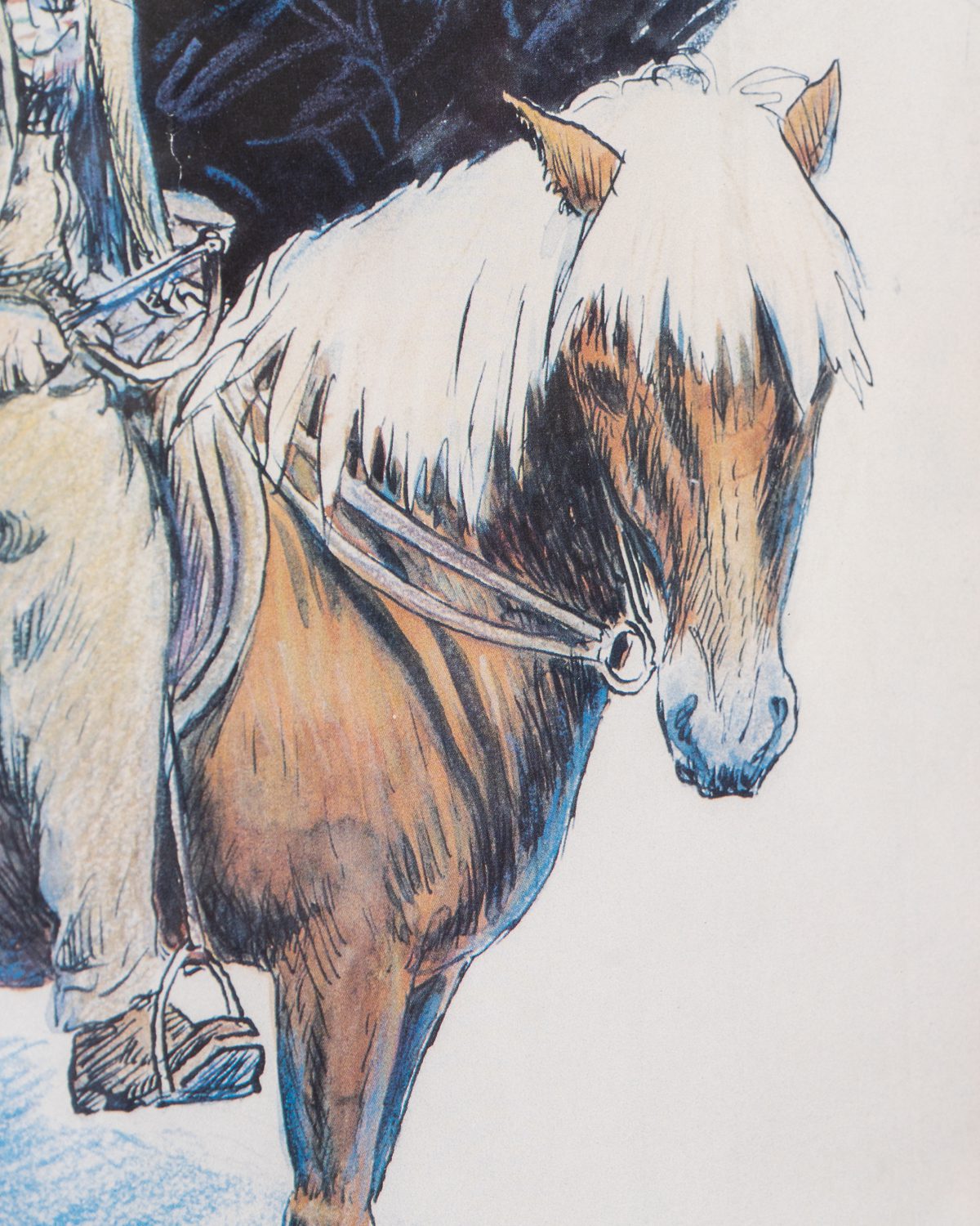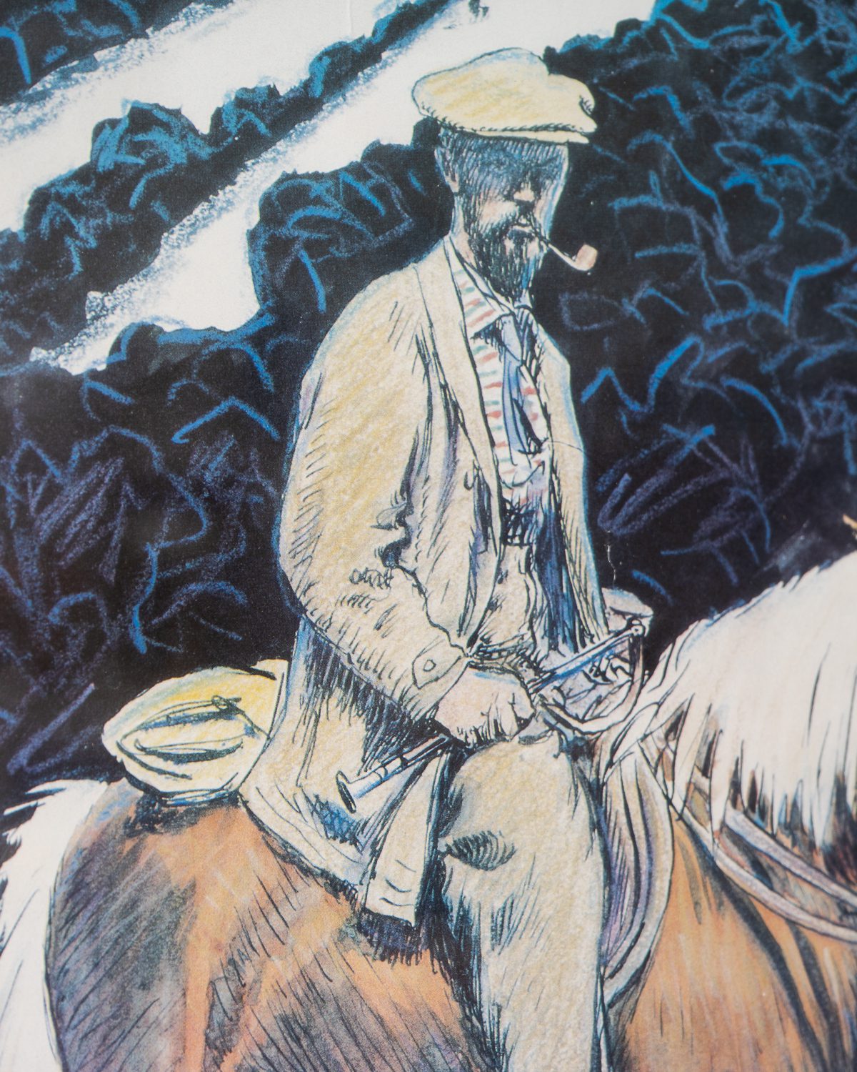Raamitud pastellijoonistus ratsanikust mägedes. Signeerinud Rootsi päritolu kunstnik Albert Engström. Raamil on kulumisjälgi. Klaas ja joonistus on heas korras.