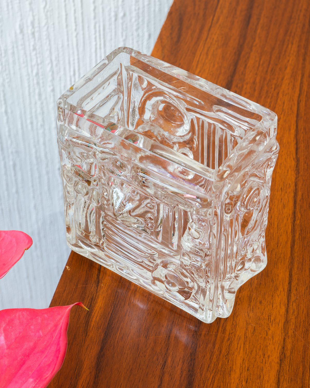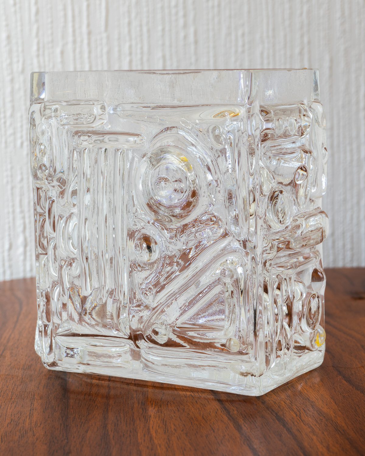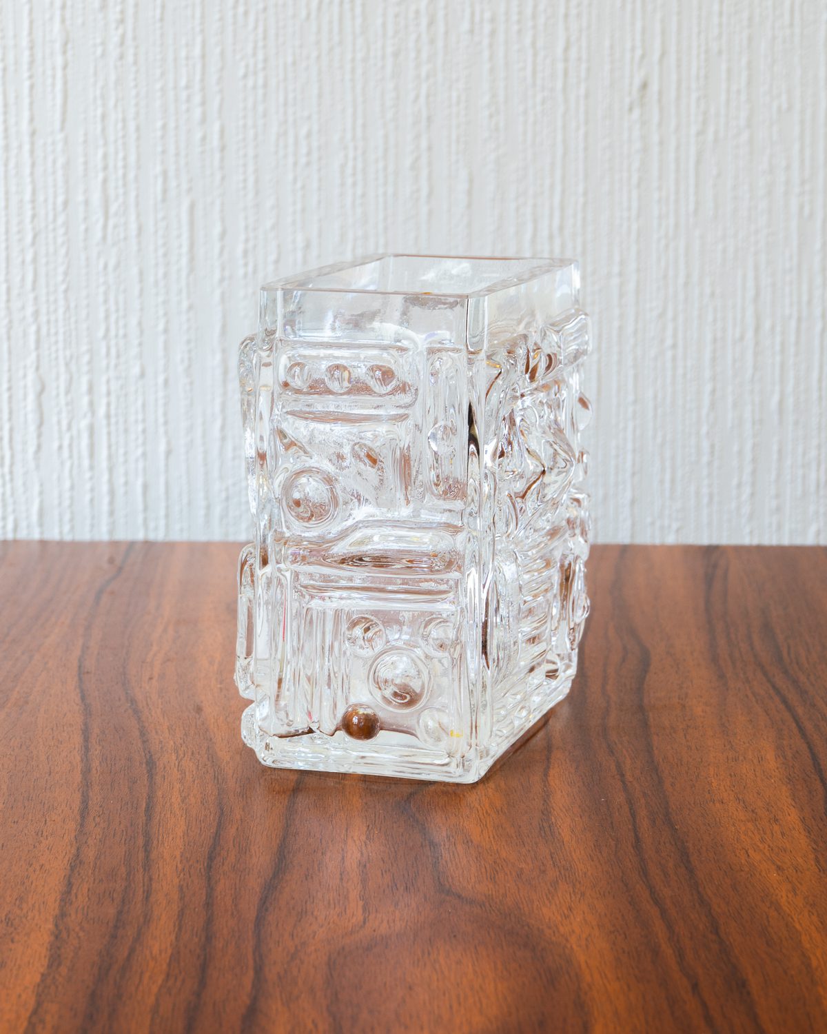 Josef Schotti disainitud geomeetriliste dekooriga klaasist vaas. Toodetud 1960ndatel Rootsis, Smålandshyttani klaasitehases. Vaas on hästi hoitud ja vanusele omaste kulumisjälgedega. Saadaval sarnases stiilis suurem ja värvilisest klaasist vaas.