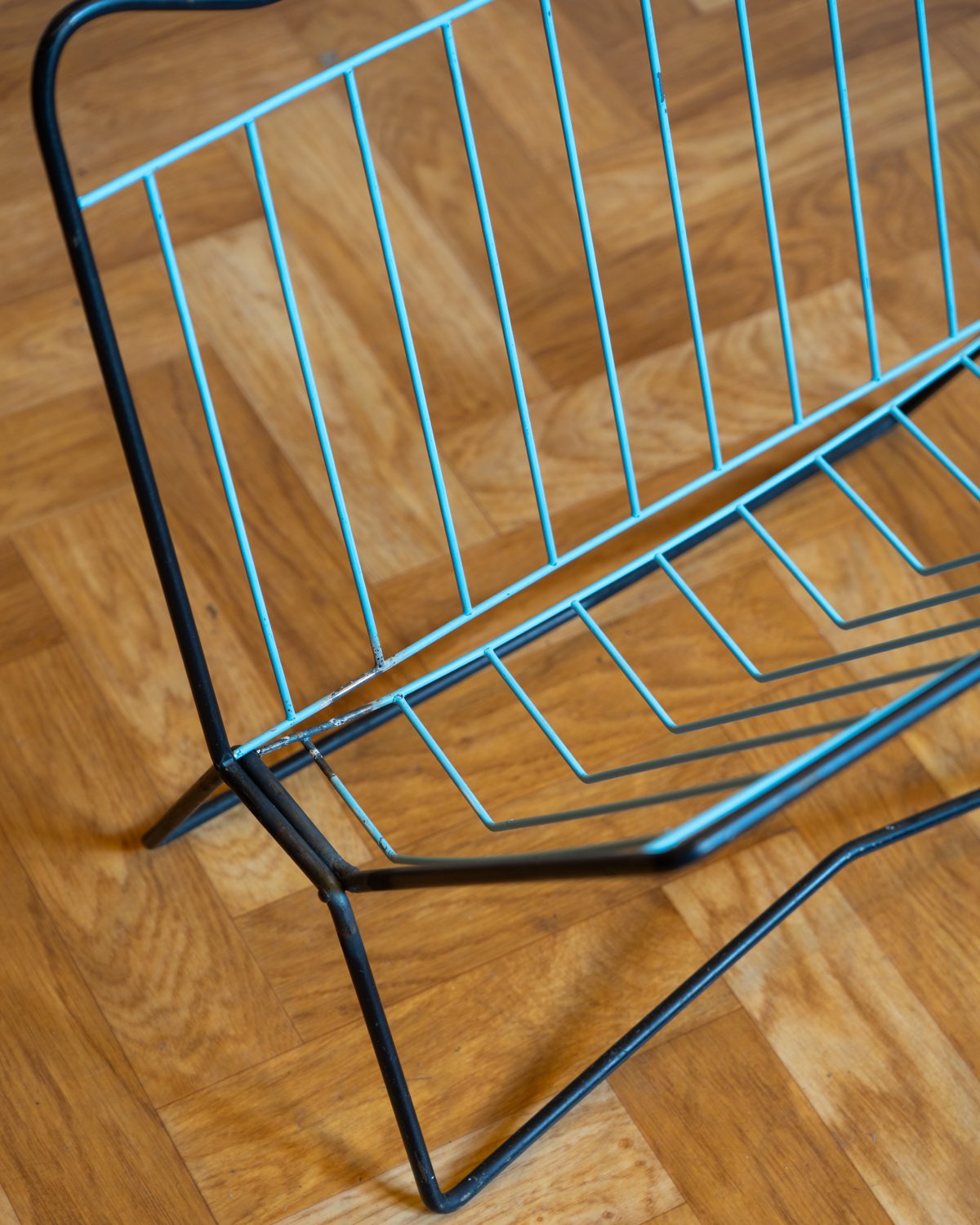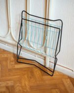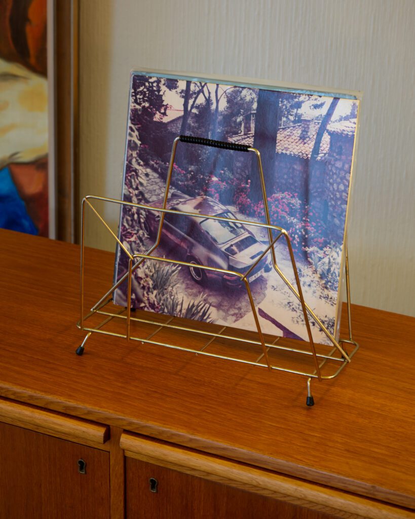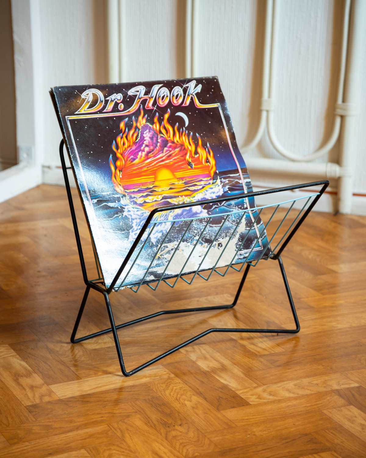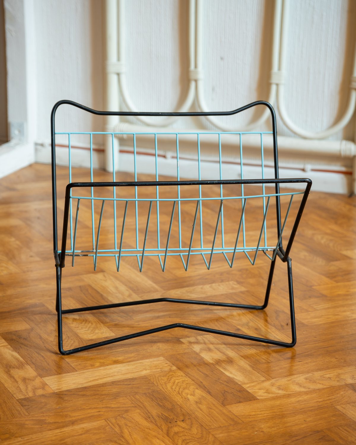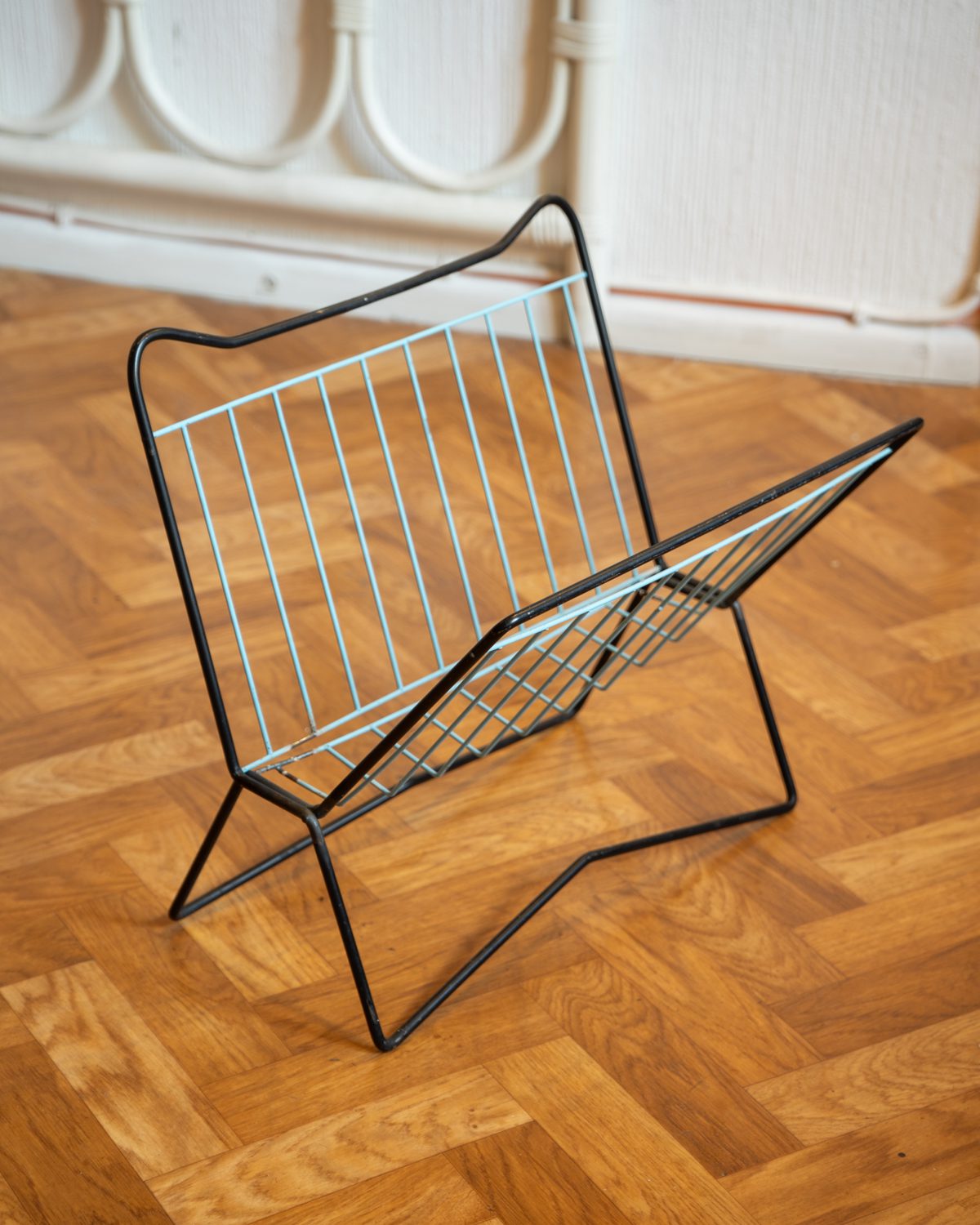 Vintage kokkuklapitav ajakirjahoidja, mis sobib suuruselt hästi ka vinüülidele. Leidub värvikahjustusi, (vt pilte) kuid töötab hästi.
