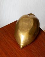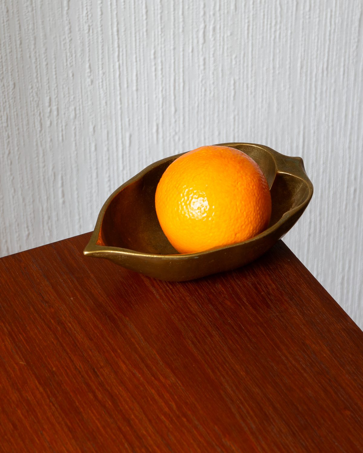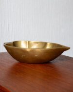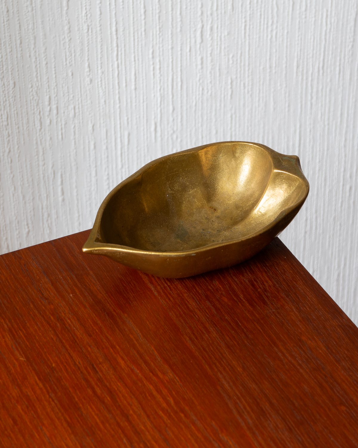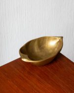 Detailse vormiga lehekujuline messingust kauss, mis on ühtaegu nii dekoratiivne kui ka praktiline sisustuselement. Kausi pinnal esineb ajastule omaseid kulumisjälgi, mis rõhutavad eseme ajalugu ja annavad sellele sooja, autentse vintage-karakteri.