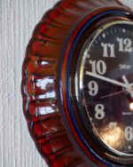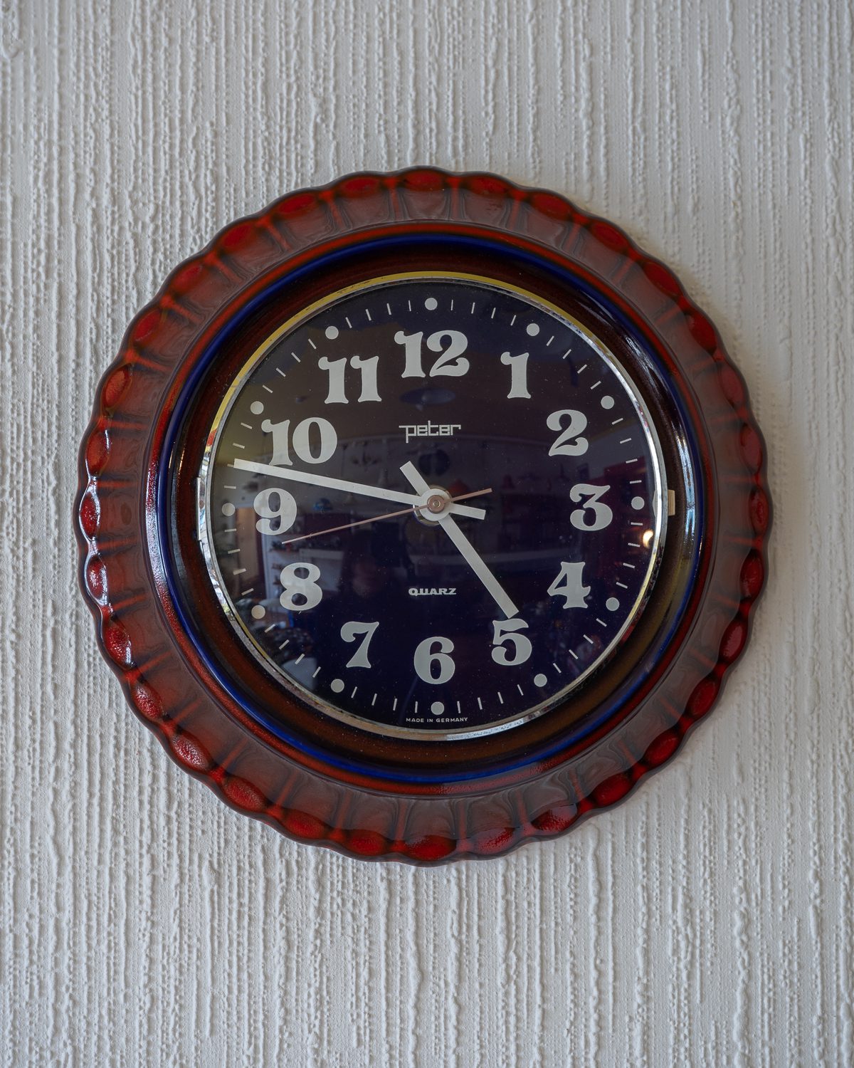 Keraamiline seinakell sinise kellaplaadi ja valgete seieritega. Valmistatud Saksamaal. Töötab ühe A/1,5V patareiga.