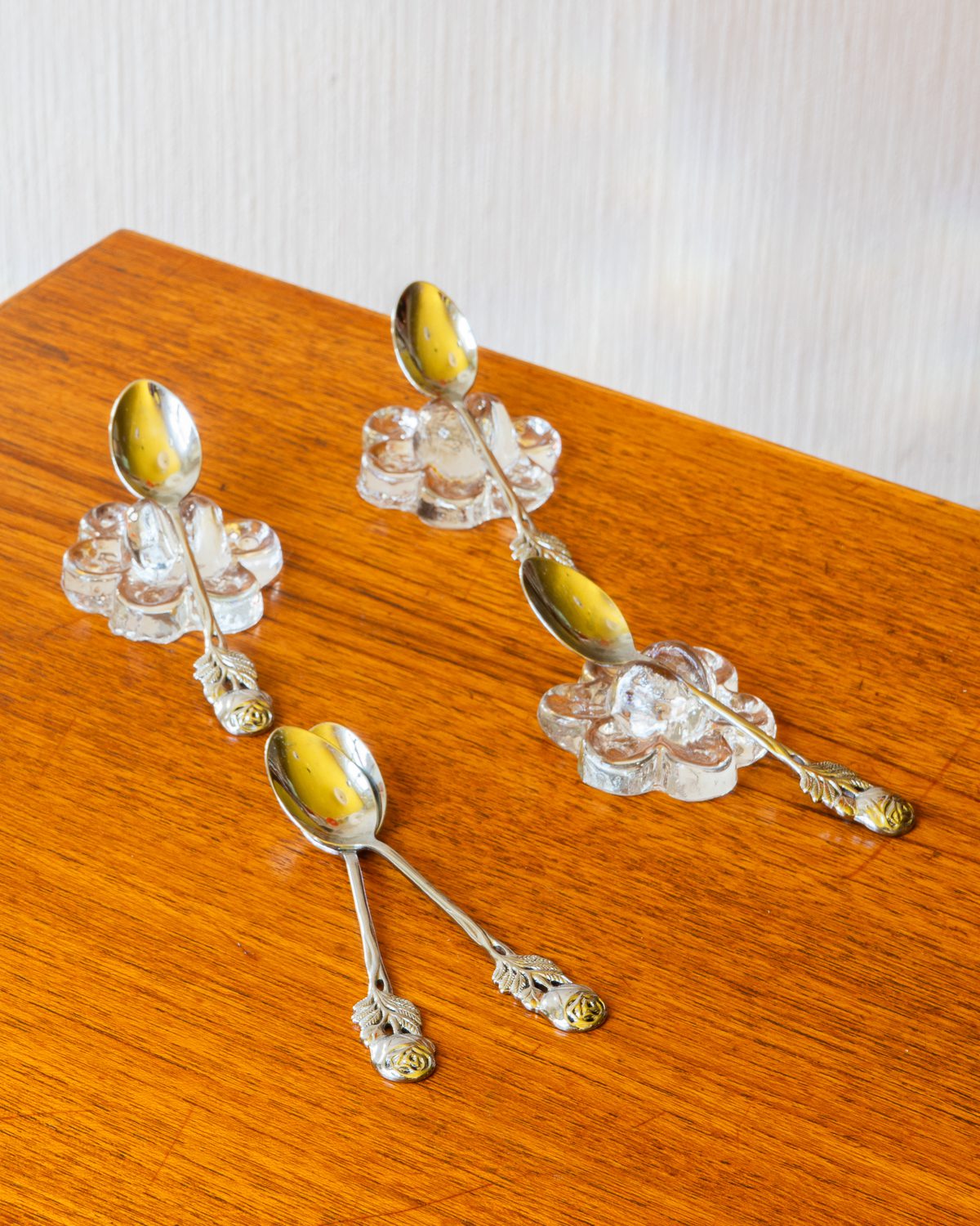 Roosimotiiviga kaunistatud teelusikad. Komplekti kuulub kuus hästi hoitud ja vanusele omaste kasutusjälgedega lusikat.
