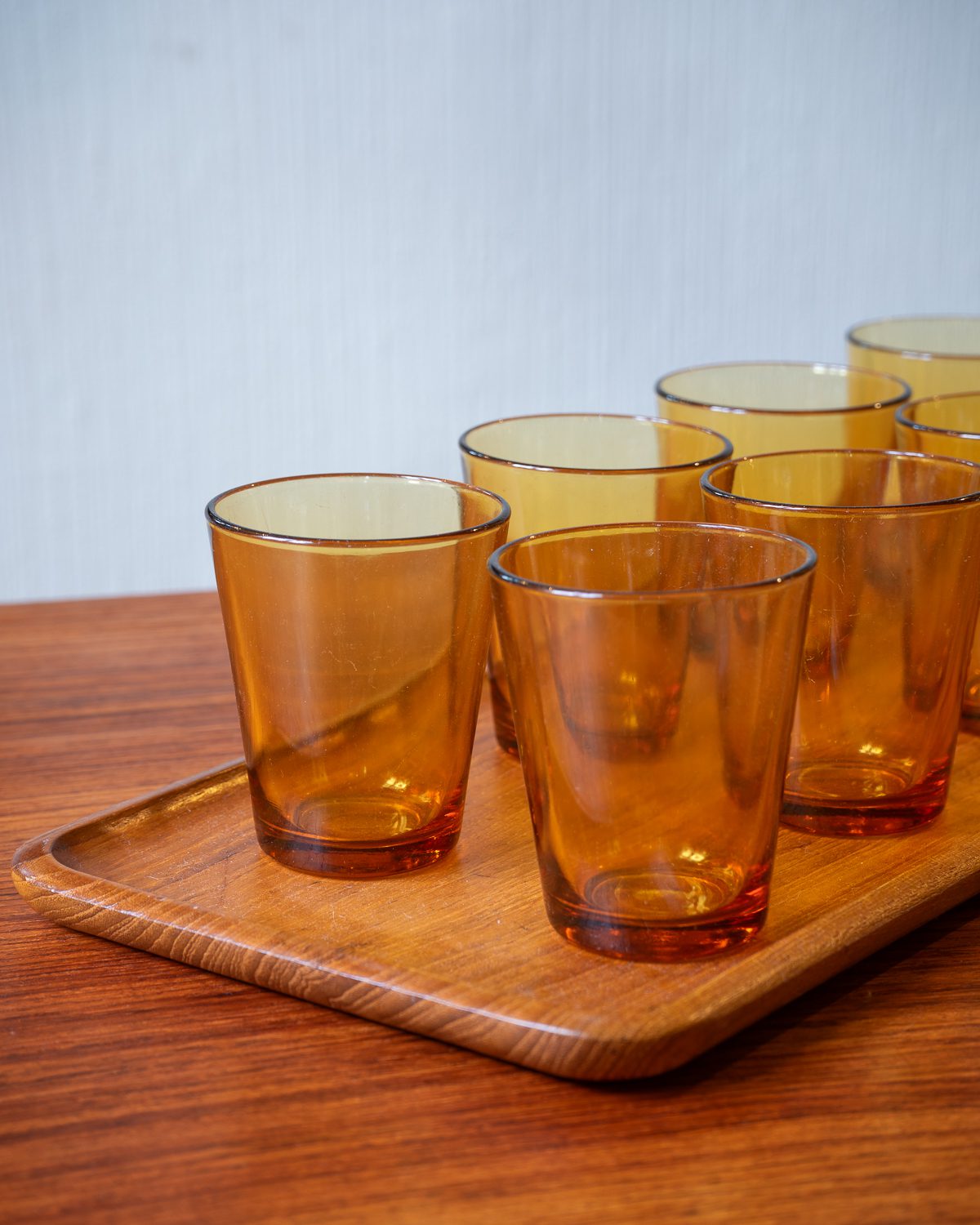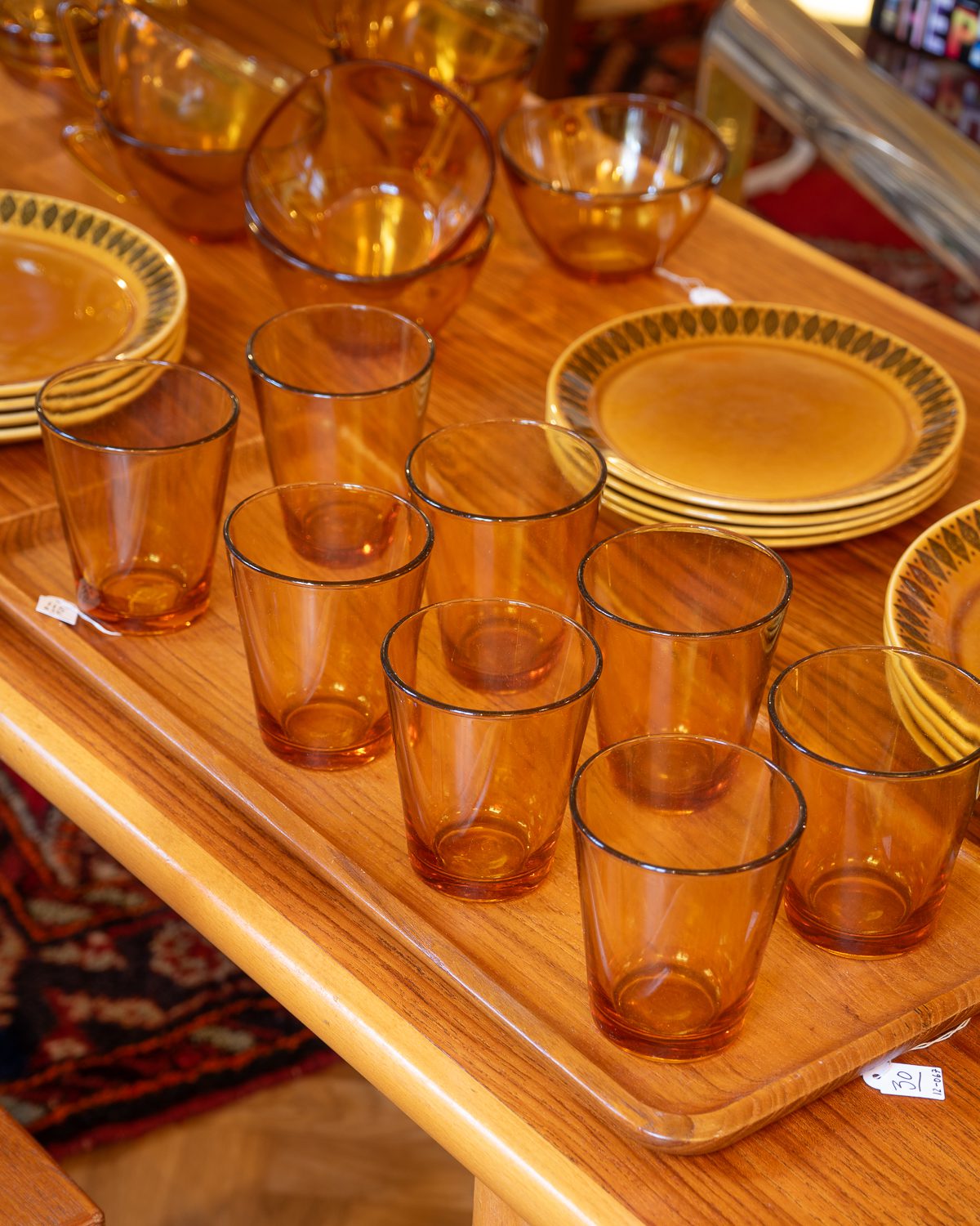 8 merevaigutooni karastatud klaasist joogiklaasi. Toodetud Prantsusmaal Vereco poolt 1970ndatel. Väga heas korras. Saadaval on ka samast seeriast tassid.