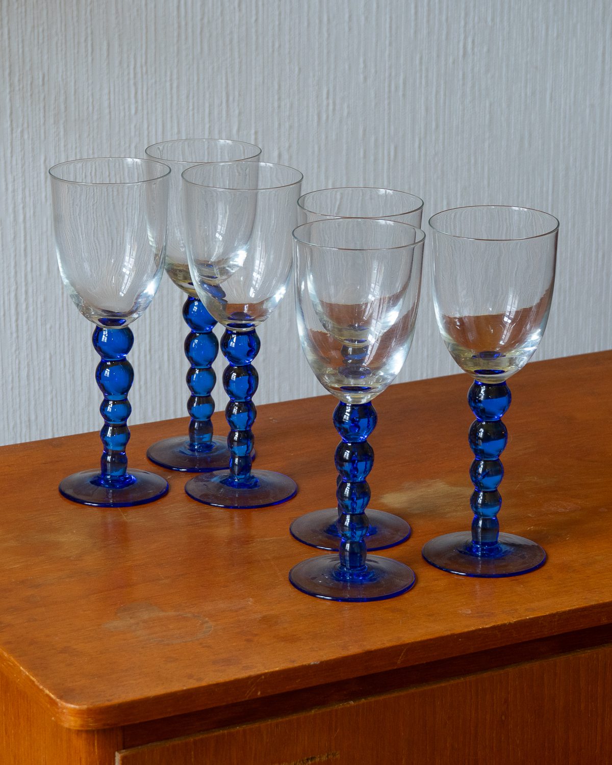 Kuueosaline komplekt veiniklaase, mille muudavad eriliseks ja mänguliseks nende mummulised jalad. Heas korras.