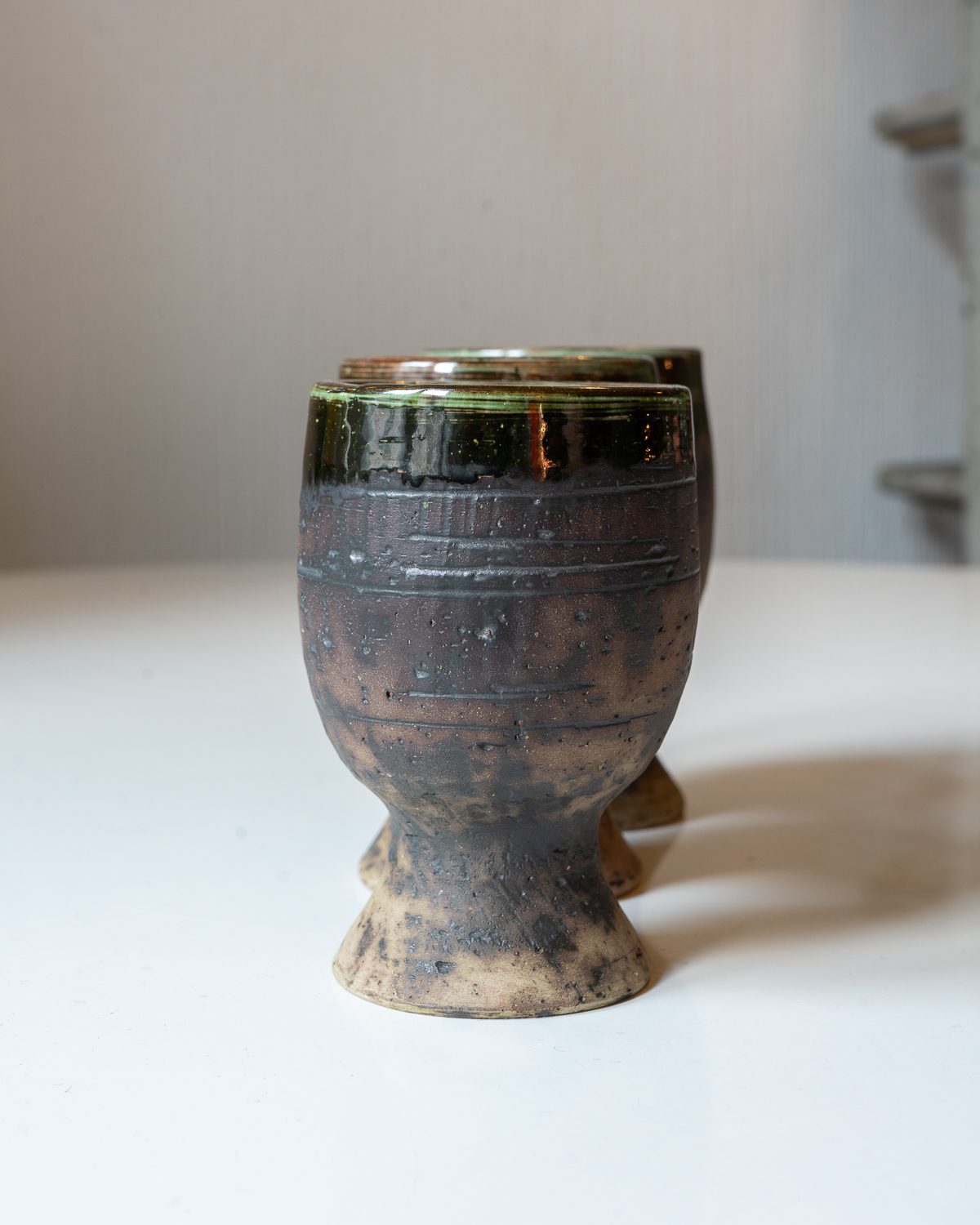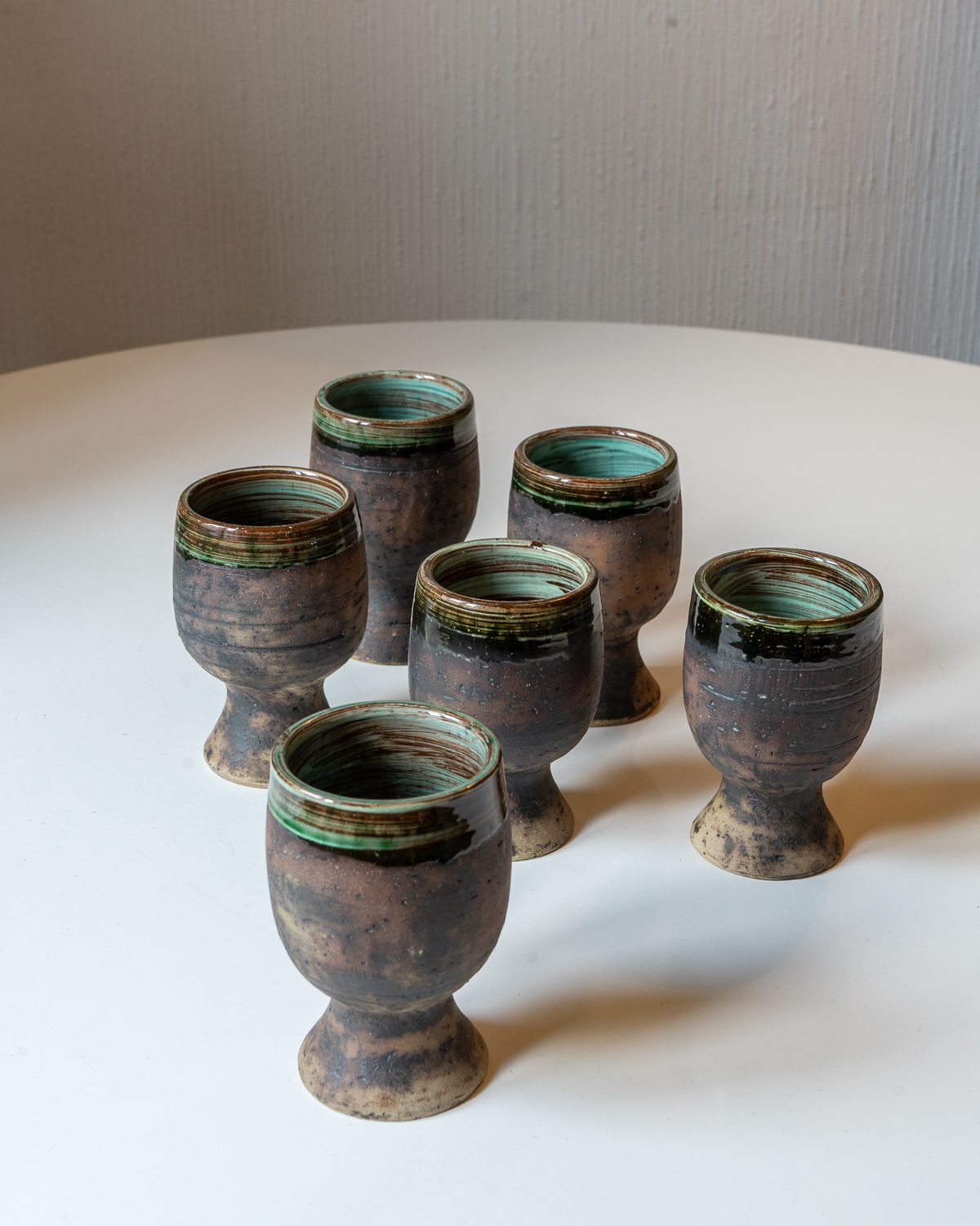 Rootsis, Visby kandis käsitööna valmistatud keraamilised pokaalid. Komplekti kuulub kuus hästi hoitud ja väheste kasutusjälgedega pokaali. Viiel pokaalil kuuest on põhja all kedrakeraamikas levinud kuivamisel tekkiv (pinnapealne) s-kujuline pragu. Hind kehtib kuue pokaali kohta.
