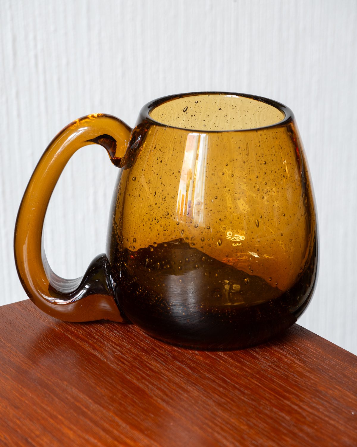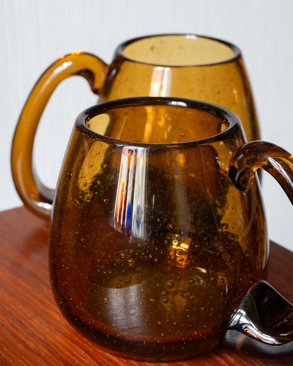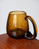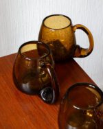 Käsitööna valminud suure ja mugava sangaga klaasist tassid. Komplekti kuulub kolm tassi, mis on heas seisukorras ning millel esineb vaid vähesel määral ajale omaseid kulumisjälgi. Hind kehtib ühe tassi kohta.