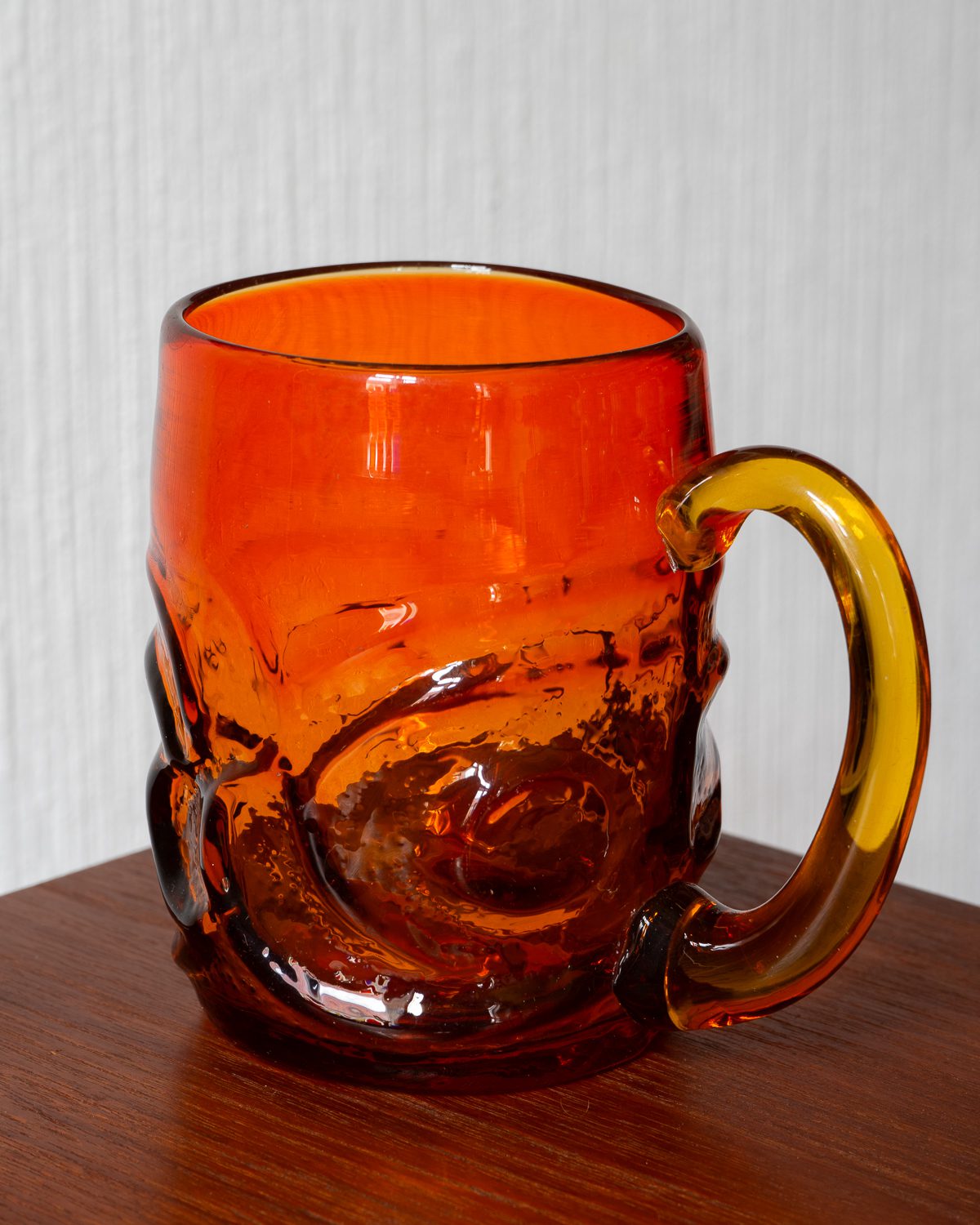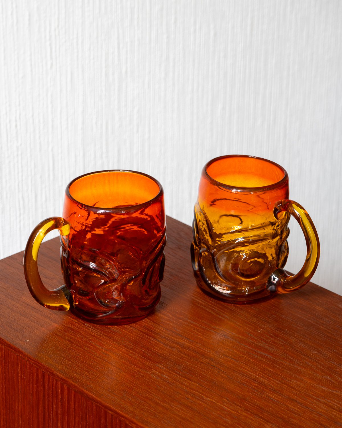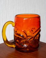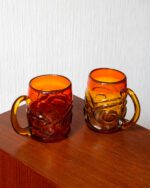 Pinnareljeefidega oranžist klaasist tassid, mis püüavad pilku oma erksa värvi ja tekstuuriga. Komplekti kuulub neli tassi, mis on heas seisukorras ning millel esineb vaid väheseid, ajale omaseid kulumisjälgi. Hind kehtib ühe tassi kohta.