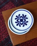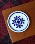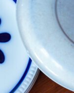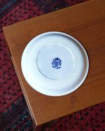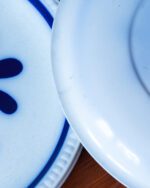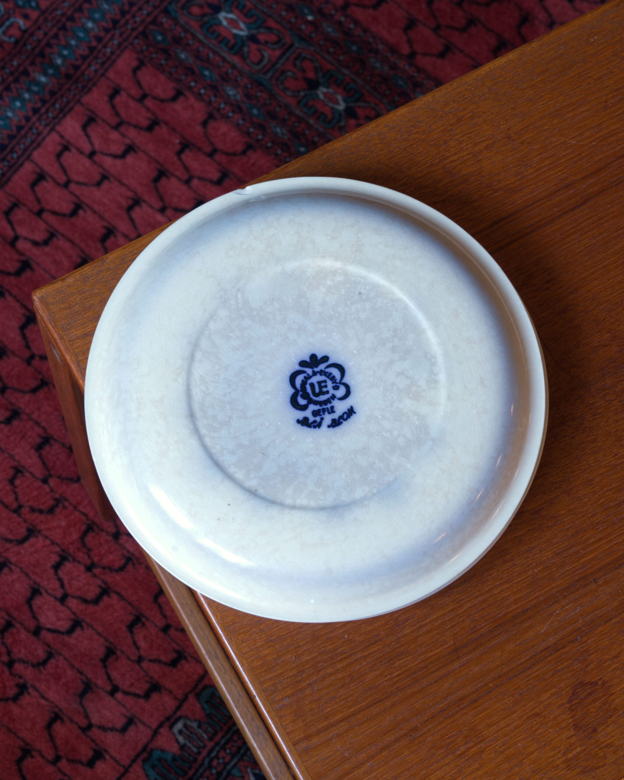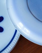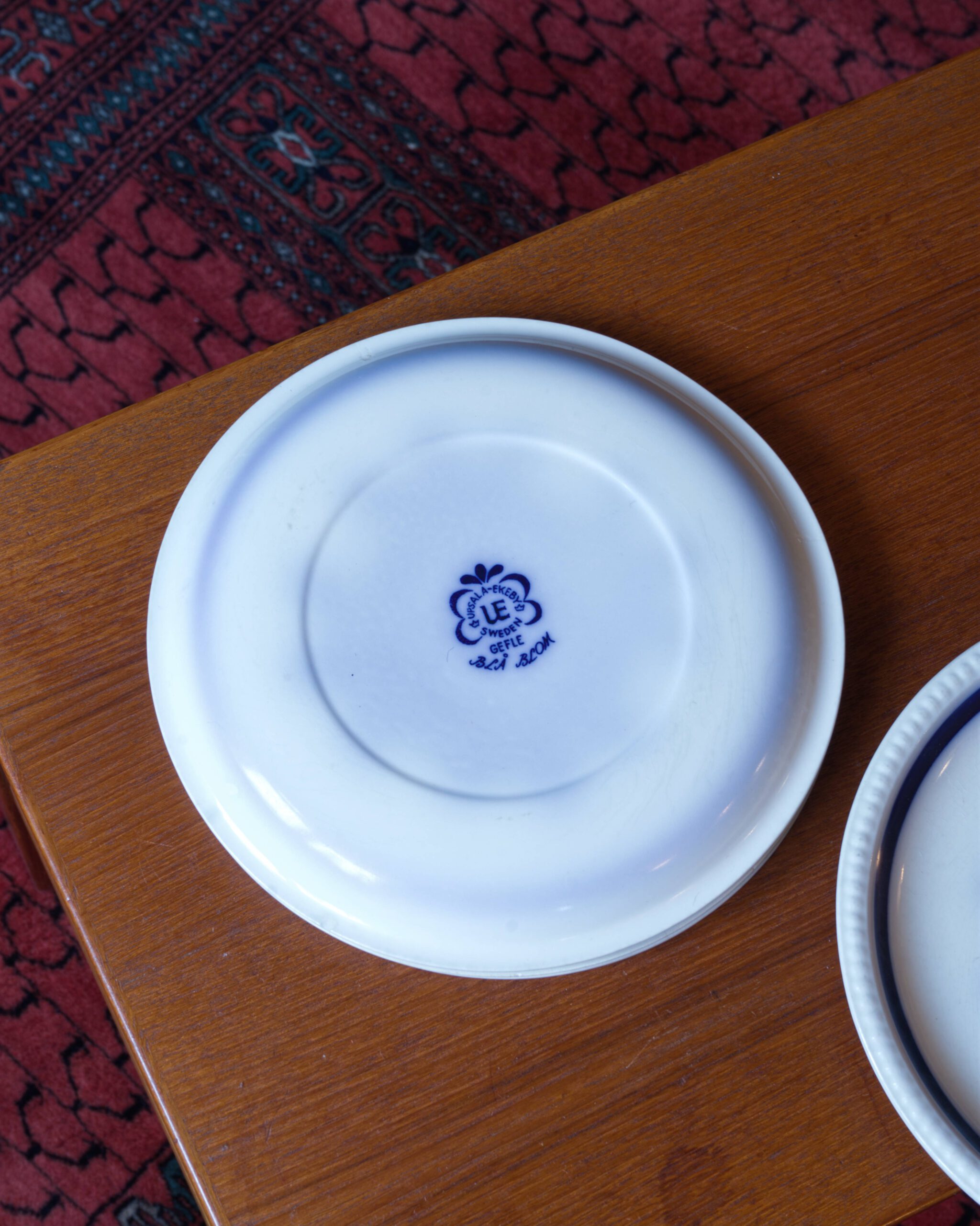 Portselanist taldrikud Blå Blom-nimelisest seeriast. Valmistatud Rootsis Upsala-Ekeby portselani- ja klaasitehases. Komplekti kuulub viis taldrikut. Osade taldrikute põhjal on alumise taldriku sinise pigmendi jälg (vt pildilt). Paaril taldrikul on äärest kild väljas (vt pildilt).
