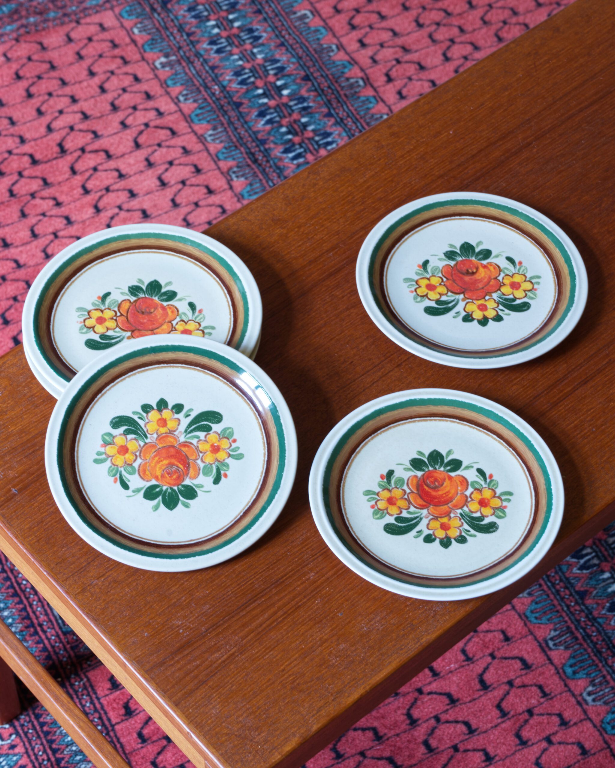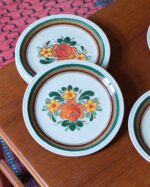 Käsitsi maalitud keraamilised suupistetaldrikud. Valmistatud 1970ndatel Saksamaal, Winterling Röslau portselanitehases. Komplekti kuulub viis taldrikut.