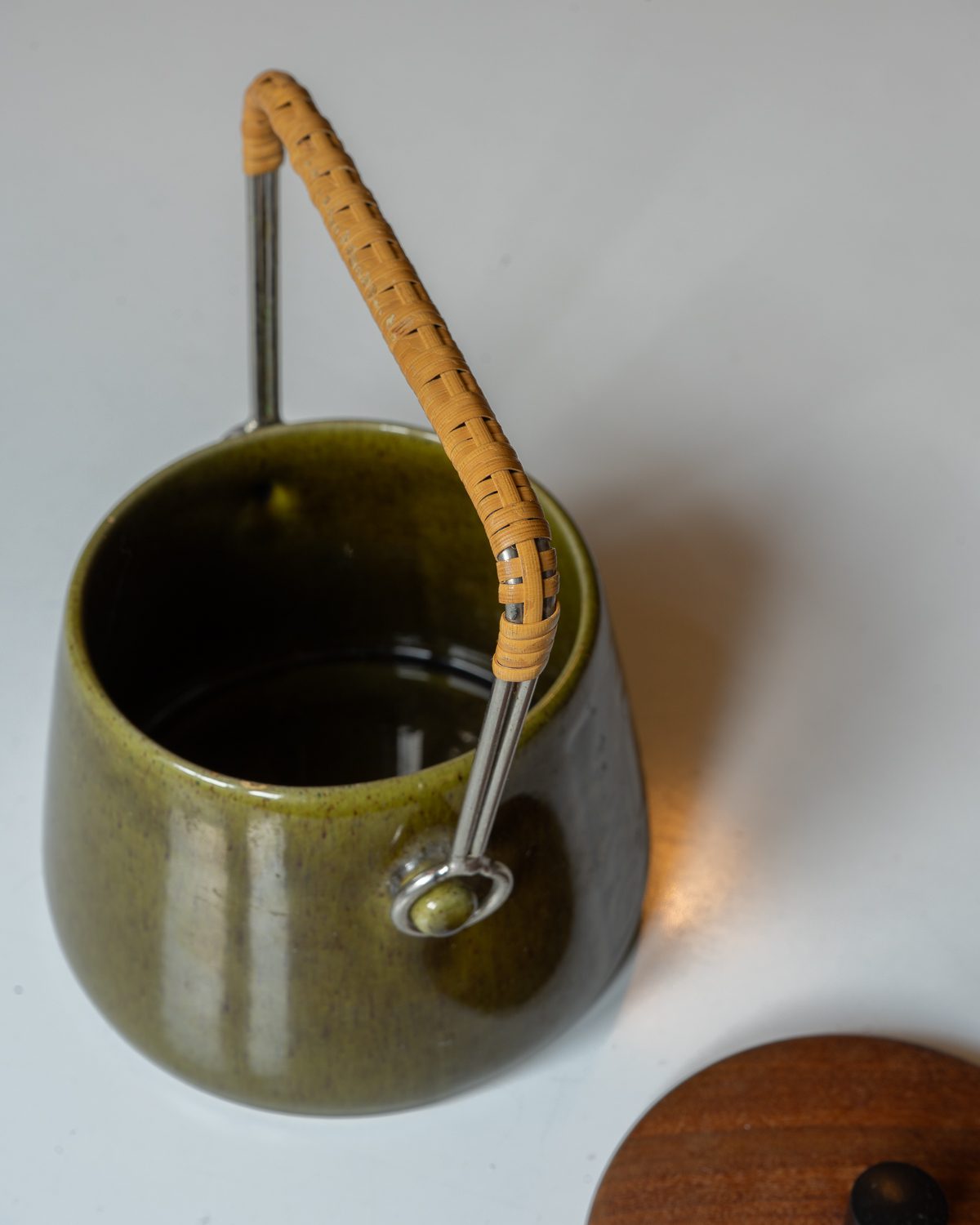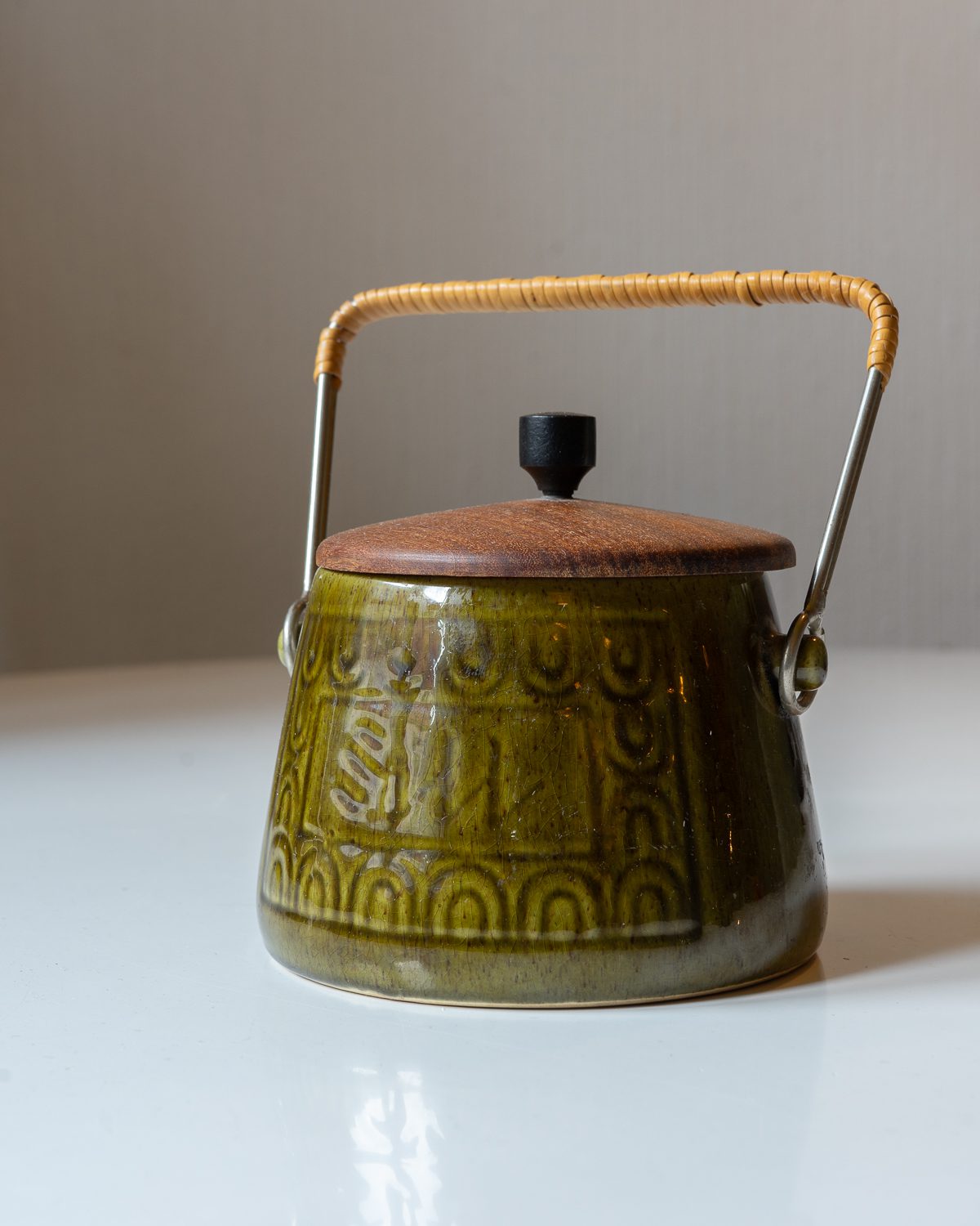 Keraamilise keha ja puidust kaanega toos. Toodetud 1960ndatel Rootsis, Deco keraamikatehases. Toosi ülemisel serval on näha paari väikest täket glasuuri sees. Muidu on toos hästi hoitud ja vanusele omaste kasutusjälgedega.