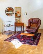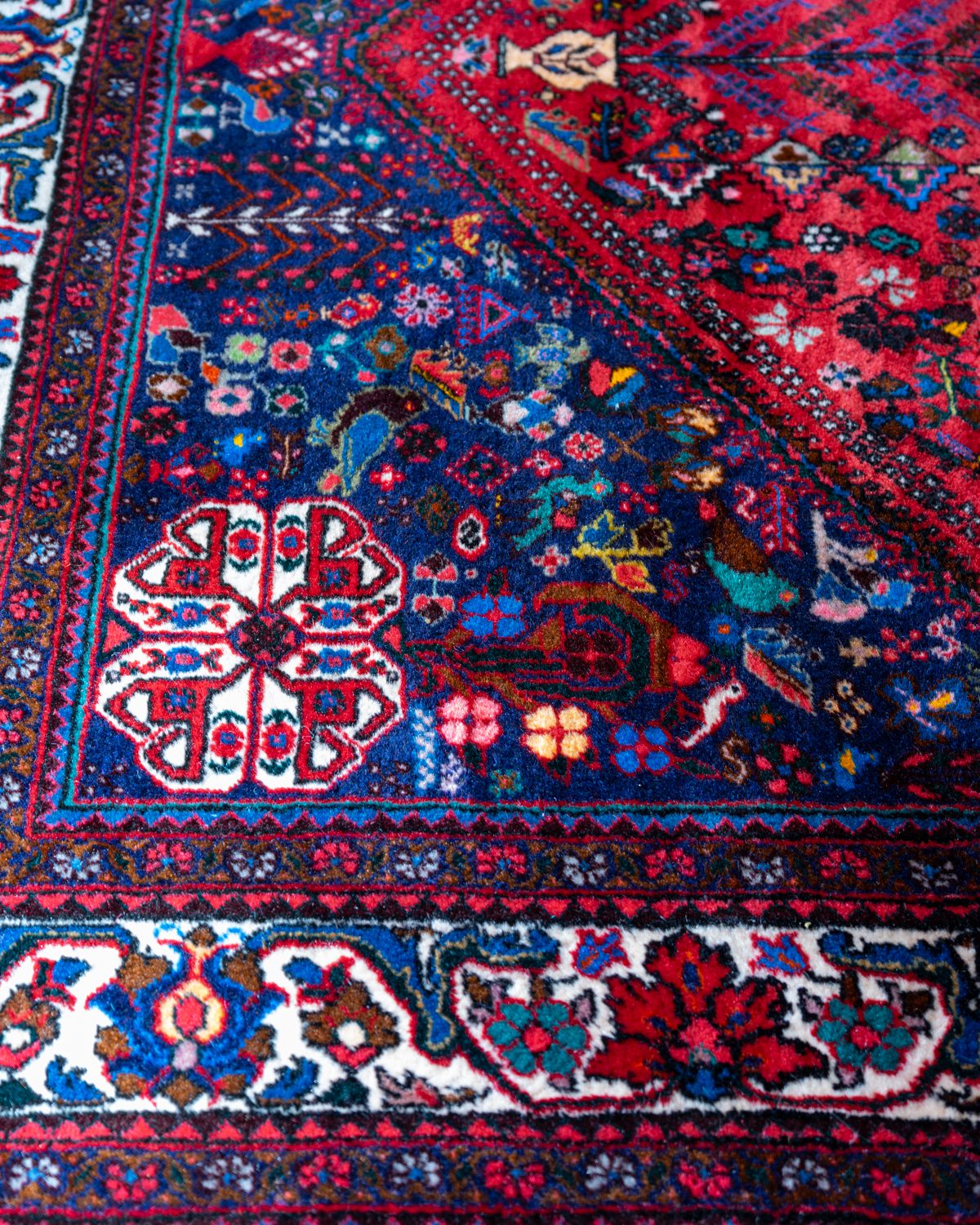 Tiheda mustriga kirju Pärsia vaip. Väga erksate värvidega, mustris palju erinevaid lilli ja linde. Vaiba küljed on altpoolt nahaga ääristatud ja kuigi nahk on kahest kohast katkenud, ei ole see vaiba vormile mõjunud. Pesumajas märgpestud.