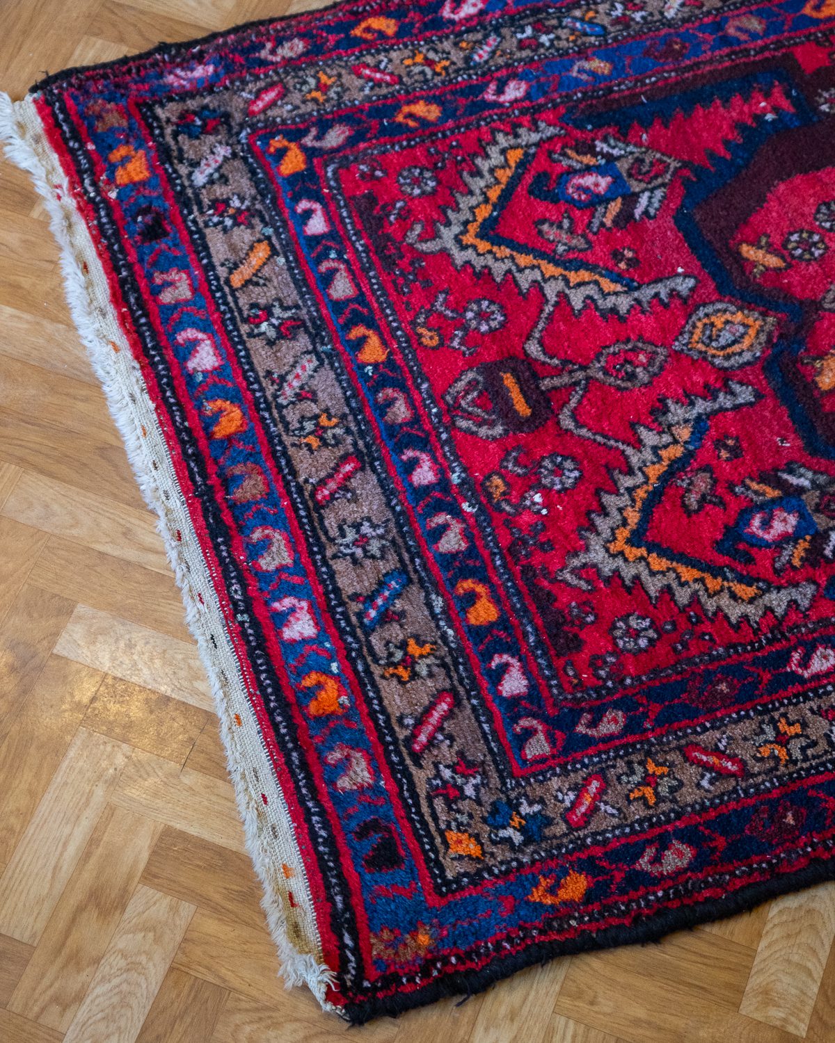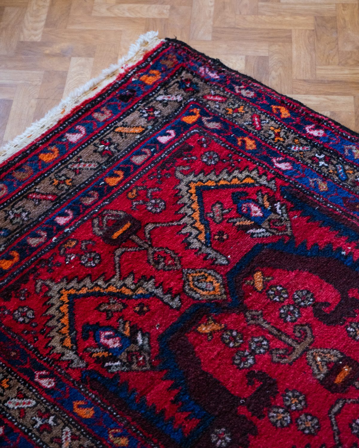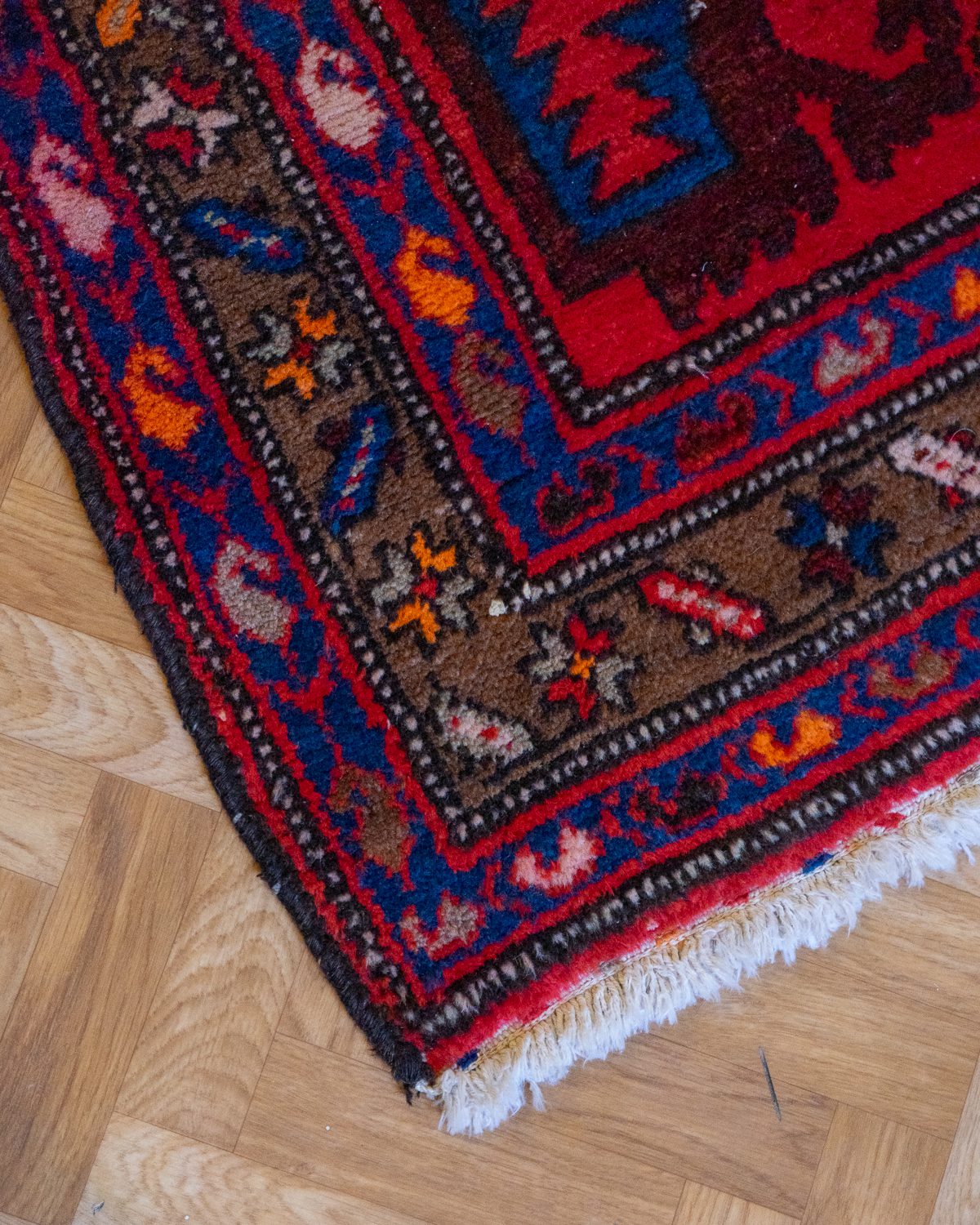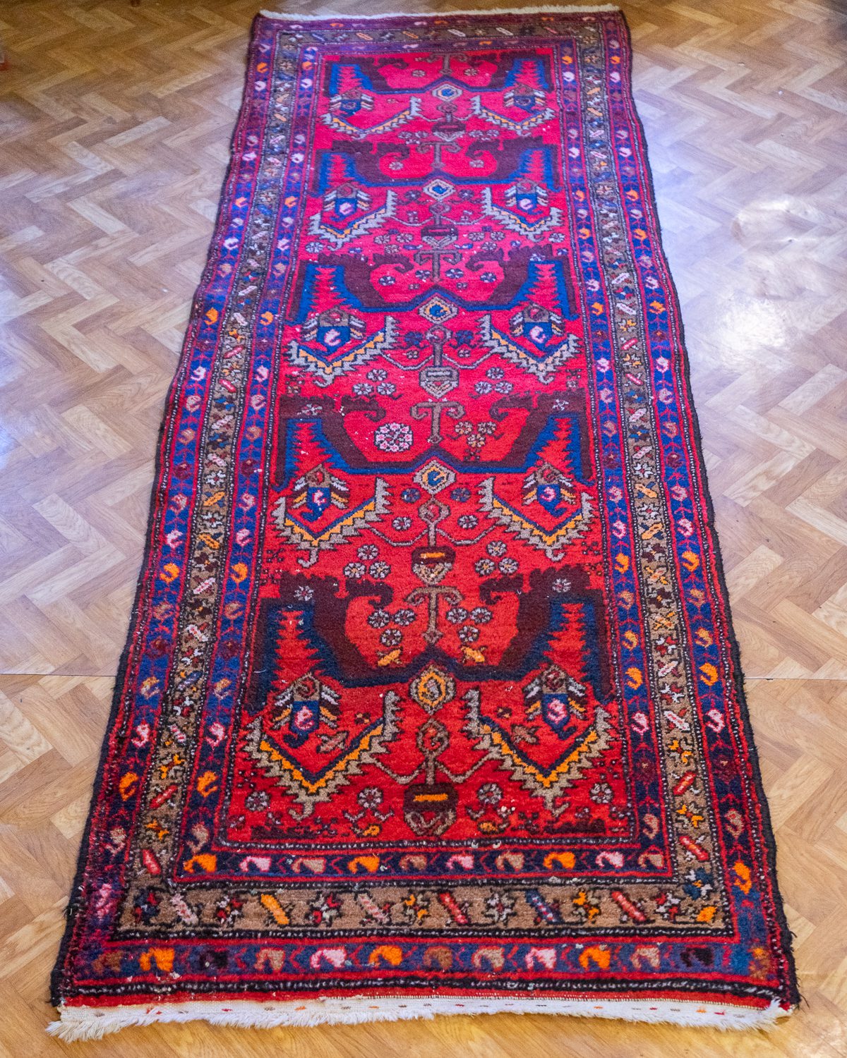 Villane ja käsitööna valminud Pärsia laiema suurusega runner. Heas seisukorras, kuigi mõnes kohas on villane osa ajaga kulunud.
