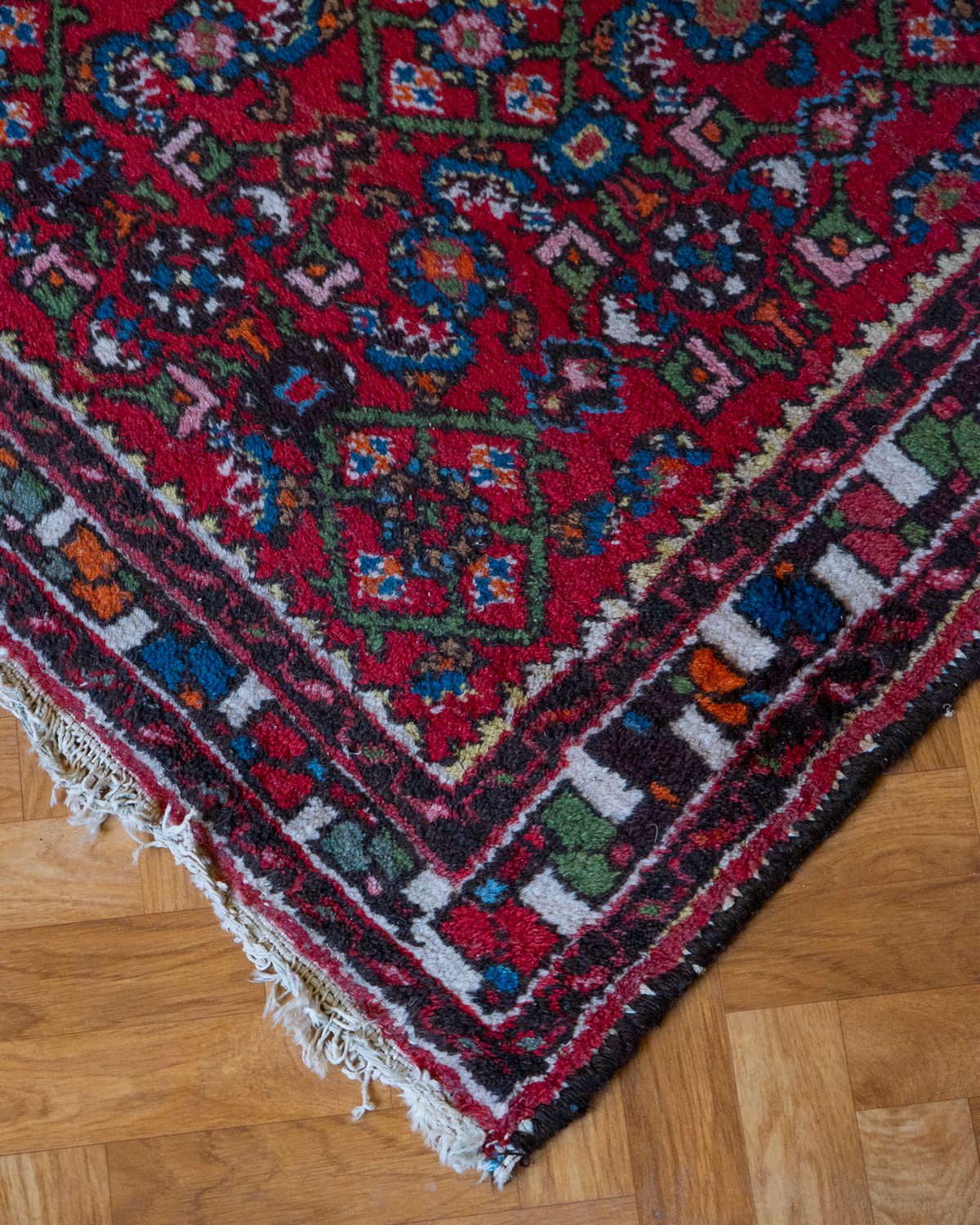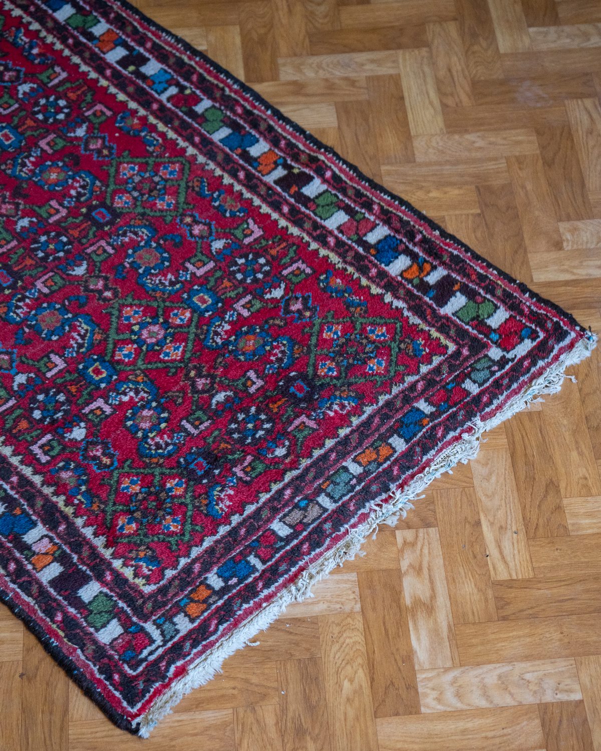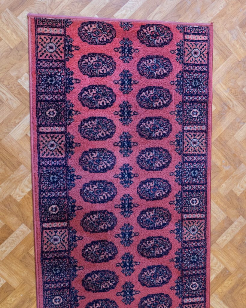 Väärikalt kulunud roosakates ja punakates toonides runner, kohati on narmad lahti tulnud. Vaip on hetkel märgpuhastuses, kuid on peagi valmis uude kodusse minema.