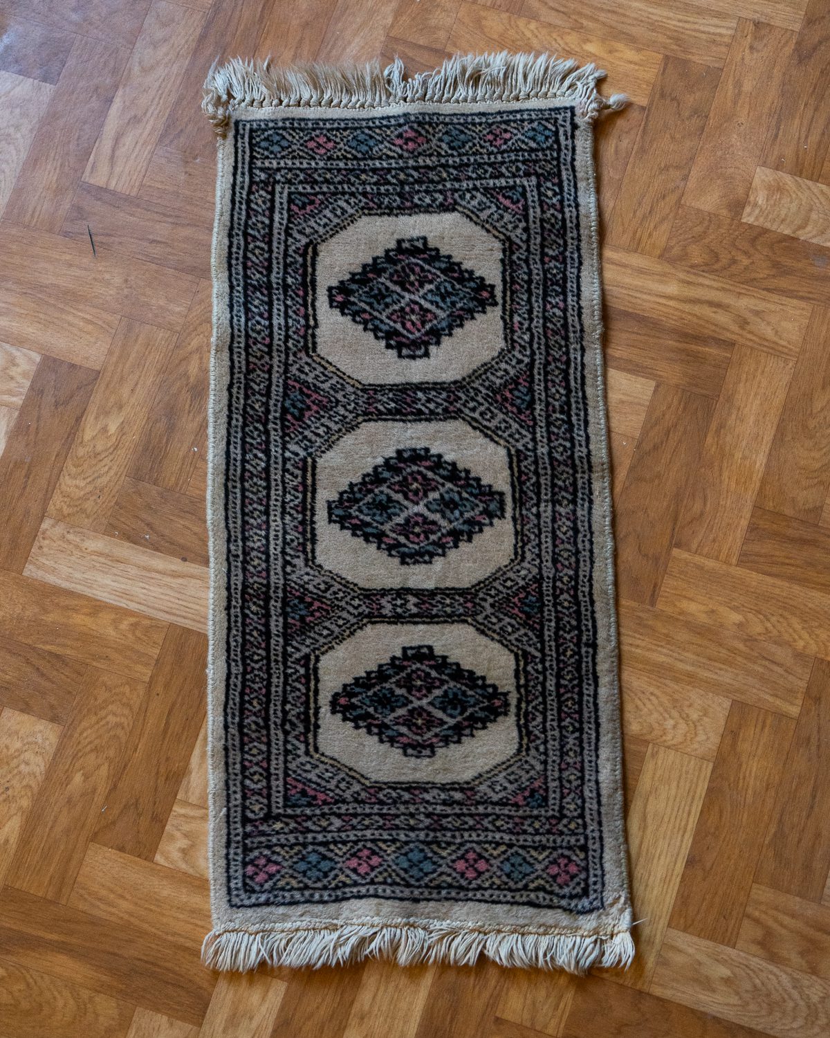 Väike villane Bokhara käsitöövaip Türkmenistanist. Heas korras väike vaip esikusse, vannituppa või koduloomale pikutamiseks.