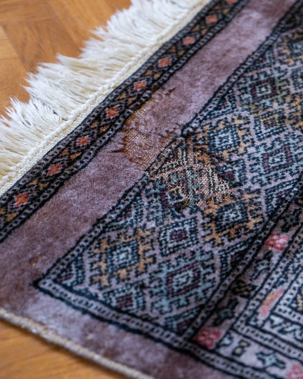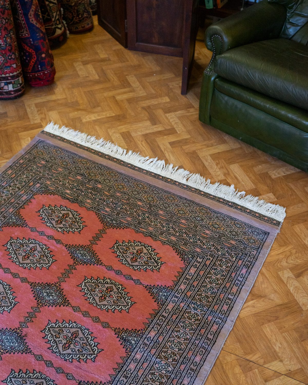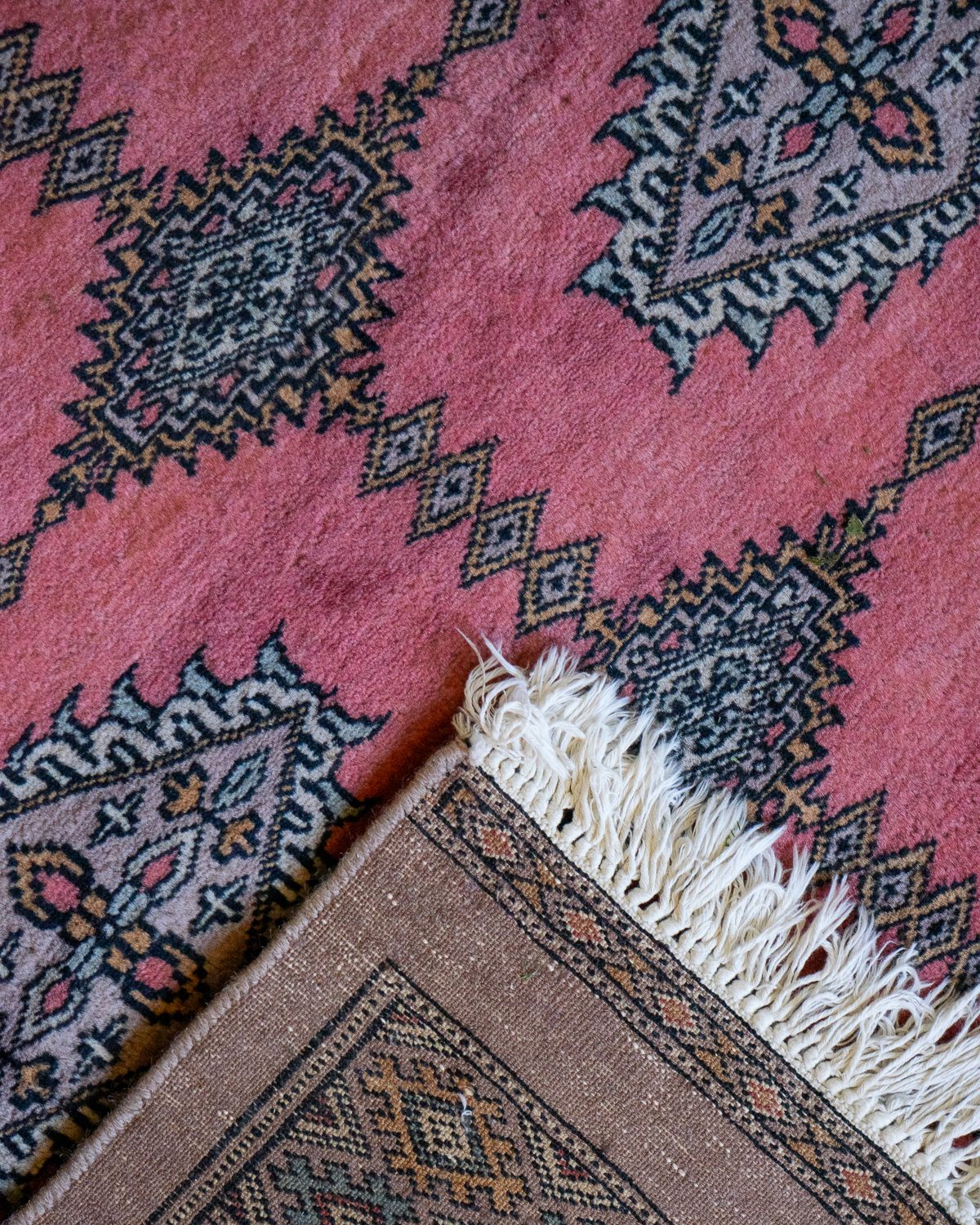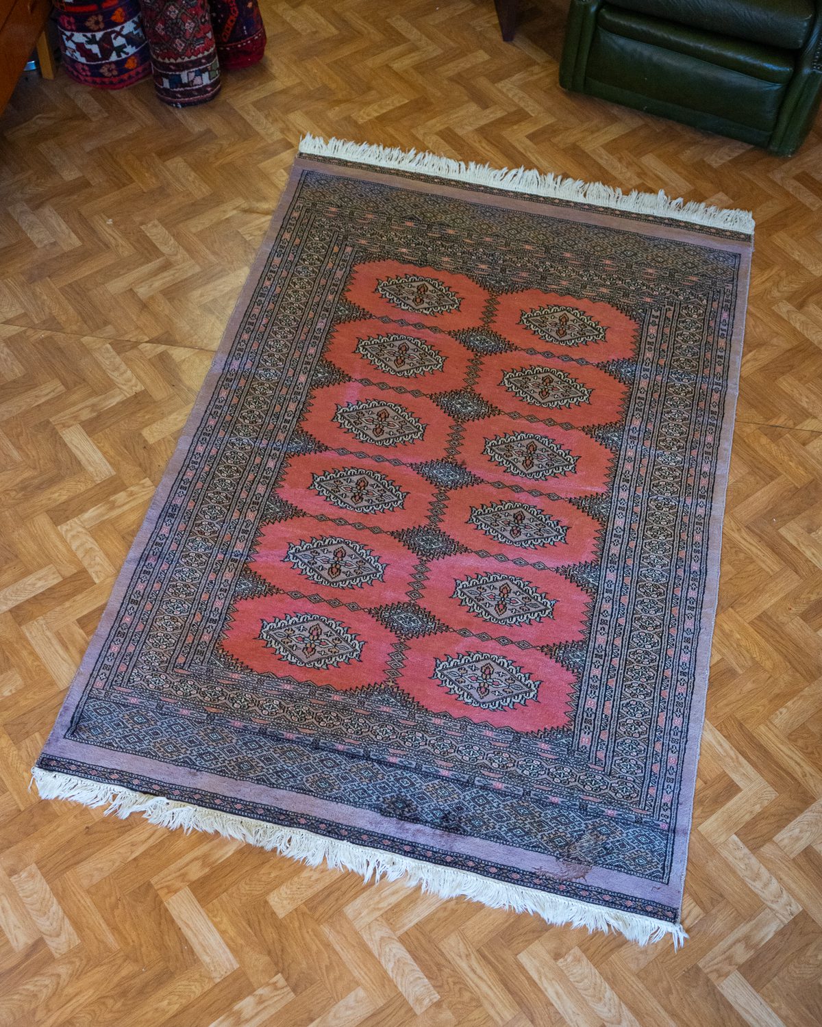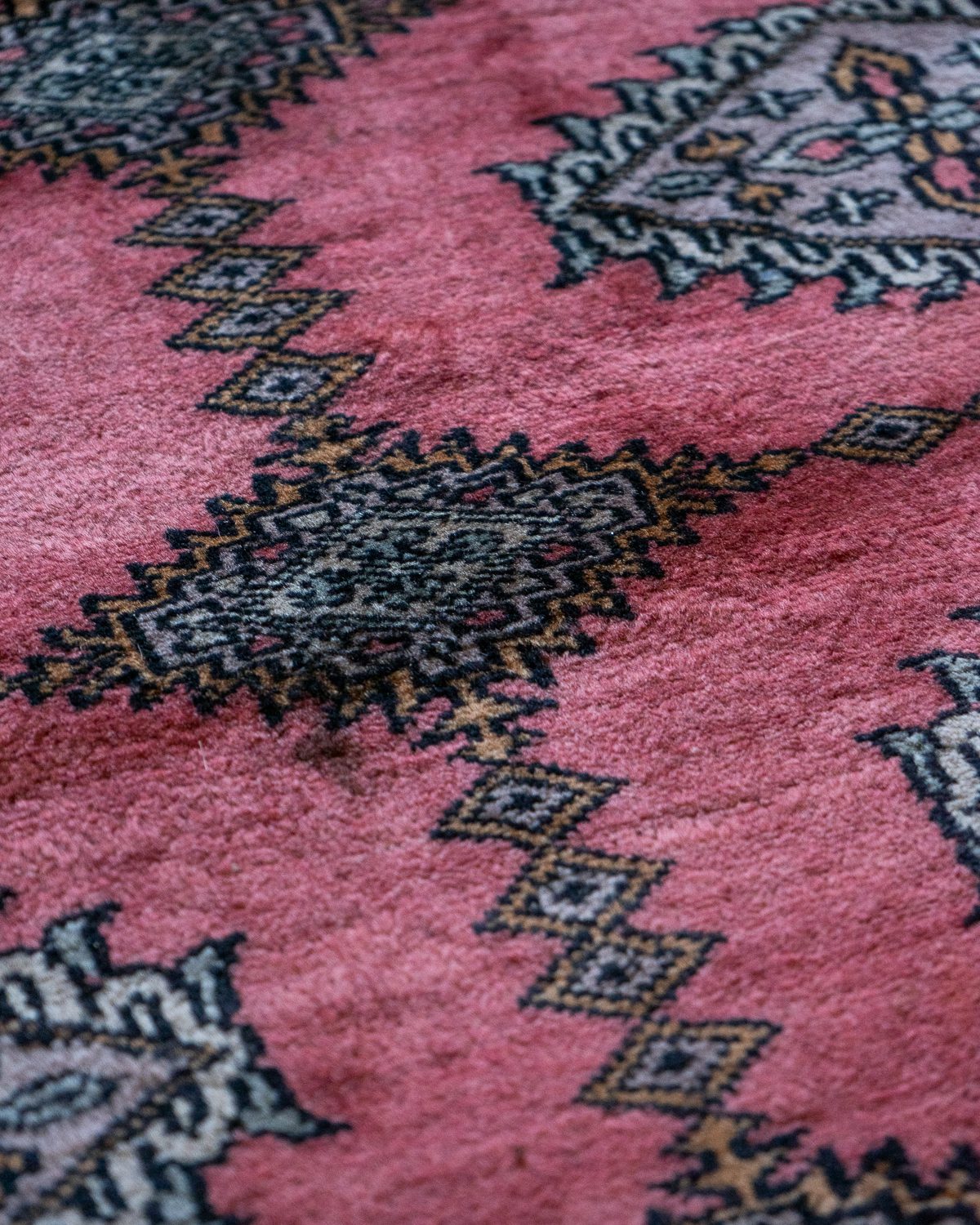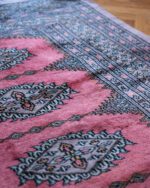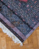 Mahedates roosades toonides ja õhukese karvaga Bokhara vaip. Vaibal on keskel üks väike plekk ja ühest servast osa karvu kadunud. Üldine seisukord on rahuldav.