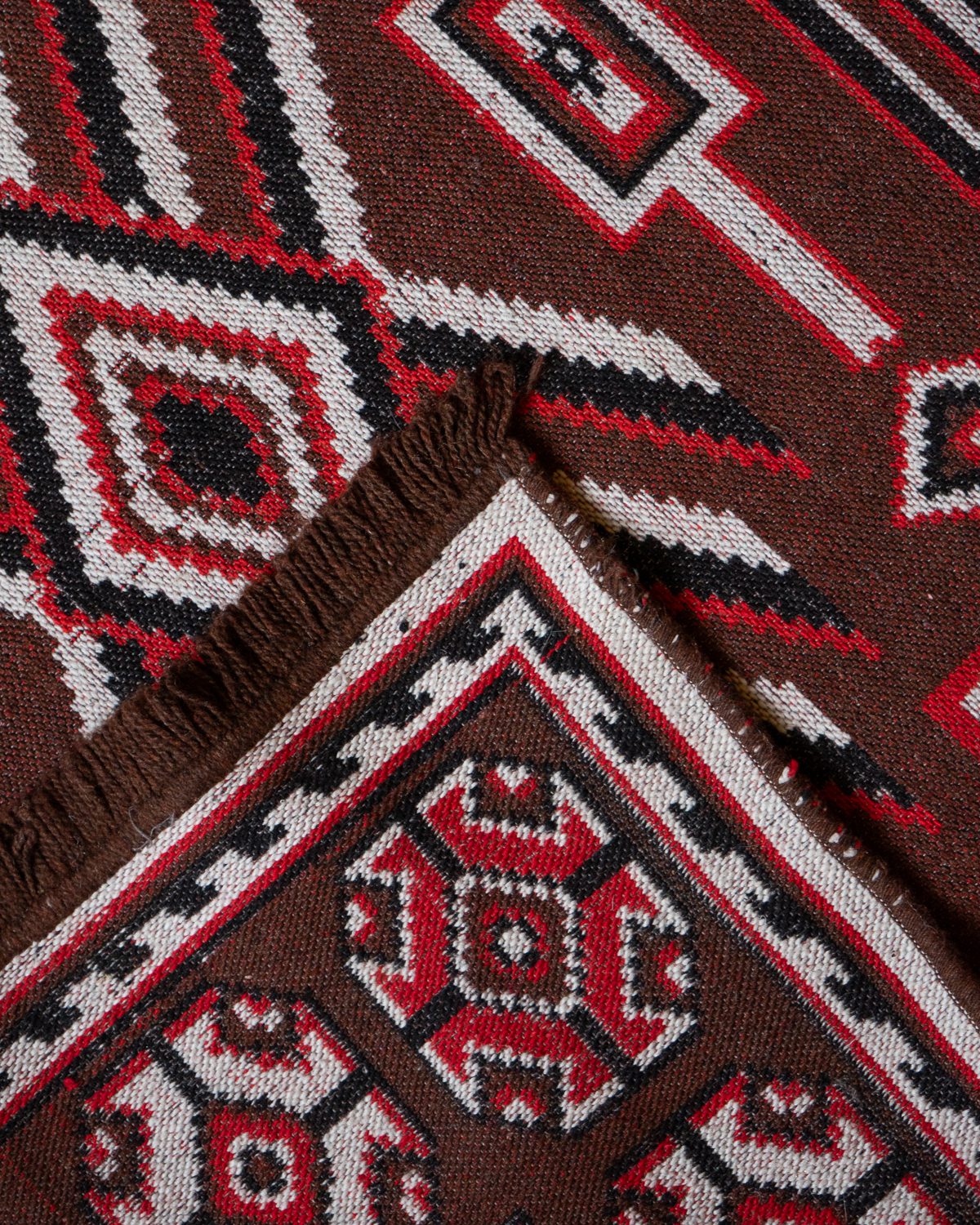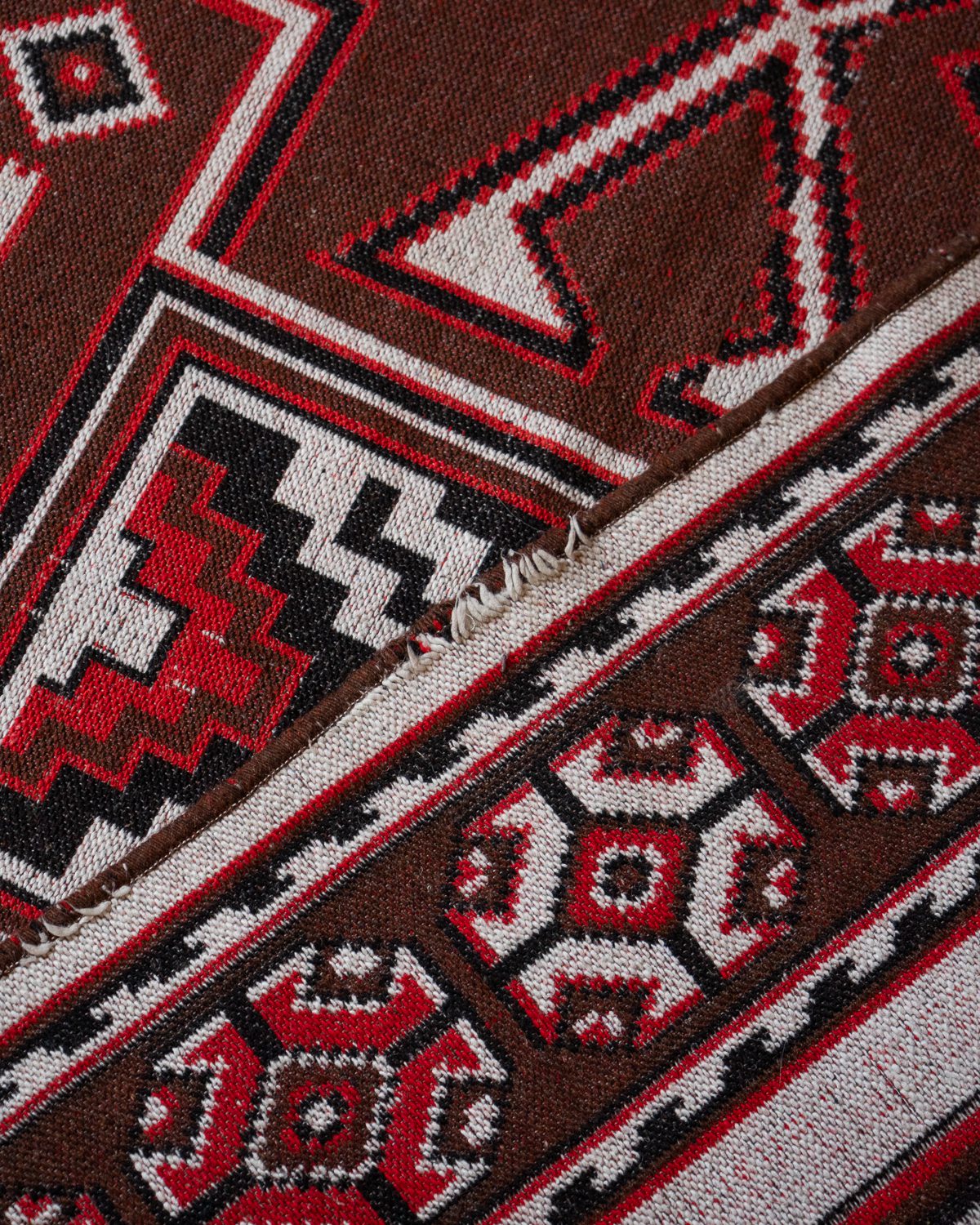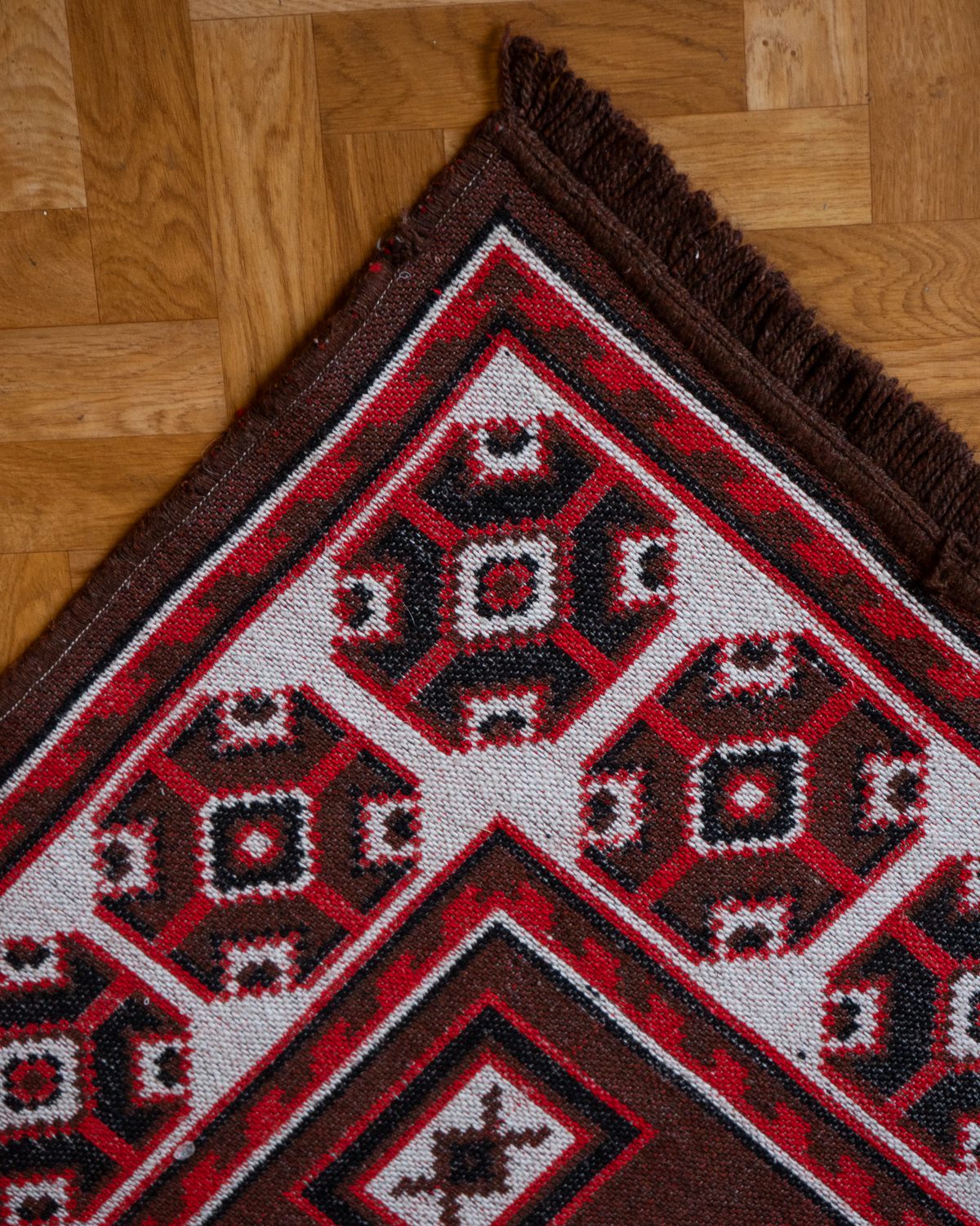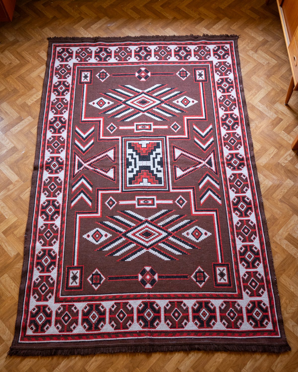 Navajo stiilis õhuke villane vaip. Äär on paarist kohast natukene lahti tulnud, kuid muidu korralik.